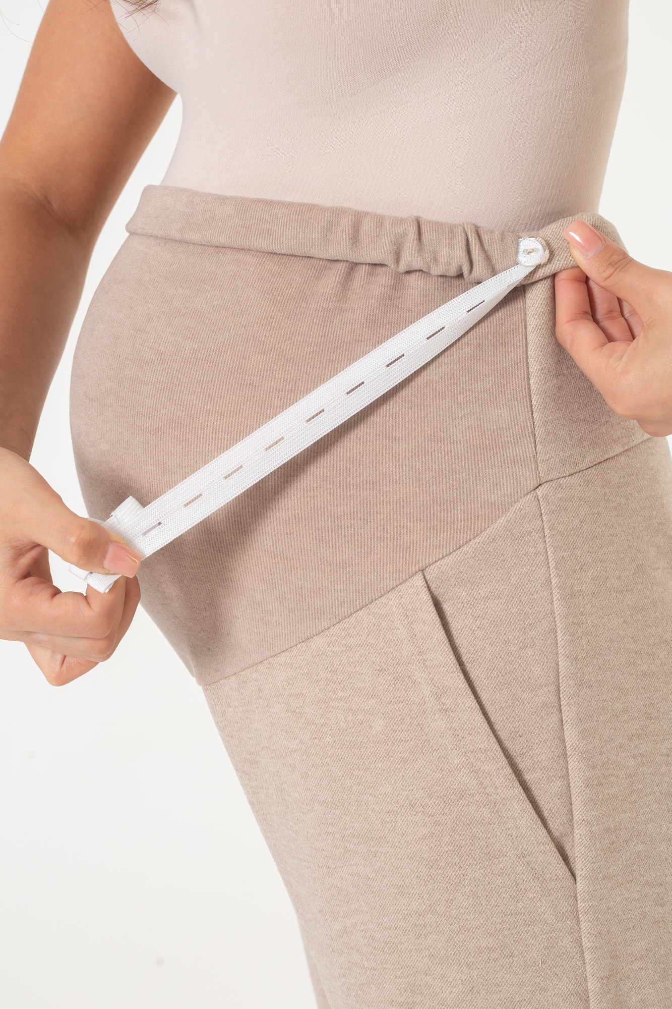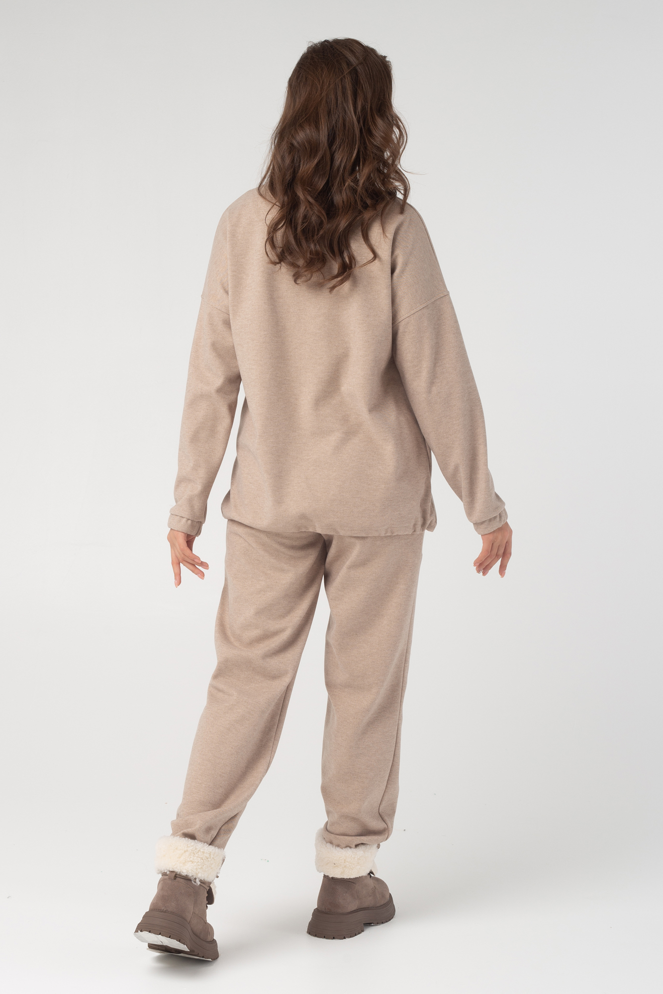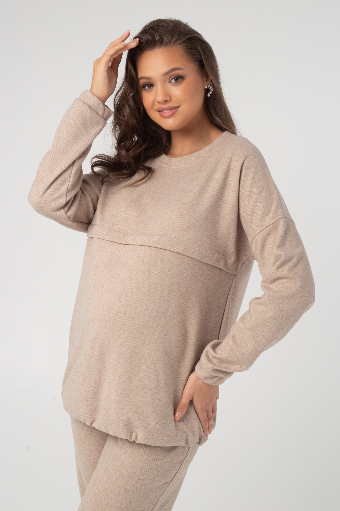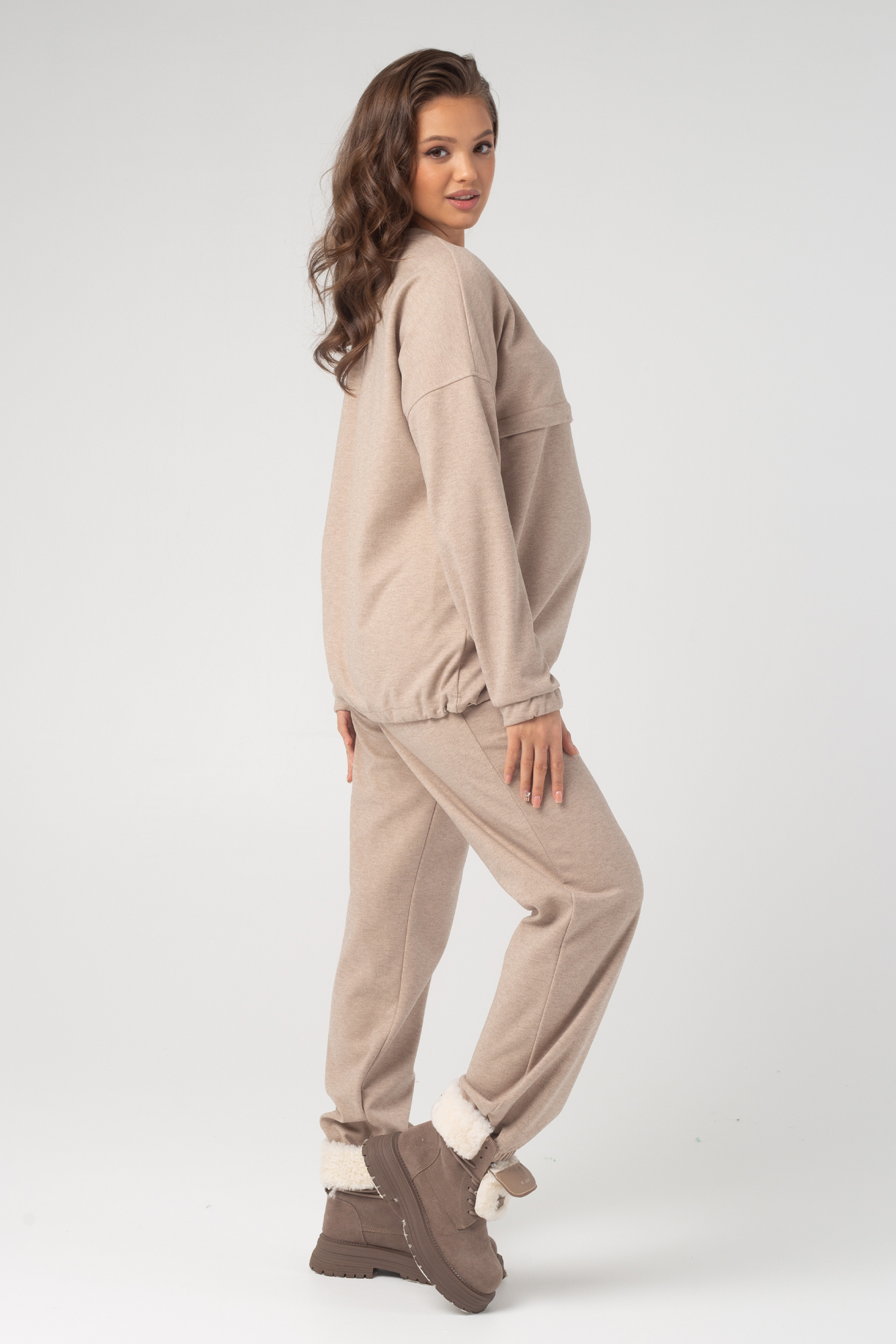 Костюм для беременных сшит из премиального плотного мягкого экокашемира. Ткань смотрится стильно, хорошо удерживает тепло и не вызывает раздражения. Брюки джоггеры оснащены высокой эластичной вставкой для живота с возможностью регулировки объема (за счет резинки на пуговице). Свитшот со спущенной линией плеча и рукавами с манжетами на резинке имеет свободный прямой крой. Низ джемпера на утяжках. Потайная горизонтальная молния рассчитана на комфортное кормление малыша. Стильный трикотажный костюм подходит для носки на любом месяце беременности и после родов. Костюм из трикотажа идеальный вариант повседневного образа для будущей мамы на прохладную осень.