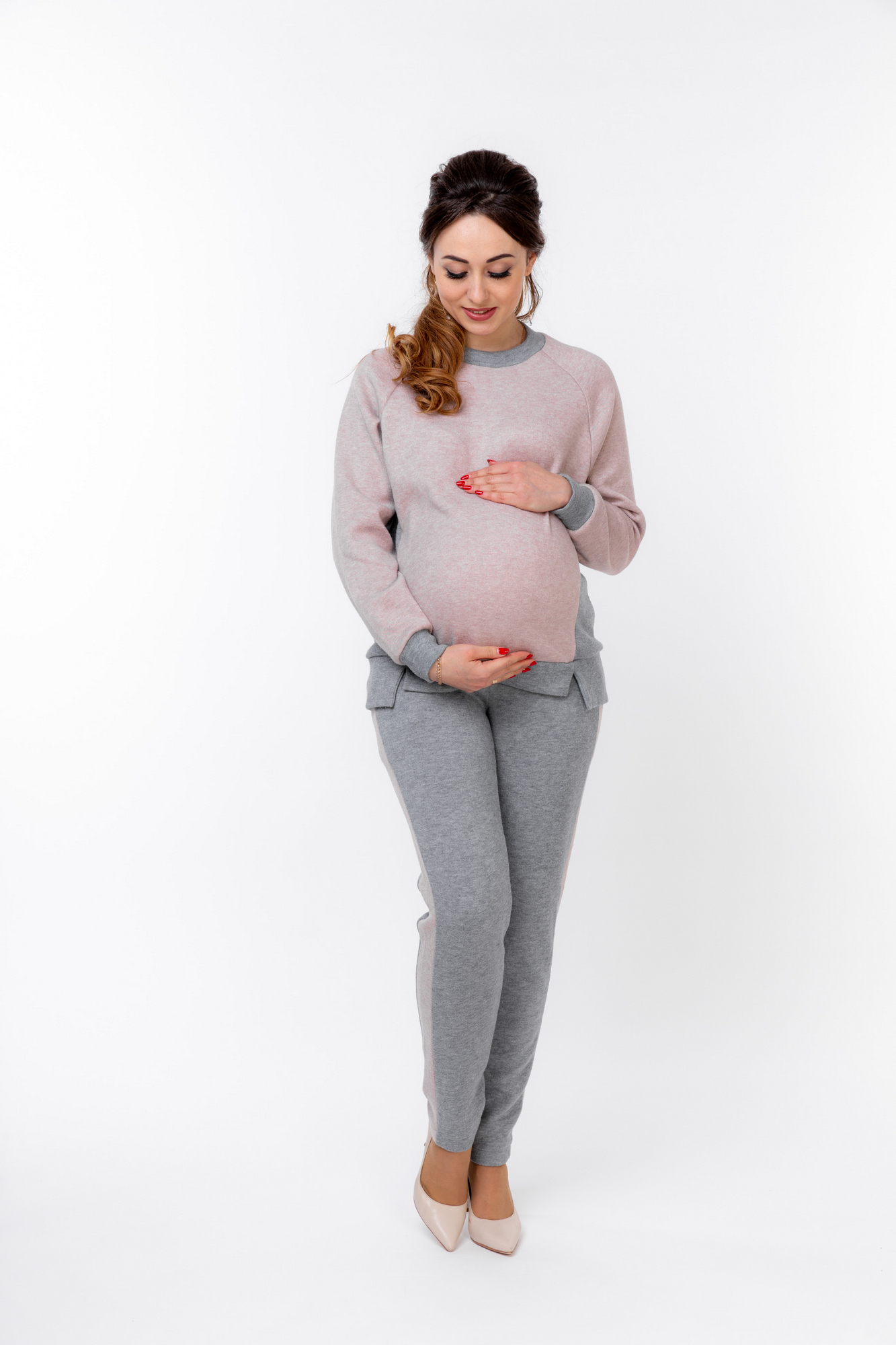 Теплый трикотажный костюм для будущих мам. Выполнен из мягких комбинированных тканей. Специальный крой позволяет носить костюм на любом сроке беременности и после нее. Брюки с эластичным поясом рассчитаны на растущий животик, не сдавливают и поддерживают. Уютный и комфортный костюм на каждый день.