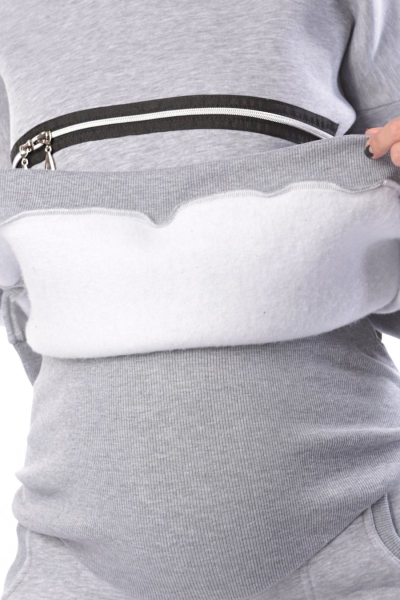 Теплый костюм для беременных из хлопкового футера с мягким начесом. В комплекте брюки и свитшот с секретом для кормления, выполненного в виде встречных молний, что является дополнительным модным украшением. На рукавах и штанинах манжеты, в брюках есть карманы.