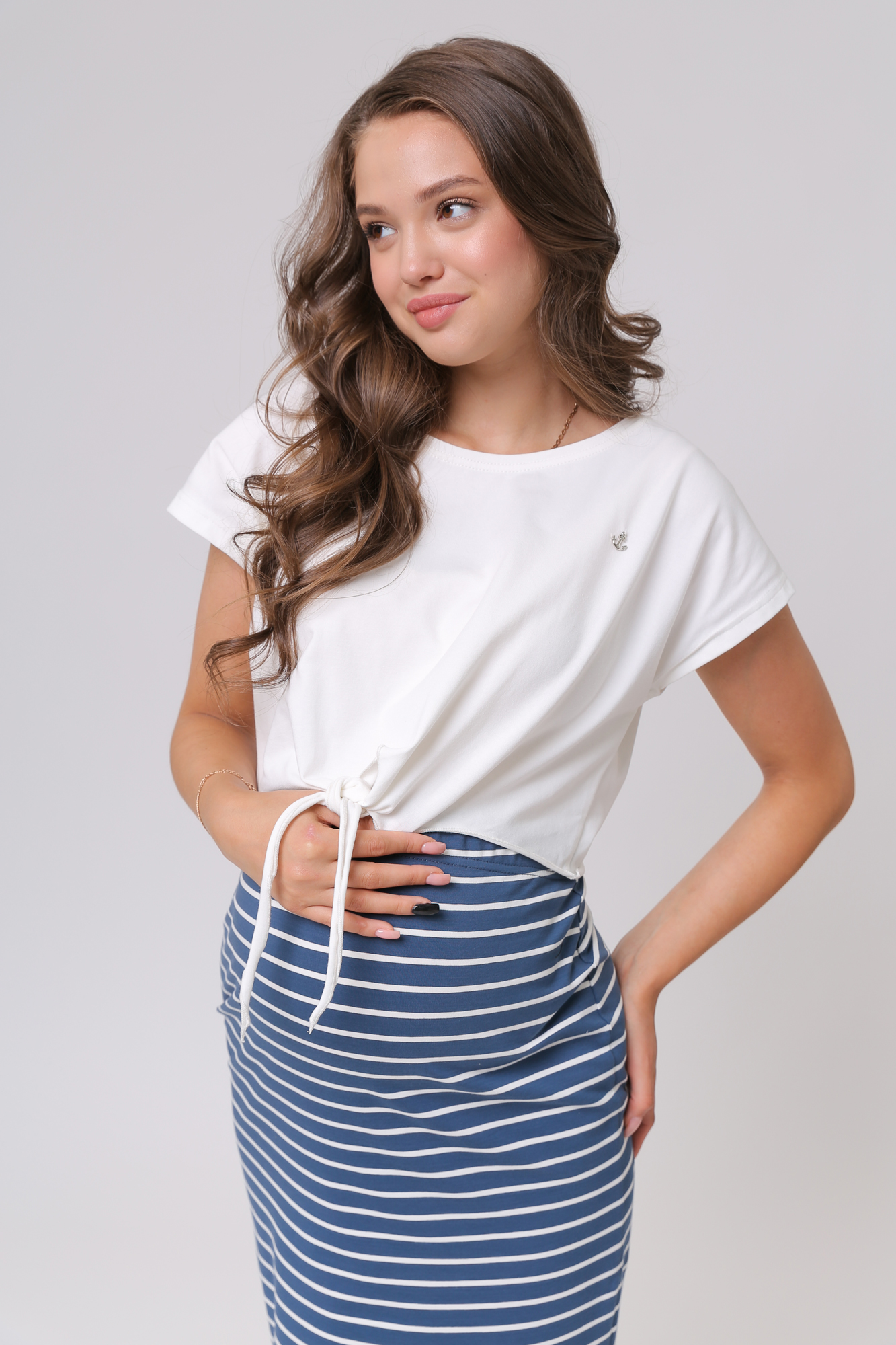 Стильный комплект для беременных состоит из футболки и трикотажной юбки. Футболка-топ с завязками выполнена из хлопка с добавлением эластана. С ним не нарушается кожное дыхание, легко происходит впитывание и испарение влаги. В такой одежде вы будете чувствовать себя комфортно и легко. Особый крой позволяет носить изделие на всем протяжении беременности. Эластичная юбка с завышенной талией мягко облегает и не сдавливает живот. Разрезы по бокам изделия обеспечат свободу движений. Футболку и юбку можно носить как вместе, так и сочетать с другими элементами гардероба.