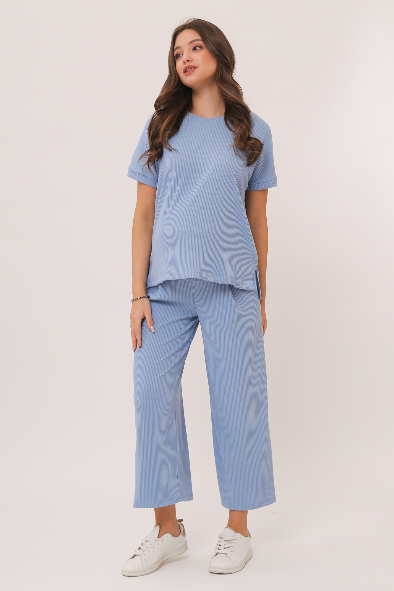 Оригинальный костюм для беременных в рубчик. Костюм состоит из джемпера и брюк. Джемпер с округлым вырезом горловины, коротким рукавом, заниженной линией плеча, разрезами по бокам изделия. Брюки-кюлоты с эластичной высокой вставкой-бандажом рассчитаны на весь период беременности. Идеальное сочетание стиля и комфорта!