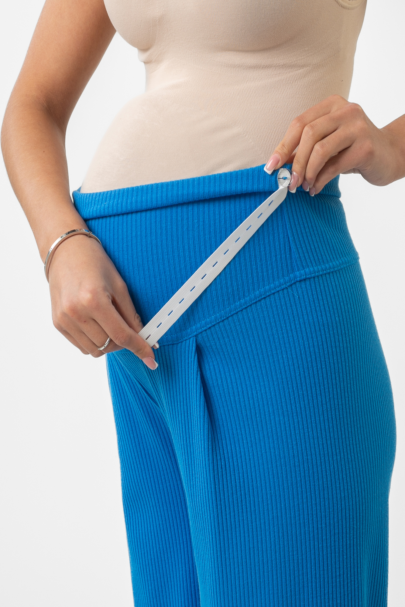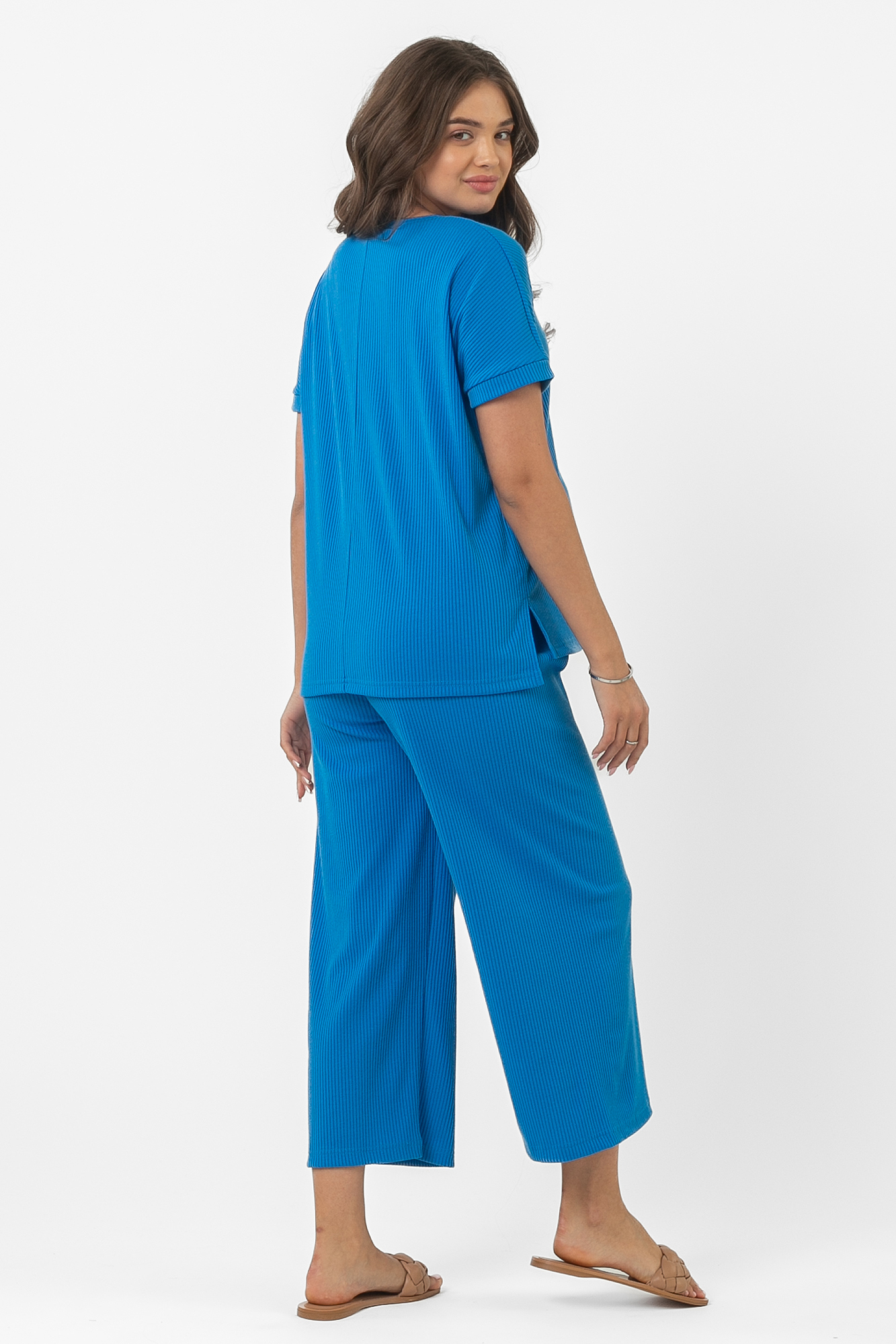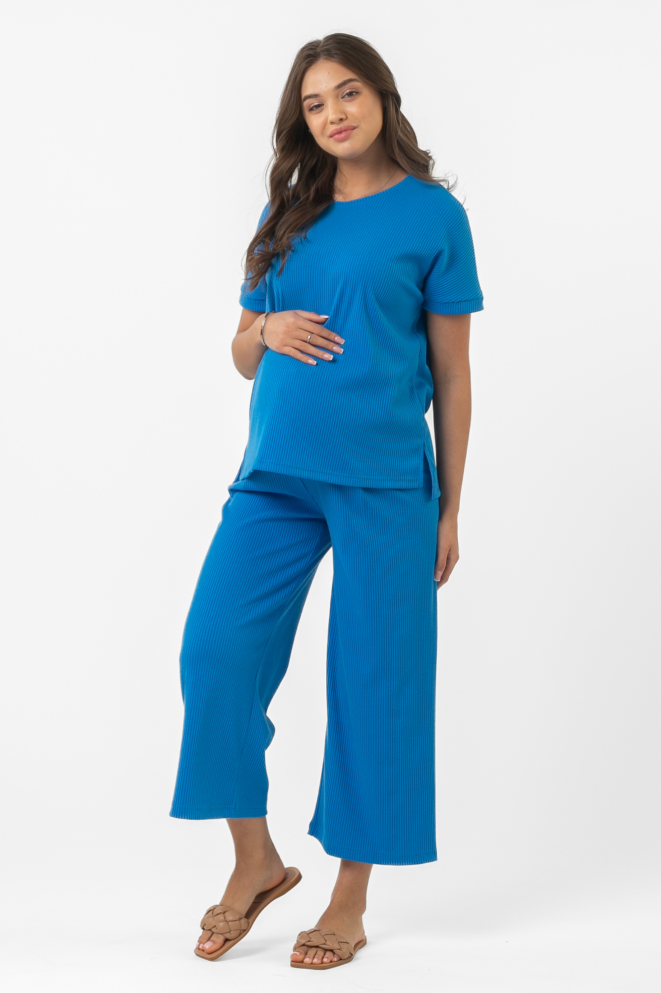 Оригинальный костюм для беременных в рубчик. Костюм состоит из джемпера и брюк. Джемпер с округлым вырезом горловины, коротким рукавом, заниженной линией плеча, разрезами по бокам изделия. Брюки-кюлоты с эластичной высокой вставкой-бандажом рассчитаны на весь период беременности. Идеальное сочетание стиля и комфорта!