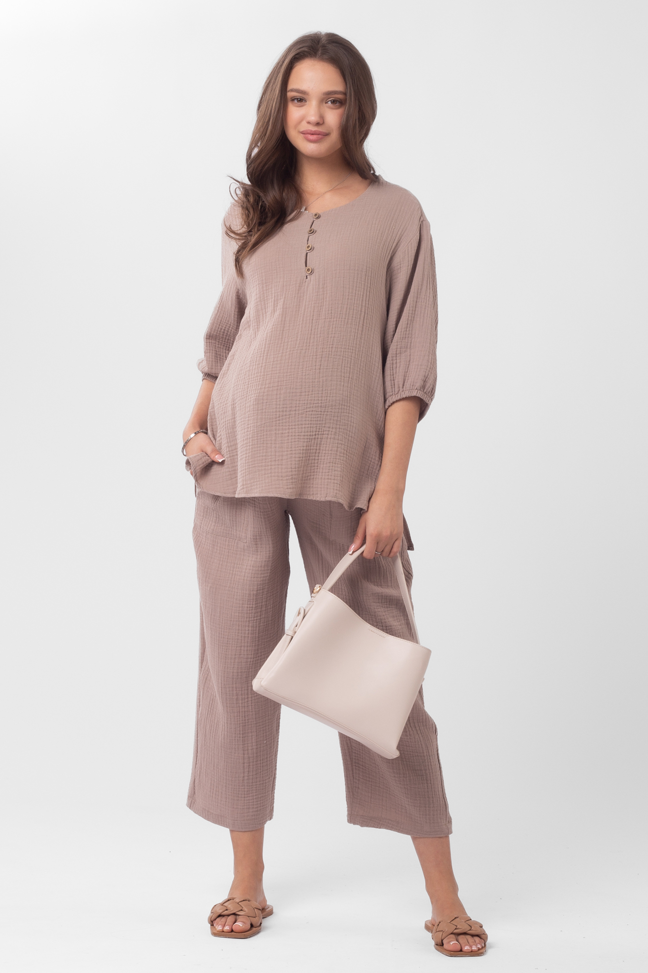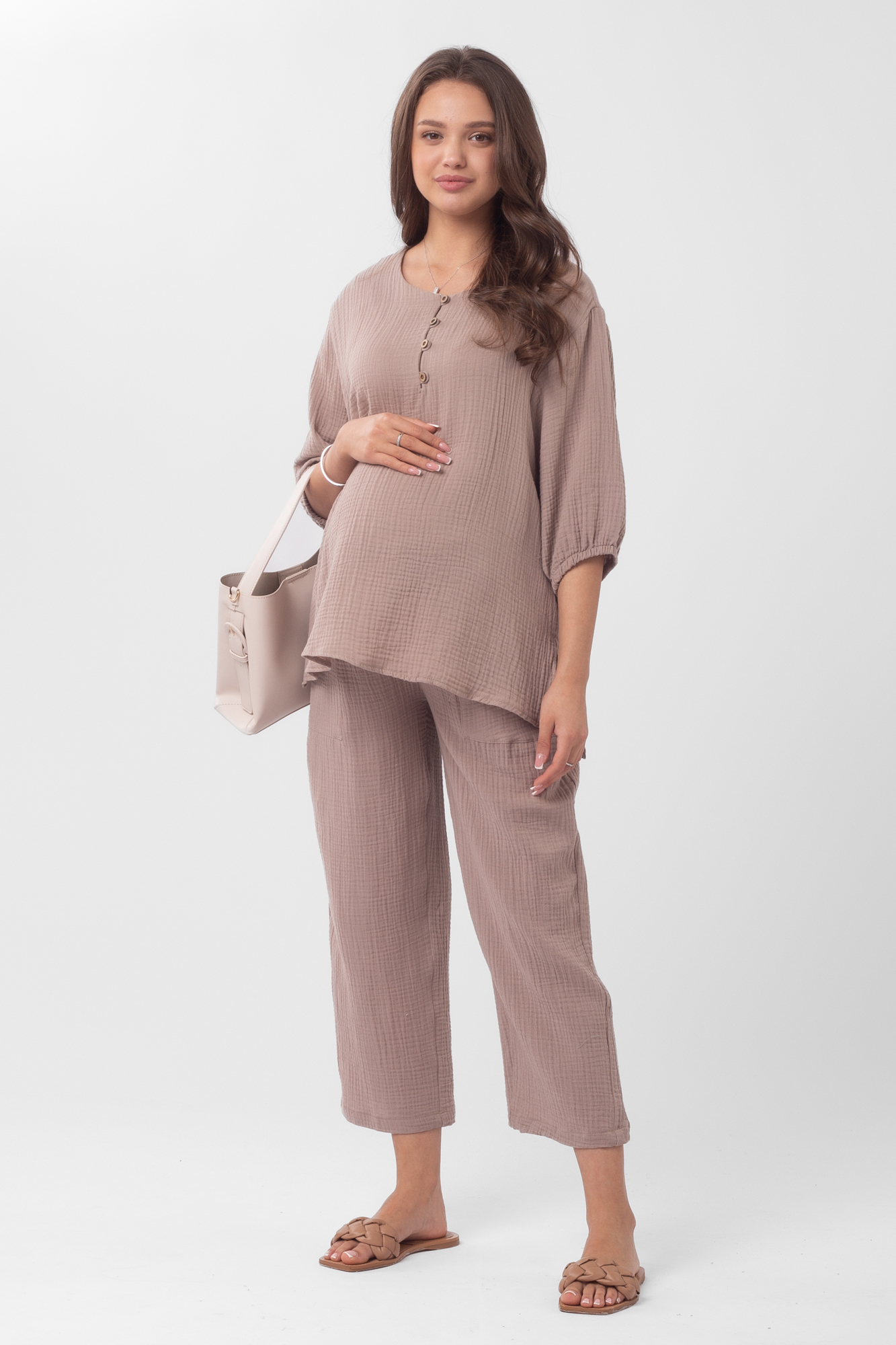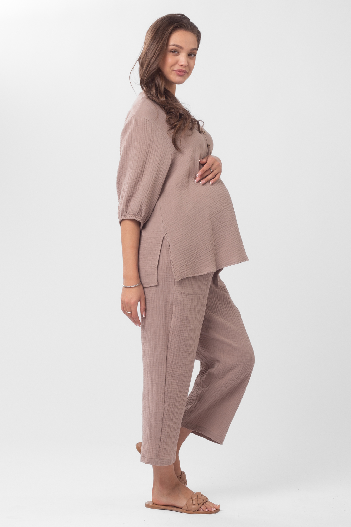 Стильный костюм для беременных из хлопокового муслина идеально подойдет на теплую весну и лето. Фактурная тканьна основе хлопка дышит, не раздражает кожу, легко впитывает влагу. В комплект входит две вещи: блузка с рукавом 3/4 на резинке и брюки кюлоты. Кофта с удлиненной спинкой, небольшими разрезами по бокам, круглой горловиной, украшена пугов. Штаны свободного кроя и укороченной длины оснащены низким поясом с мягкой резинкой и шнуровкой для регулировки объема. Легкий костюм можно носить на любом месяце беременности и после рождения малыша. Летний костюм с широкими укороченными брюками подойдет для повседневной носки, станет удобным нарядом для офиса, встречи с друзьями или на выписку. Костюм в духе oversize выполнен в стандартной размерной линейке и представлен в двух пастельных однотонных расцветках.