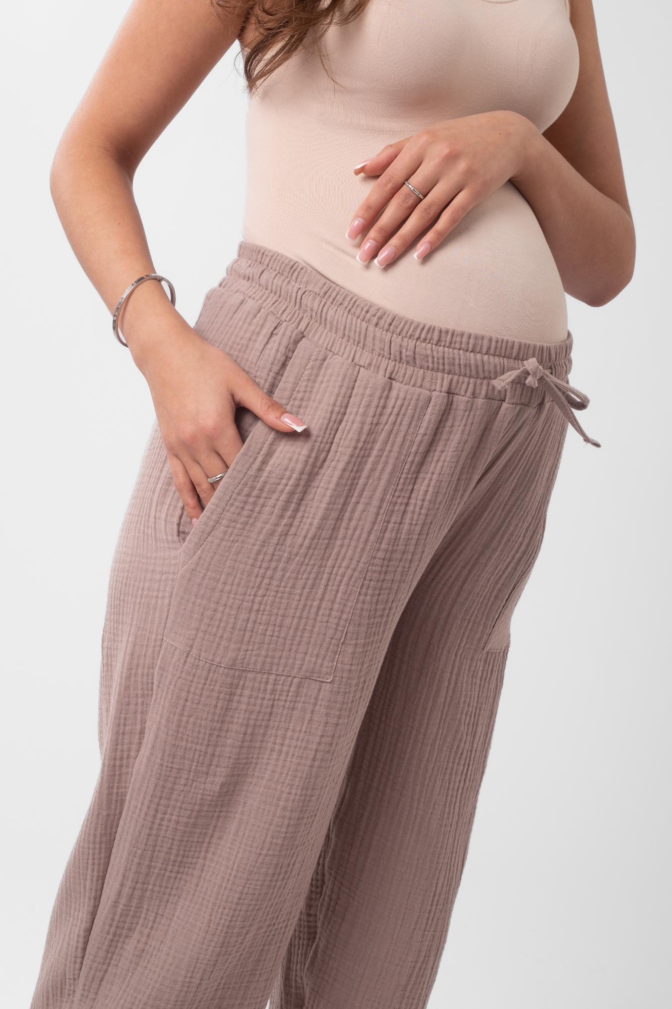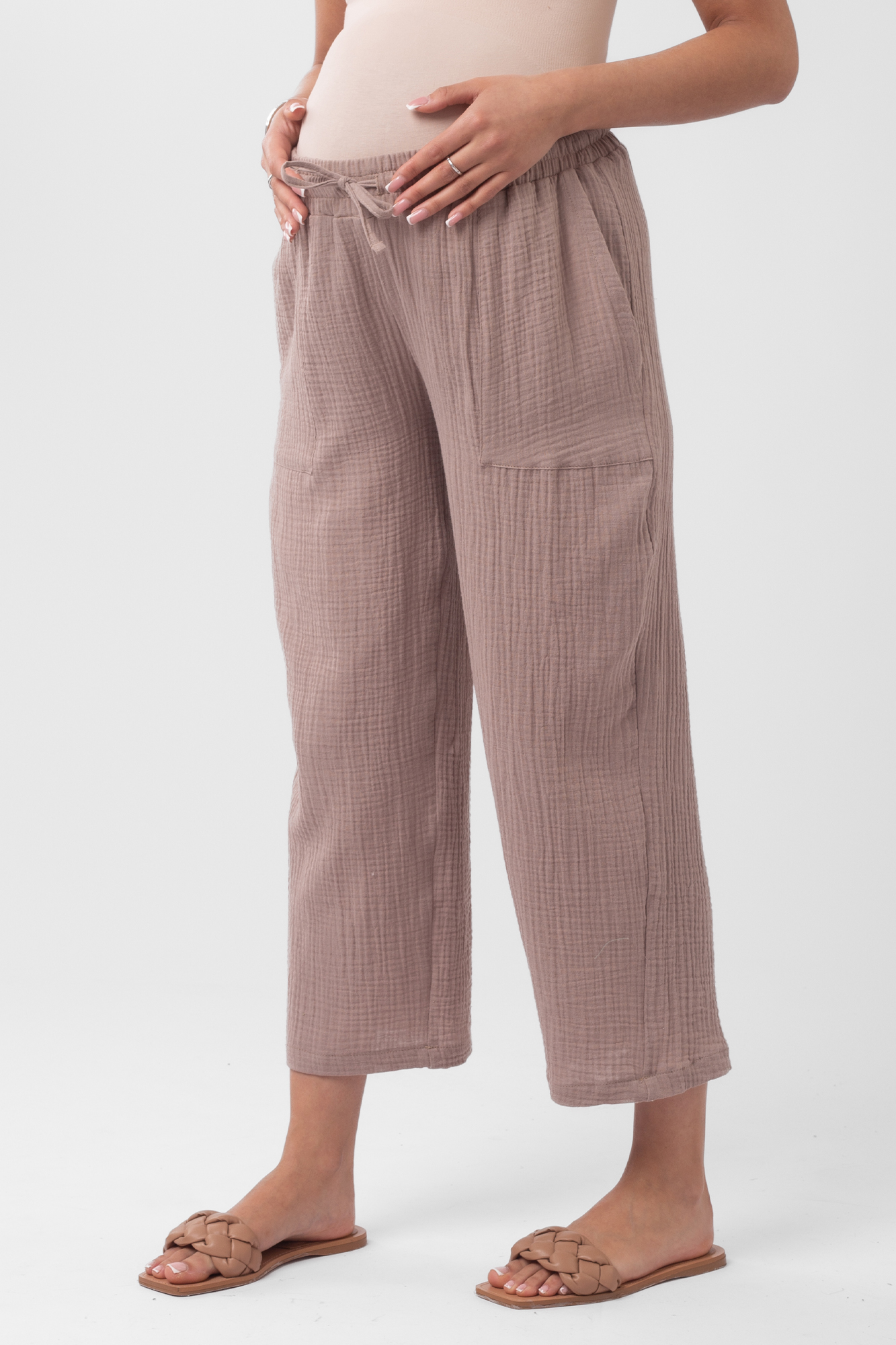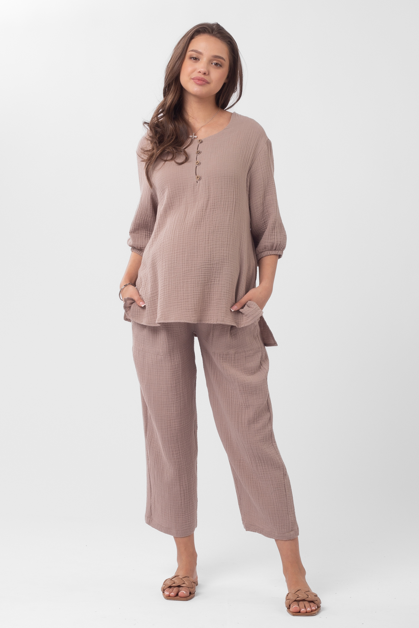 Стильный костюм для беременных из хлопокового муслина идеально подойдет на теплую весну и лето. Фактурная тканьна основе хлопка дышит, не раздражает кожу, легко впитывает влагу. В комплект входит две вещи: блузка с рукавом 3/4 на резинке и брюки кюлоты. Кофта с удлиненной спинкой, небольшими разрезами по бокам, круглой горловиной, украшена пугов. Штаны свободного кроя и укороченной длины оснащены низким поясом с мягкой резинкой и шнуровкой для регулировки объема. Легкий костюм можно носить на любом месяце беременности и после рождения малыша. Летний костюм с широкими укороченными брюками подойдет для повседневной носки, станет удобным нарядом для офиса, встречи с друзьями или на выписку. Костюм в духе oversize выполнен в стандартной размерной линейке и представлен в двух пастельных однотонных расцветках.