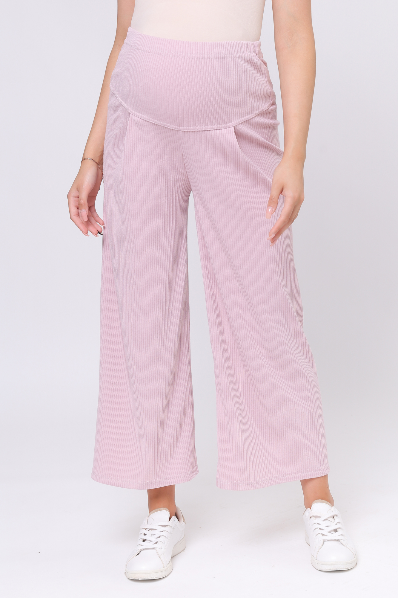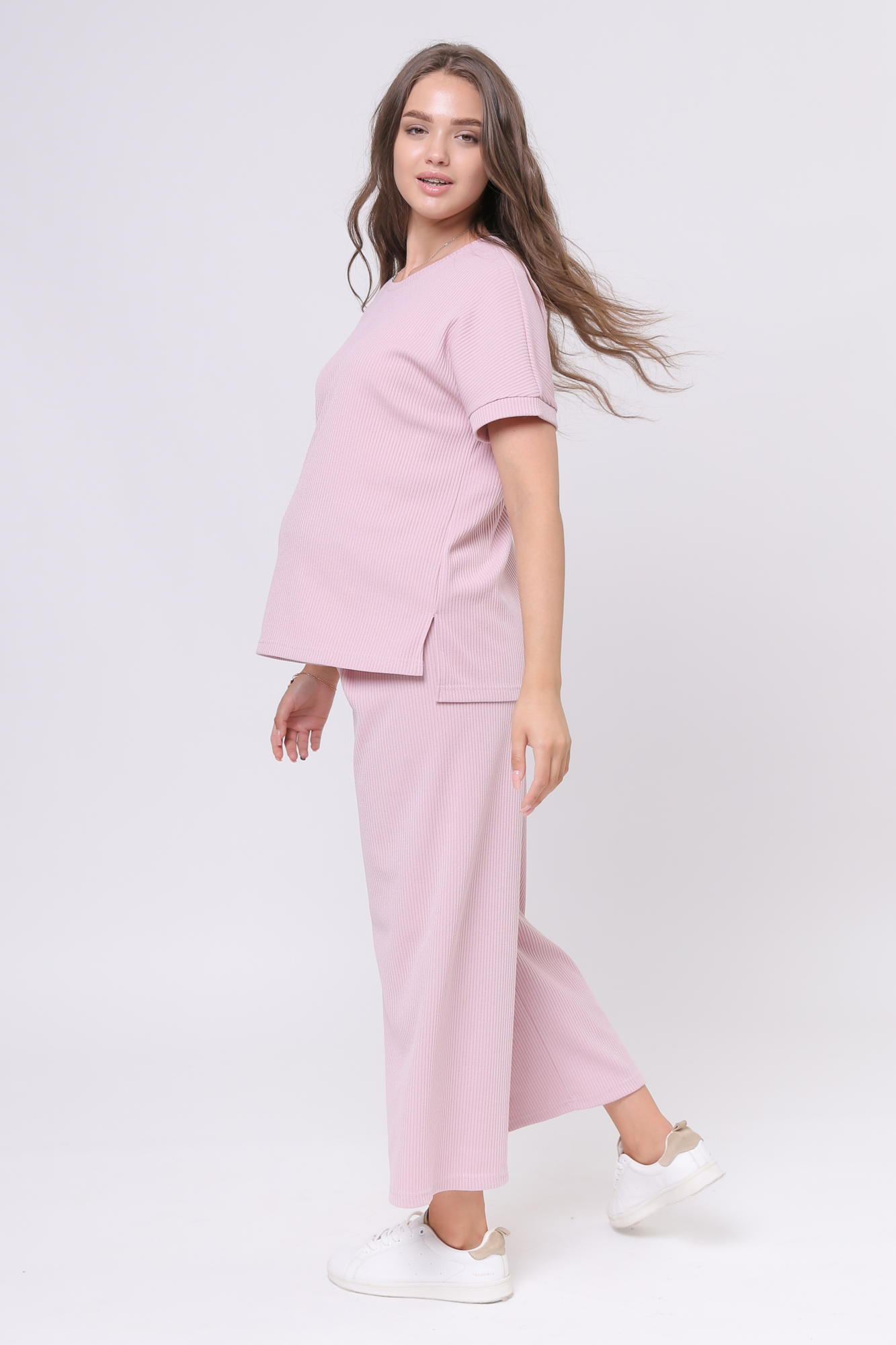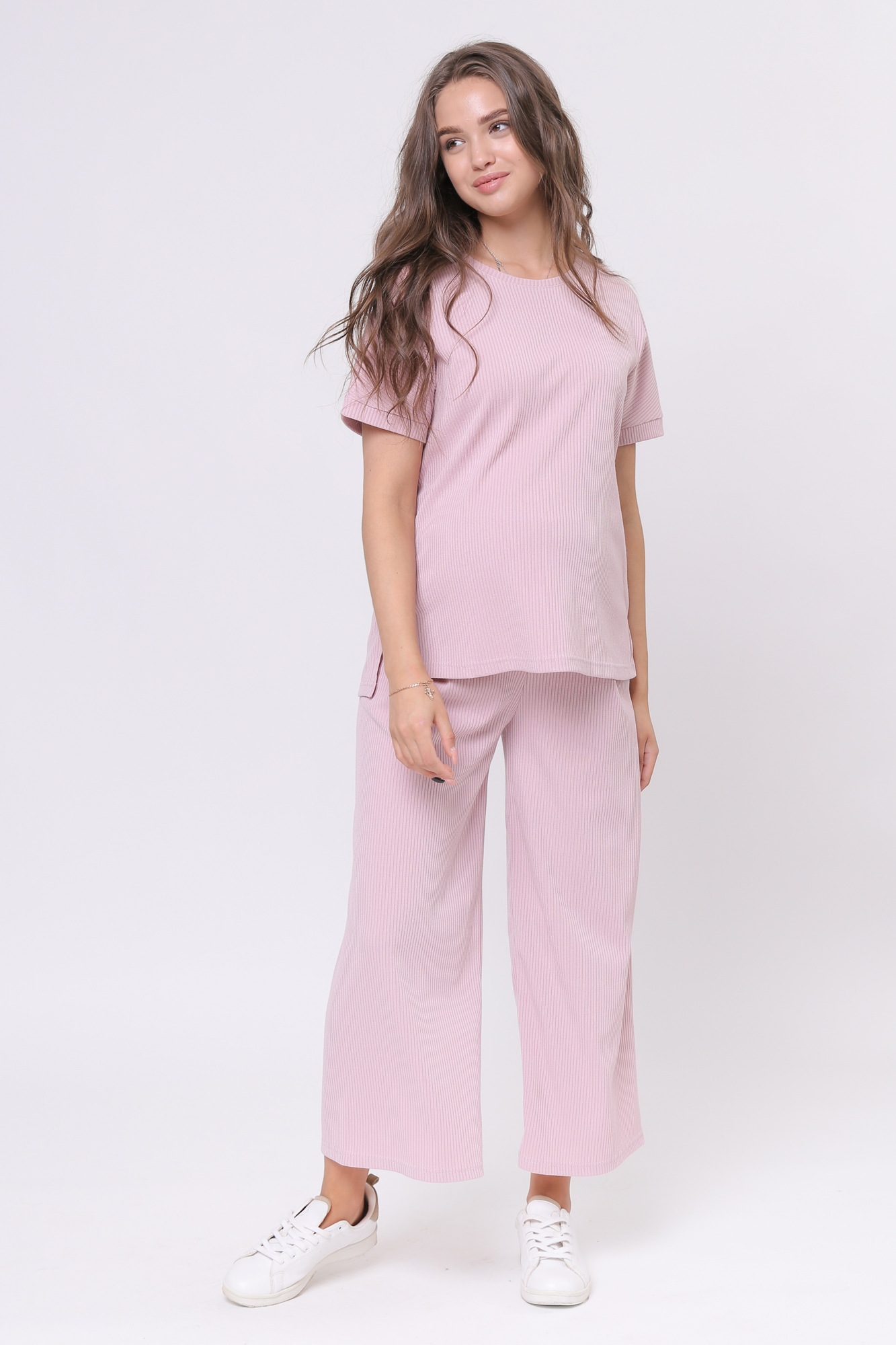 Оригинальный костюм для беременных в рубчик. Костюм состоит из джемпера и брюк. Джемпер с округлым вырезом горловины, коротким рукавом, заниженной линией плеча, разрезами по бокам изделия. Брюки-кюлоты с эластичной высокой вставкой-бандажом рассчитаны на весь период беременности. Идеальное сочетание стиля и комфорта!