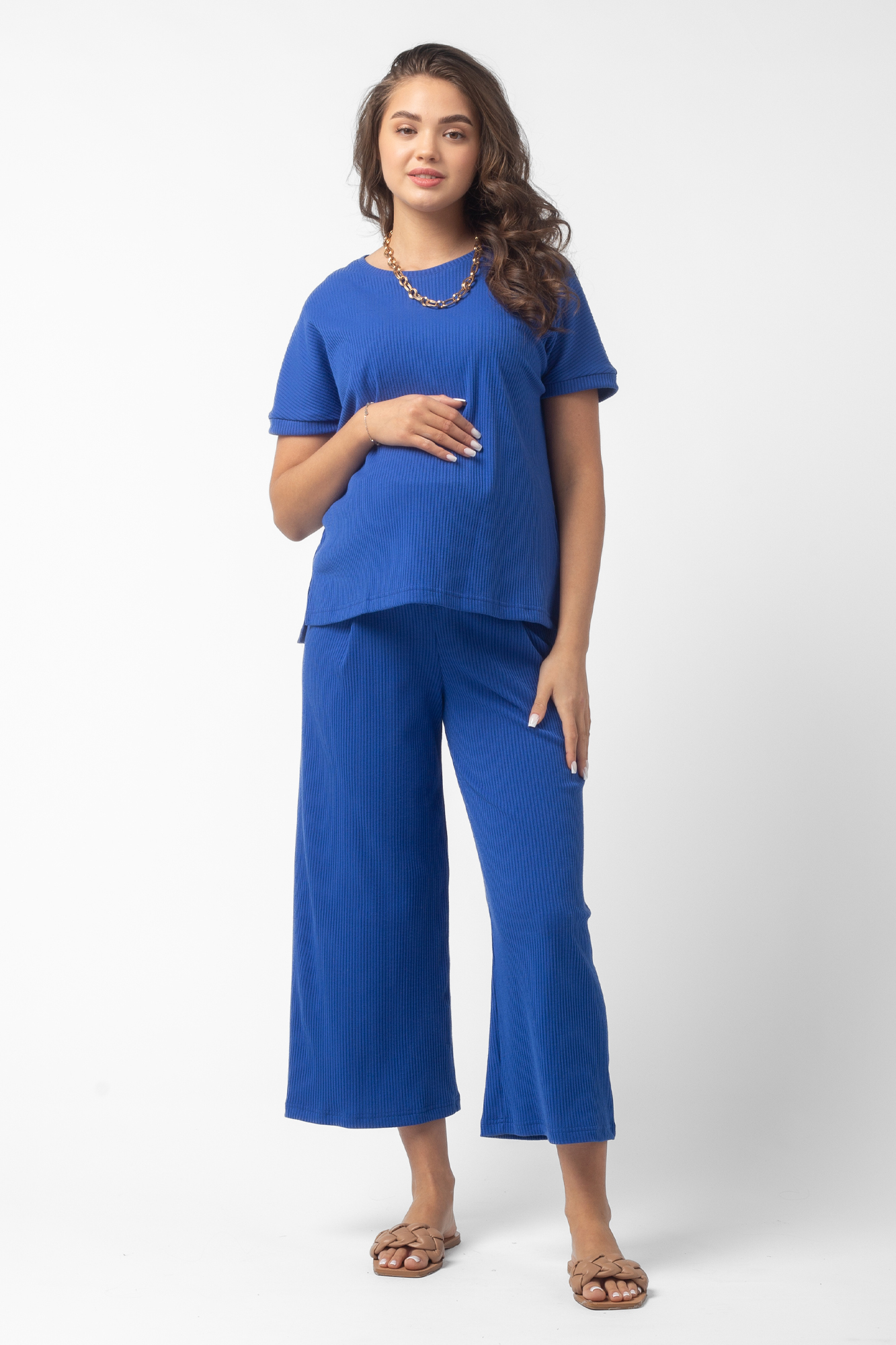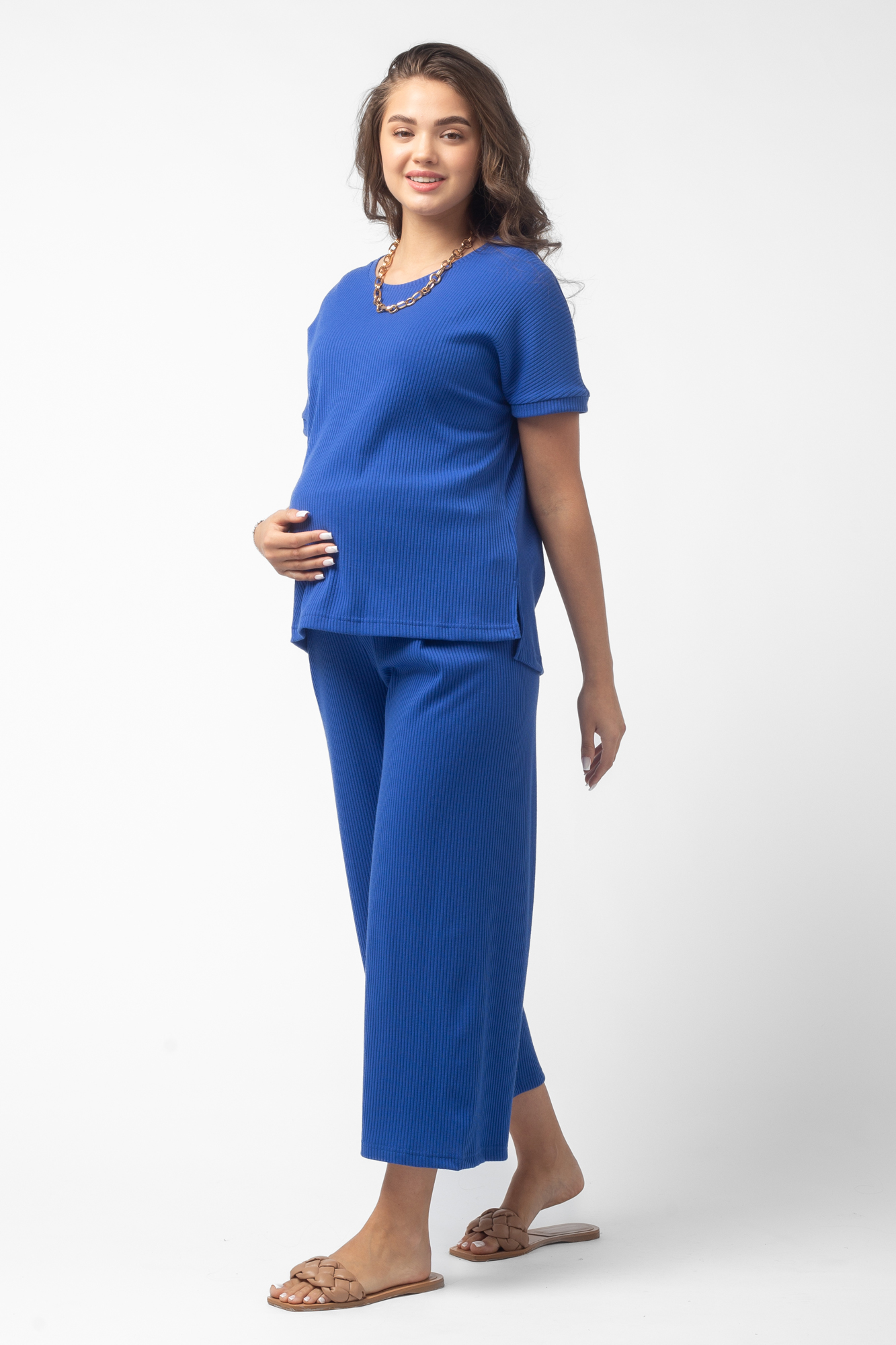 Оригинальный костюм для беременных в рубчик. Костюм состоит из джемпера и брюк. Джемпер с округлым вырезом горловины, коротким рукавом, заниженной линией плеча, разрезами по бокам изделия. Брюки-кюлоты с эластичной высокой вставкой-бандажом рассчитаны на весь период беременности. Идеальное сочетание стиля и комфорта!