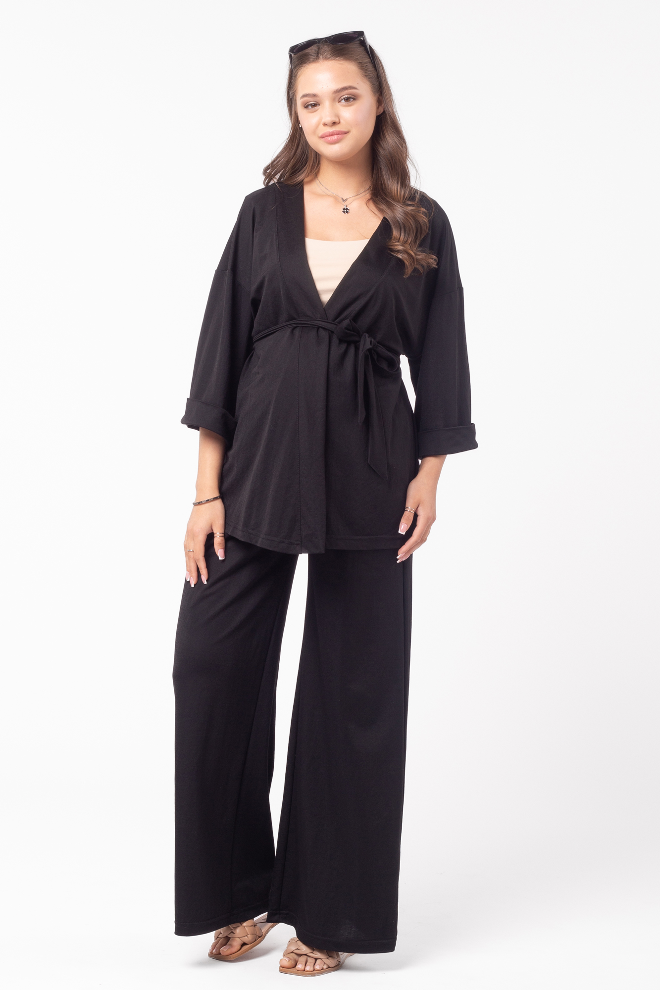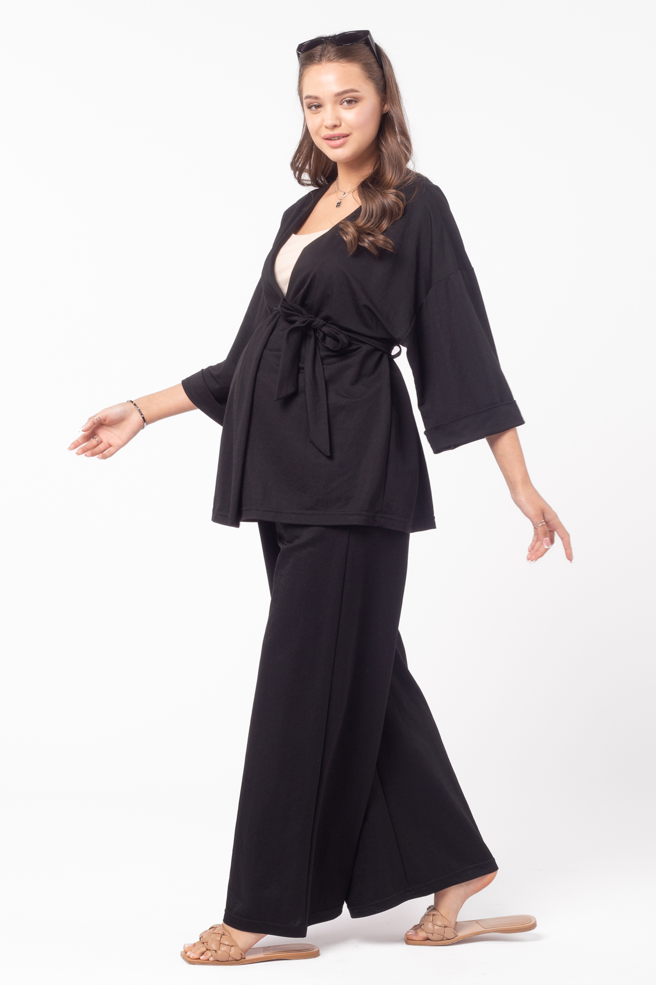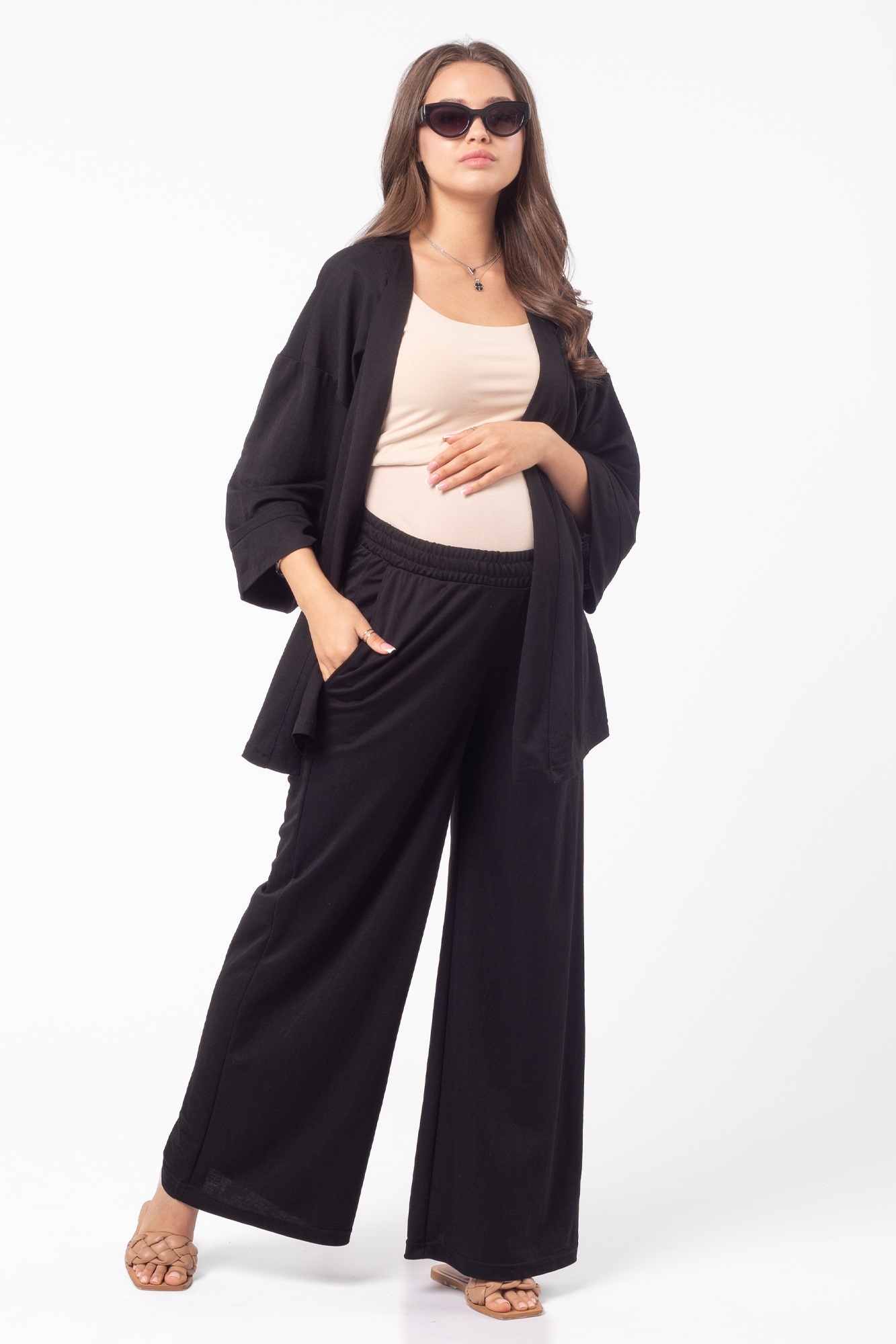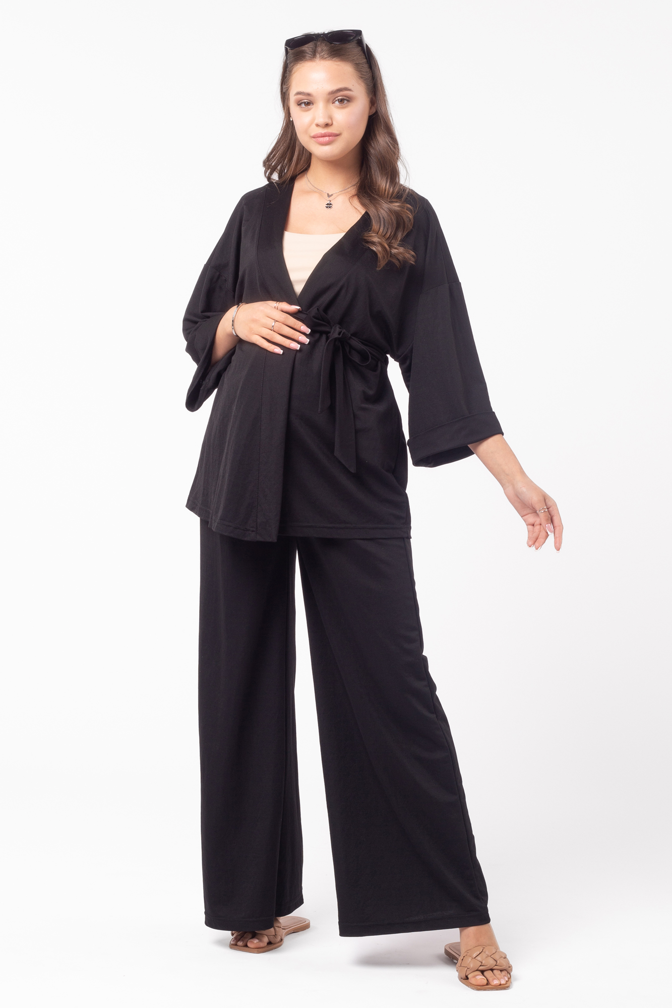 Летний костюм кимоно для беременных выполнен из легкой ткани. Комплект состоит из двух изделий: брюки и накидка. Широкие брюки имеют свободный крой, что позволяет чувствовать себя комфортно в теплую погоду. Верх костюма имеет свободный фасон, талия фиксируется поясом, что позволяет носить костюм на протяжении всей беременности. Летний брючный костюм для беременных прекрасно подойдет для прогулок, для дома и просто на каждый день. Костюм для беременных сочетается с туфлями, босоножками, кроссовками или шлепками.