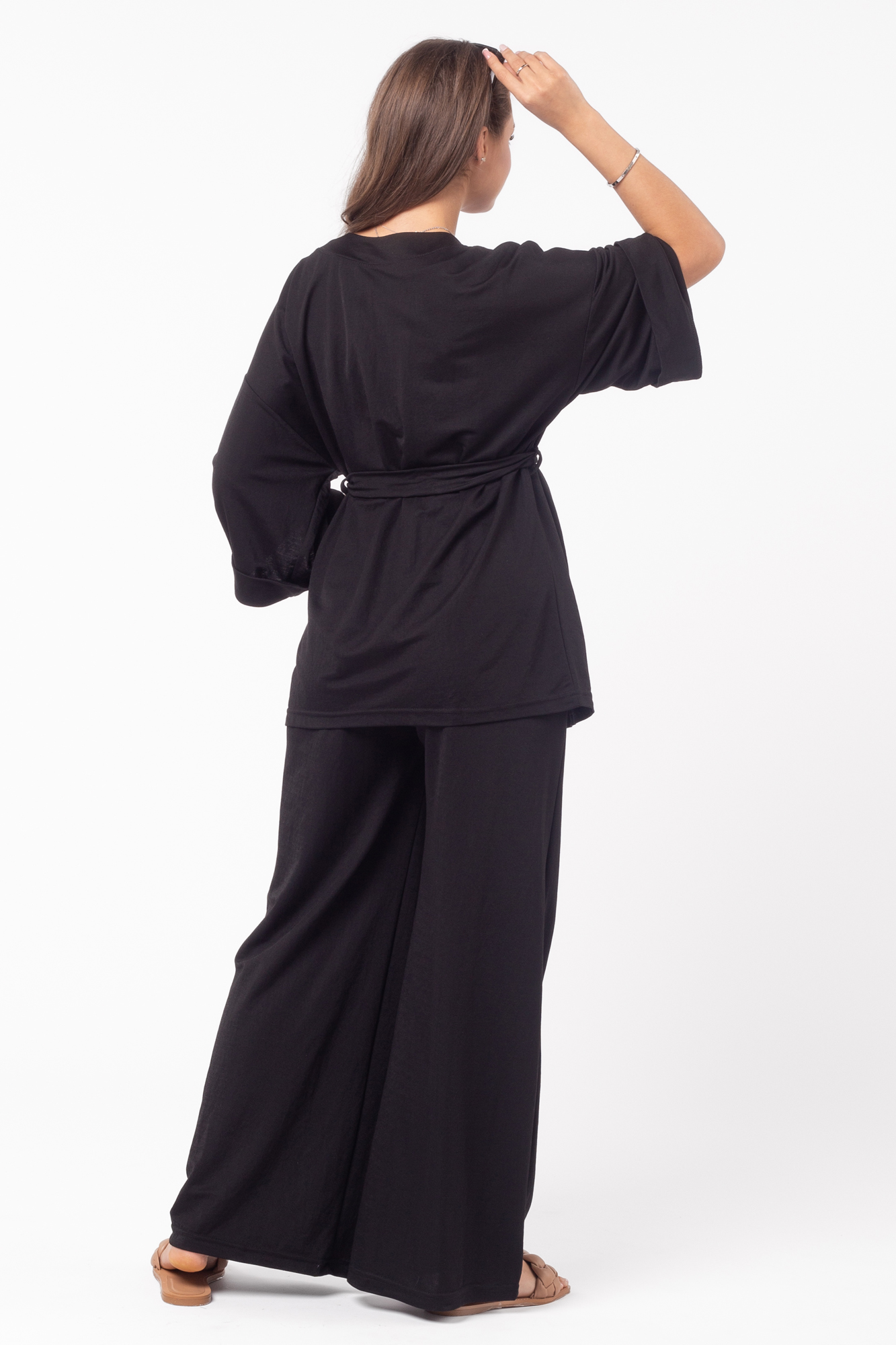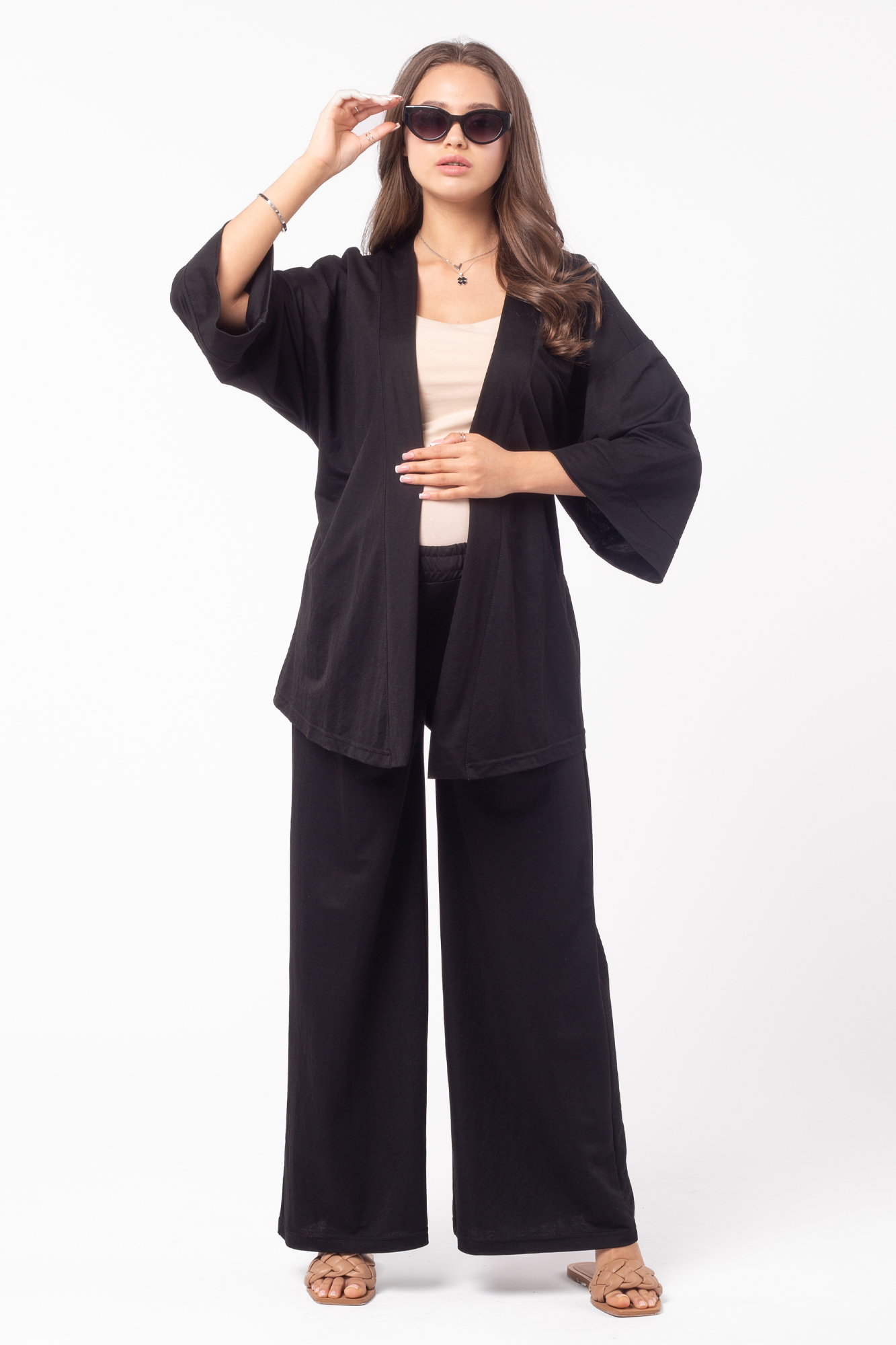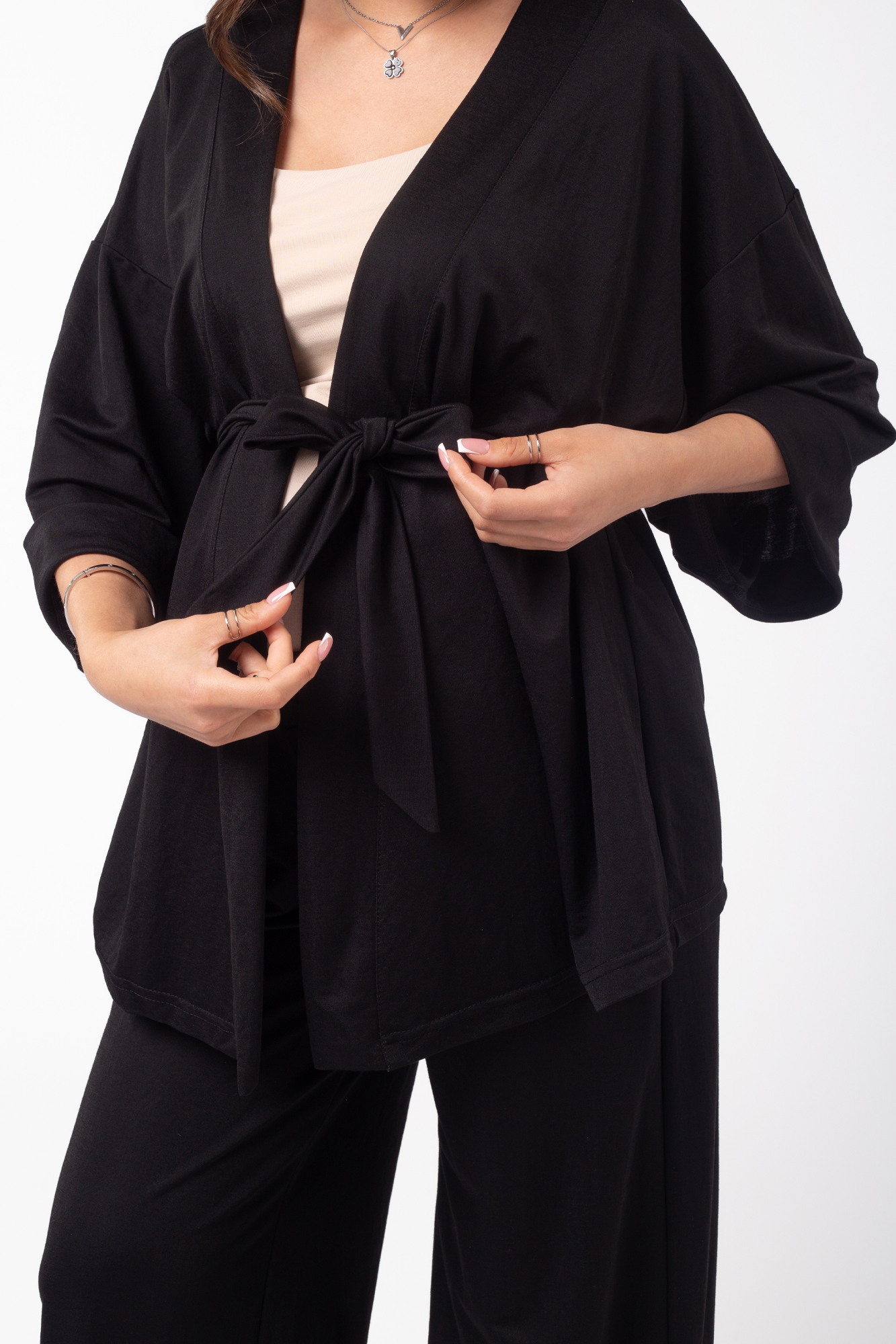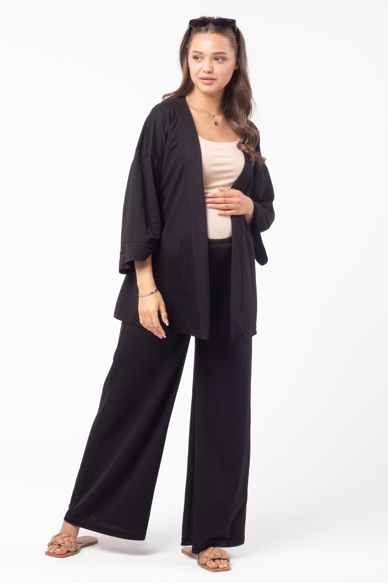 Летний костюм кимоно для беременных выполнен из легкой ткани. Комплект состоит из двух изделий: брюки и накидка. Широкие брюки имеют свободный крой, что позволяет чувствовать себя комфортно в теплую погоду. Верх костюма имеет свободный фасон, талия фиксируется поясом, что позволяет носить костюм на протяжении всей беременности. Летний брючный костюм для беременных прекрасно подойдет для прогулок, для дома и просто на каждый день. Костюм для беременных сочетается с туфлями, босоножками, кроссовками или шлепками.