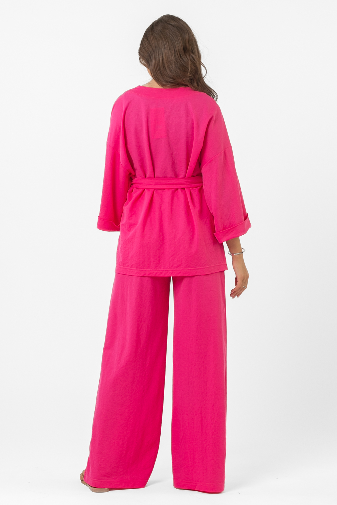 Летний костюм кимоно для беременных выполнен из легкой ткани. Комплект состоит из двух изделий: брюки и накидка. Широкие брюки имеют свободный крой, что позволяет чувствовать себя комфортно в теплую погоду. Верх костюма имеет свободный фасон, талия фиксируется поясом, что позволяет носить костюм на протяжении всей беременности. Летний брючный костюм для беременных прекрасно подойдет для прогулок, для дома и просто на каждый день. Костюм для беременных сочетается с туфлями, босоножками, кроссовками или шлепками.