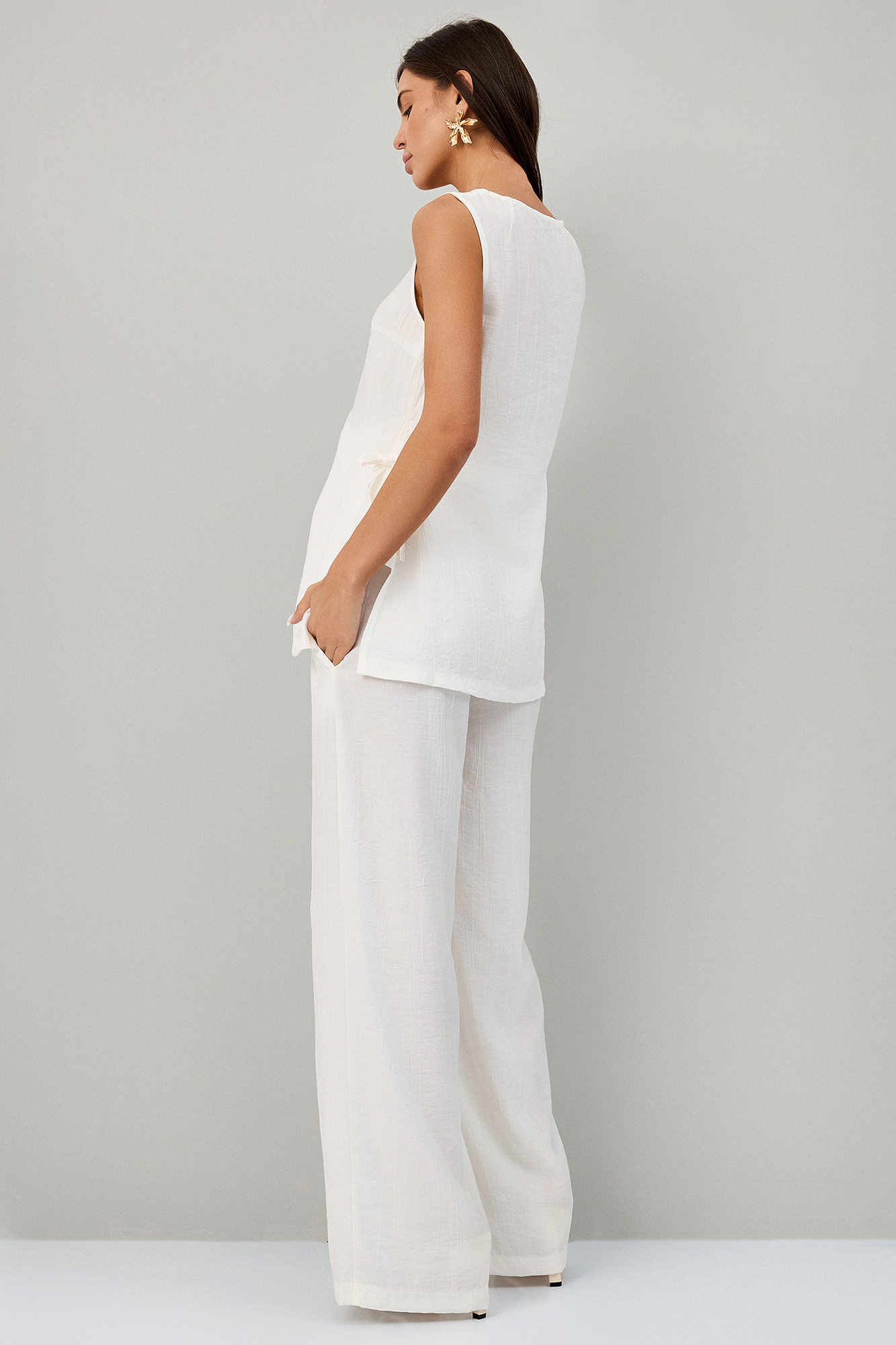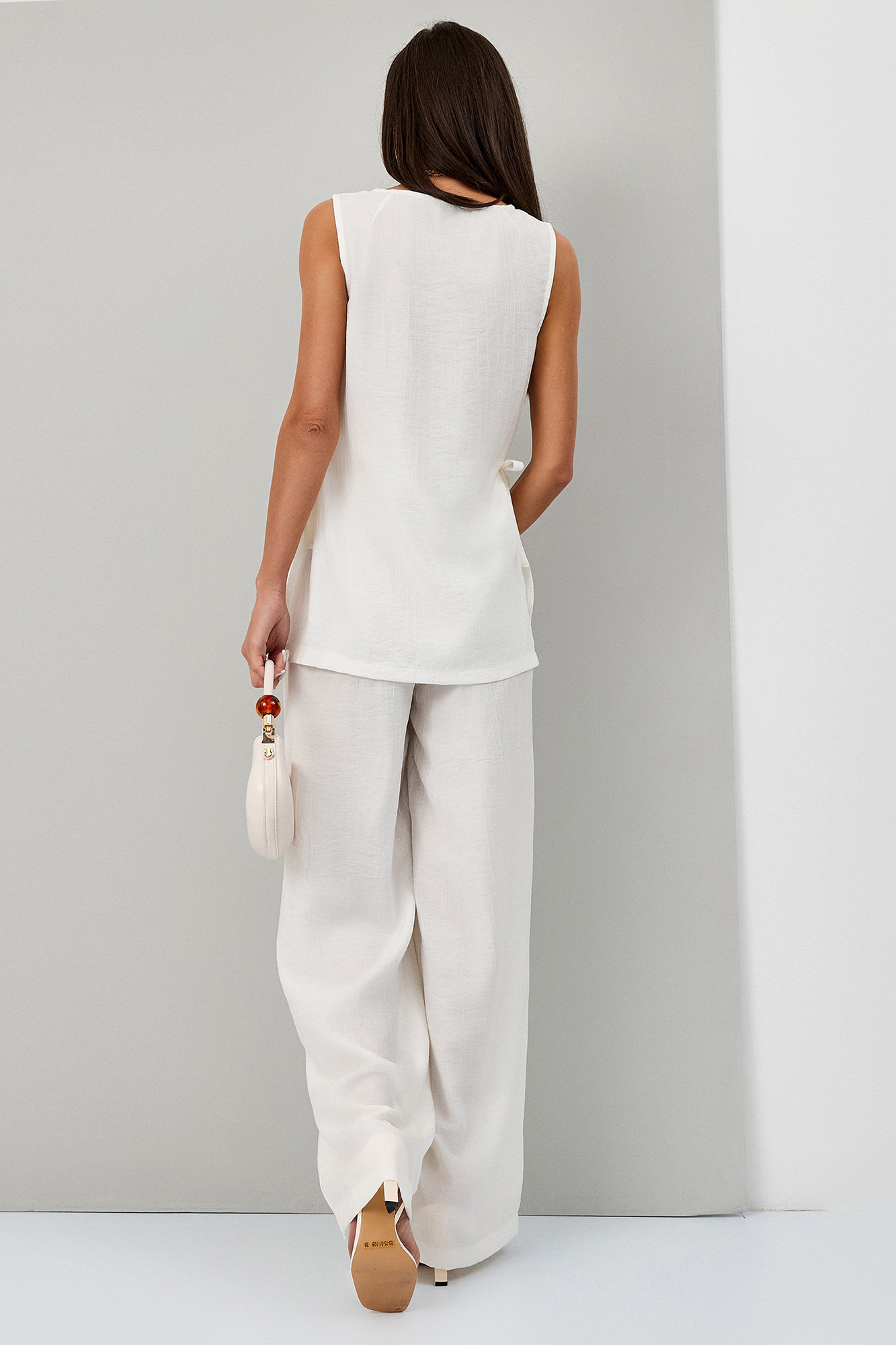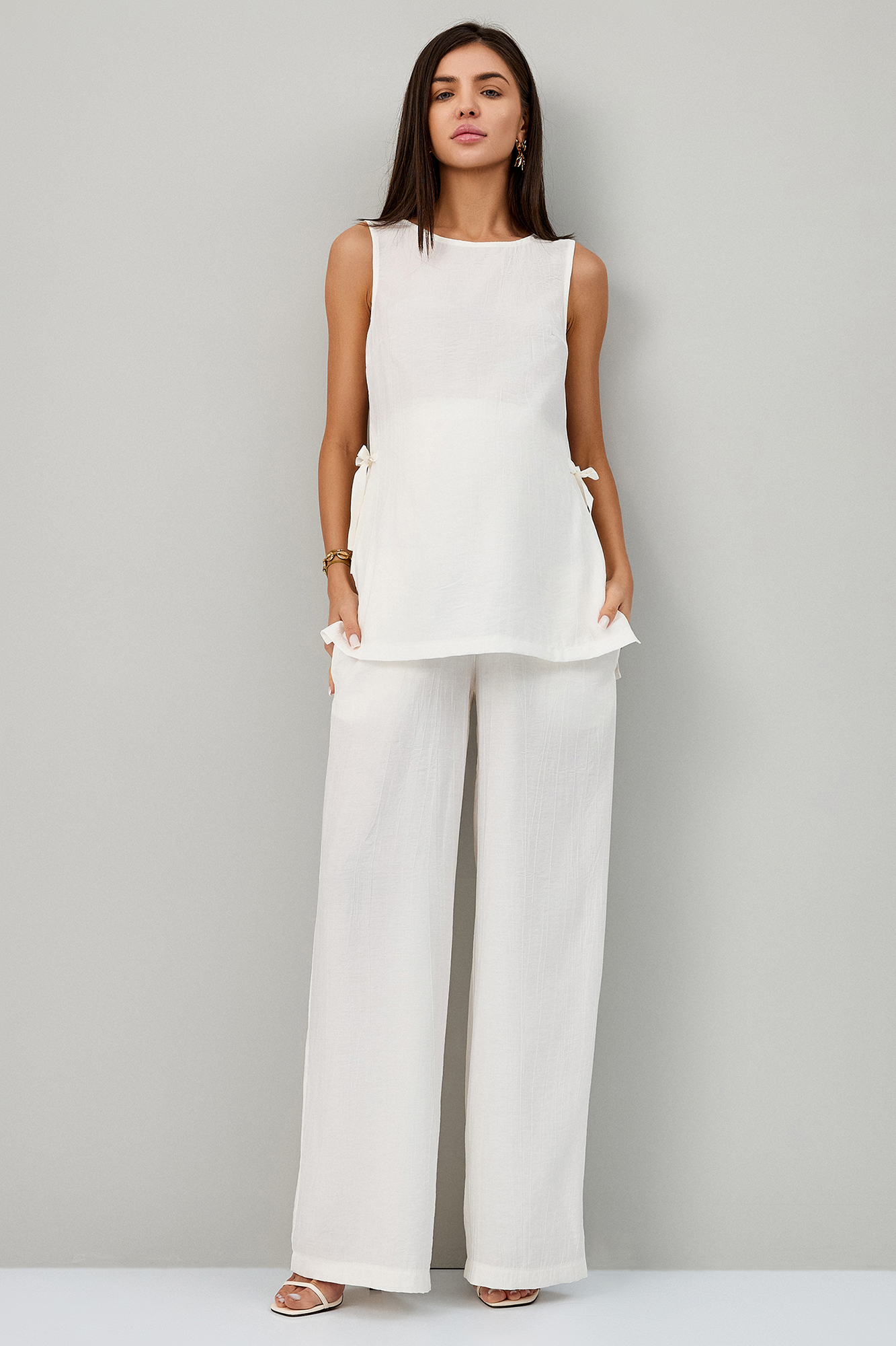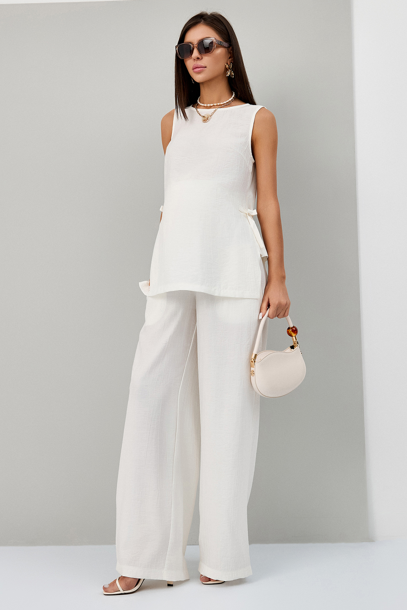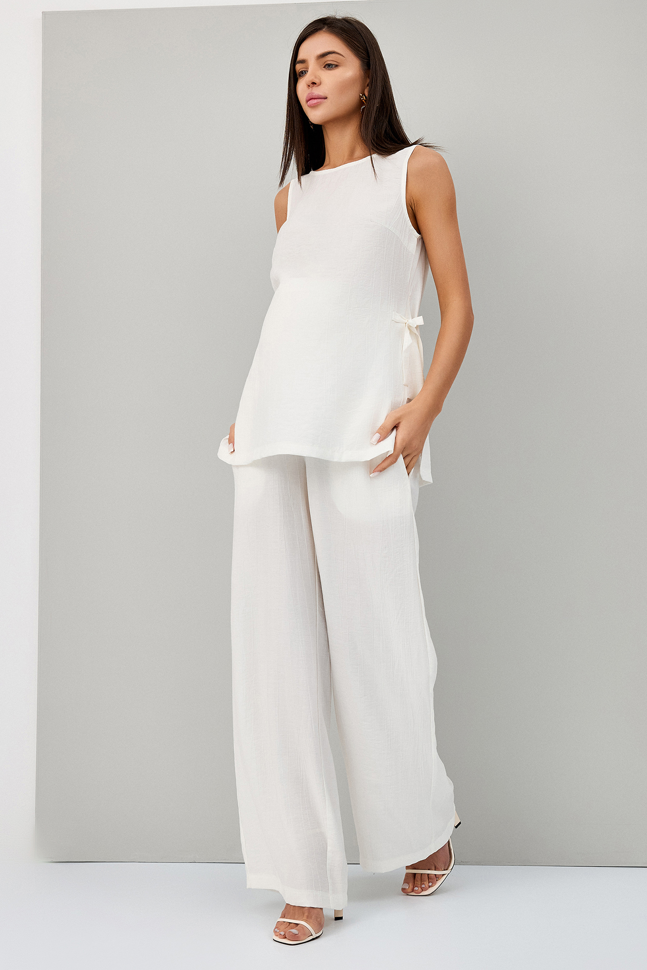 Костюм для беременных сшит из вискозы с эффектом жатки. Такой костюм станет отличным обновлением летнего гардероба будущей мамы. Верх оверсайз свободного кроя с завязками по бокам. Свободные брюки палаццо из вискозы с высокой посадкой оснащены широким эластичным поясом на резинке, который выполняет роль мягкого бандажа. Высокий пояс дополнен скрытой регулировкой объема на пуговице, который позволяет носить штаны на протяжении всего срока беременности. Фасон брюк классический прямой, крой широкий. Обе вещи в комплекте брючного костюма идеально сочетаются друг с другом, но в то же время достаточно самобытны, чтобы комбинировать их с другими вещами летом. Стильный костюм подходит девушкам и женщинам больших размеров для дома.