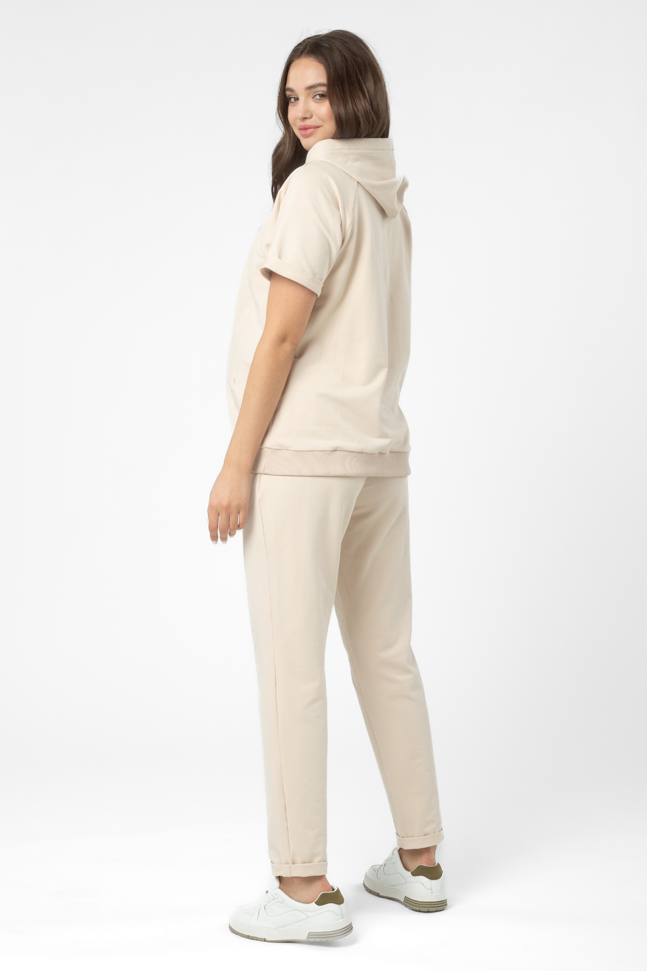 Спортивный костюм для беременных и кормящих. Модель выполнена из высококачественного двухниточного футера Френч Терри. Джемпер с капюшоном, короткими рукавами, оригинальным принтом и манжетой по низу изделия. Секрет кормления - диагональные потайные молнии - позволит покормить малыша с комфортом в любой ситуации. Брюки с эластичным поясом под живот не стесняют движений, особый крой рассчитан на весь срок беременности. Для регулировки объема предусмотрена перфорированная резинка, перестегивающаяся на пуговицу, продетая в пояс брюк.