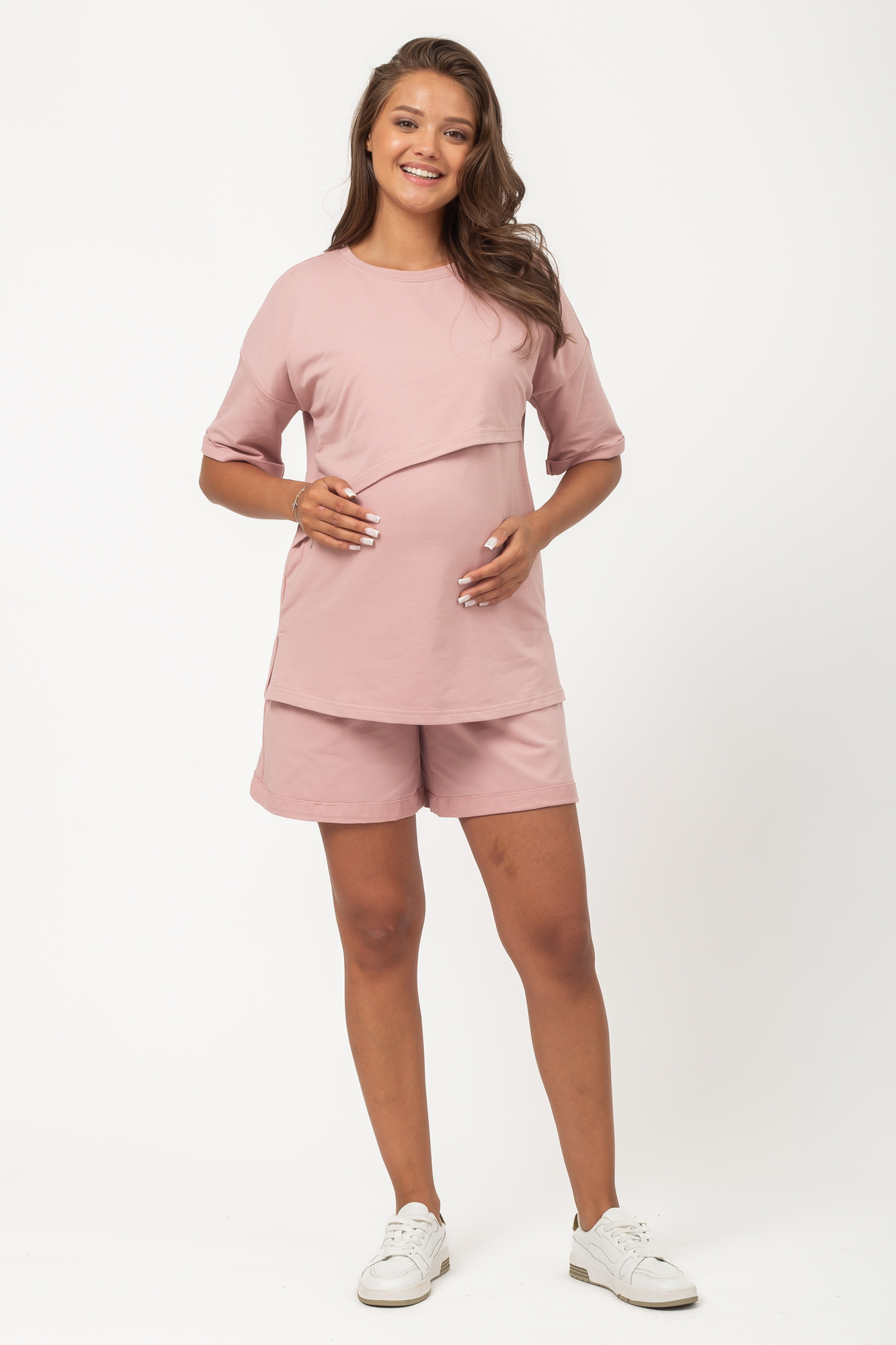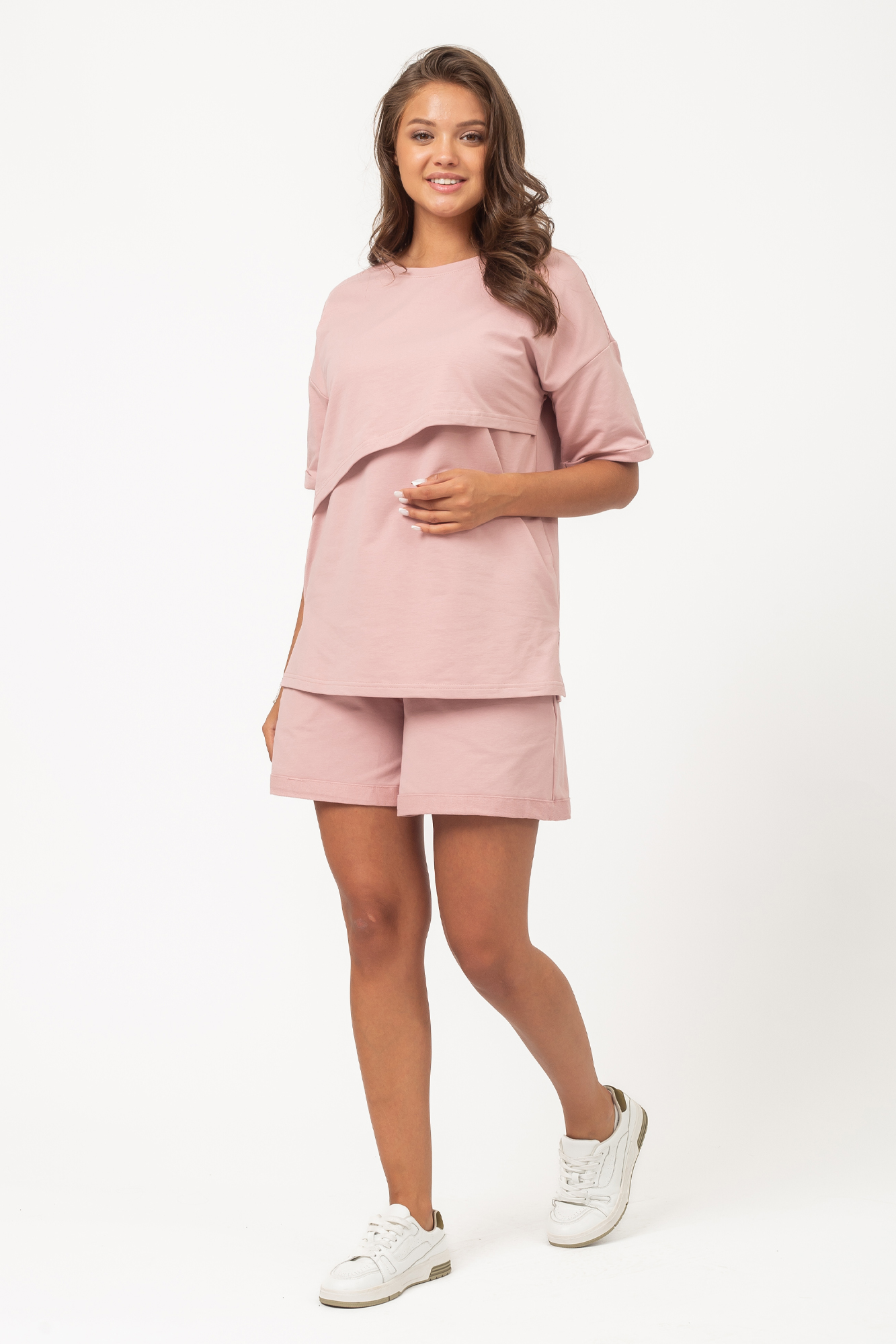 Летний костюм для беременных и кормящих сшит из тонкого двухниточного футера. Ткань на основе хлопка имеет дышащую структуру, приятна на ощупь и гипоаллергенна. Футболка оверсайз со спущенной линией плеча дарит полную свободу движениям. Секрет для кормления позволяет с комфортом покормить малыша на прогулке или в гостях. Короткие широкие шорты с эластичным поясом и кулиской можно носить на любом месяце беременности и даже после родов. Стильный женский костюм подойдет для отдыха и путешествий, занятий спортом, посещений врача, а также для ношения дома. В линейке представлены нежные однотонные расцветки.