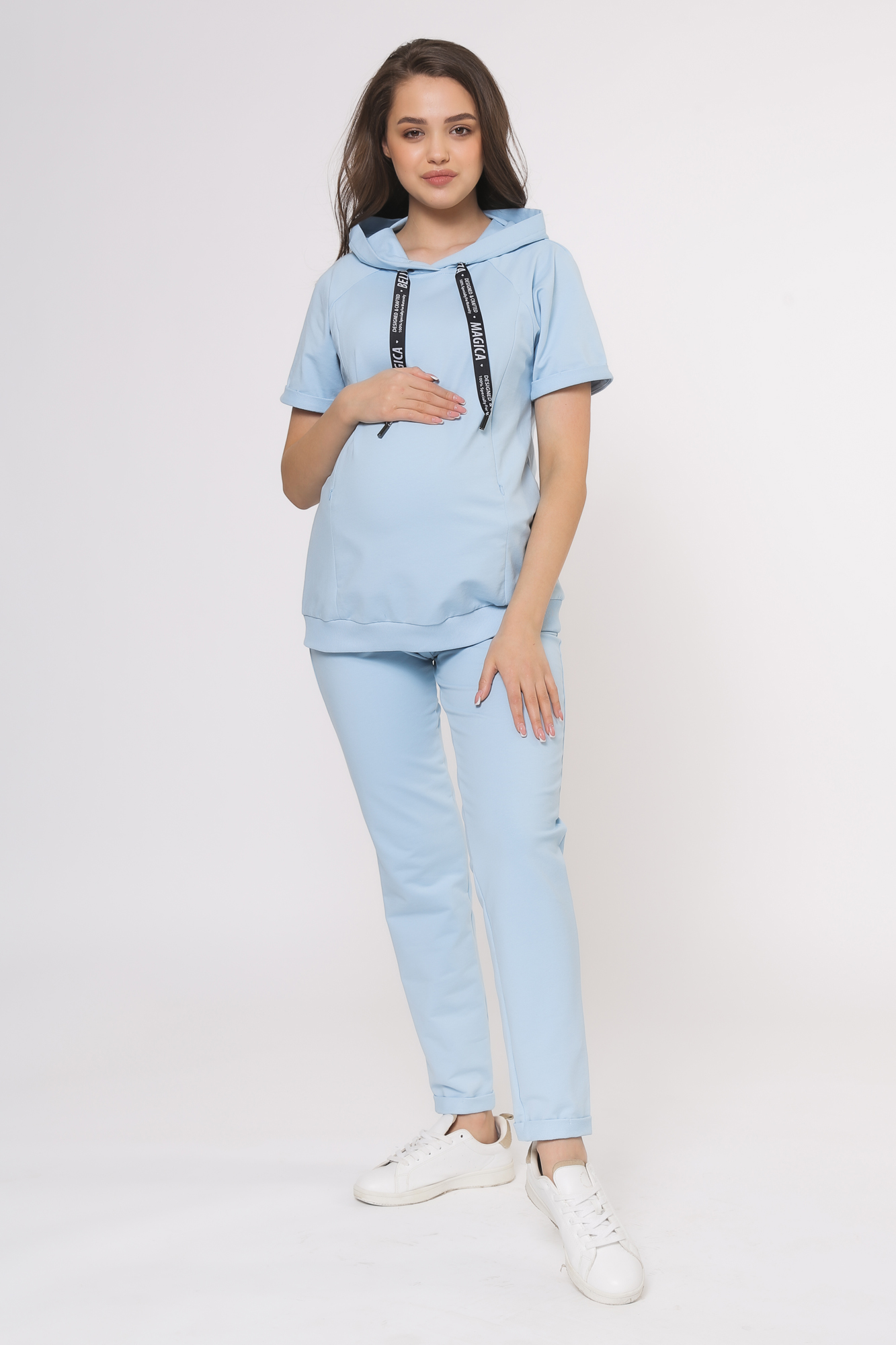 Спортивный костюм для беременных и кормящих. Модель выполнена из высококачественного двухниточного футера Френч Терри. Джемпер с капюшоном, короткими рукавами, оригинальным принтом и манжетой по низу изделия. Секрет кормления - диагональные потайные молнии - позволит покормить малыша с комфортом в любой ситуации. Брюки с эластичным поясом под живот не стесняют движений, особый крой рассчитан на весь срок беременности. Для регулировки объема предусмотрена перфорированная резинка, перестегивающаяся на пуговицу, продетая в пояс брюк.