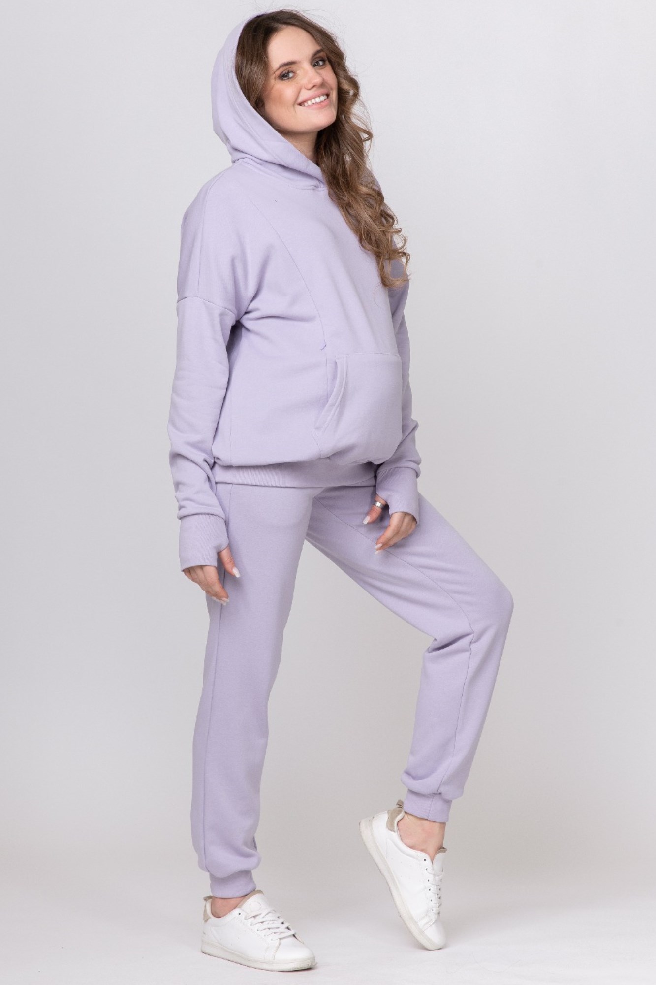 Cпортивный костюм для беременных и кормящих выполнен из высококачественного трехниточного футера. Стильное худи согреет в прохладную погоду. Особый крой позволяет носить изделие на всем протяжении беременности и после нее. Благодаря диагональным потайным молниям Вы сможете покормить малыша с комфортом в любой ситуации. Брюки с эластичным поясом рассчитаны на любой срок беременности, не сдавливают и поддерживают растущий животик. Объем регулируется с помощью перфорированной резинки, перестегивающейся на пуговицу, продетой в пояс брюк.