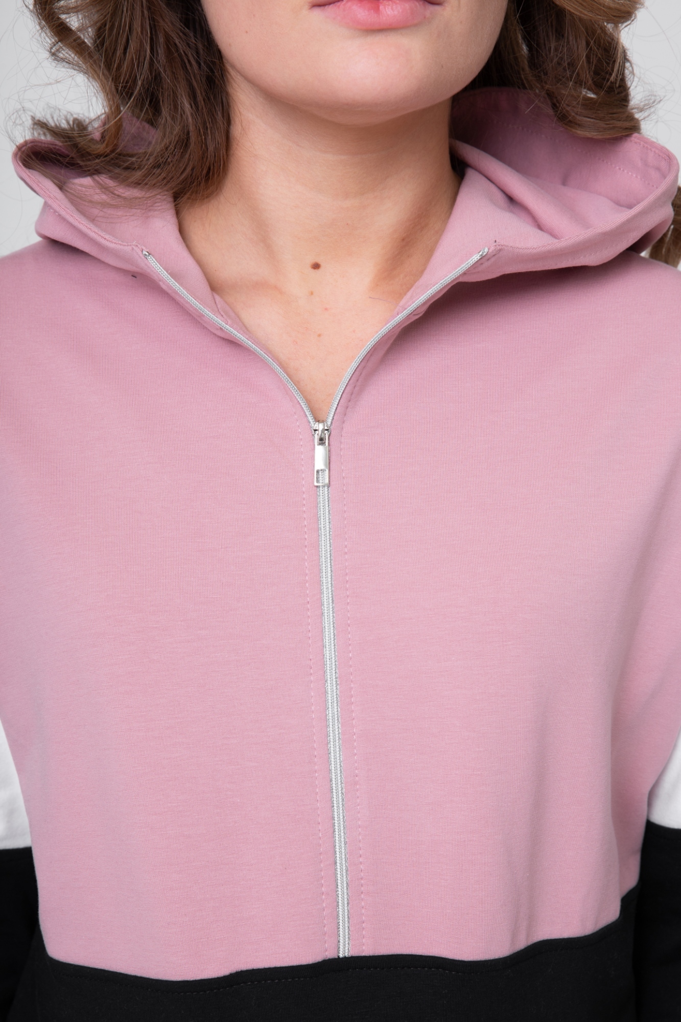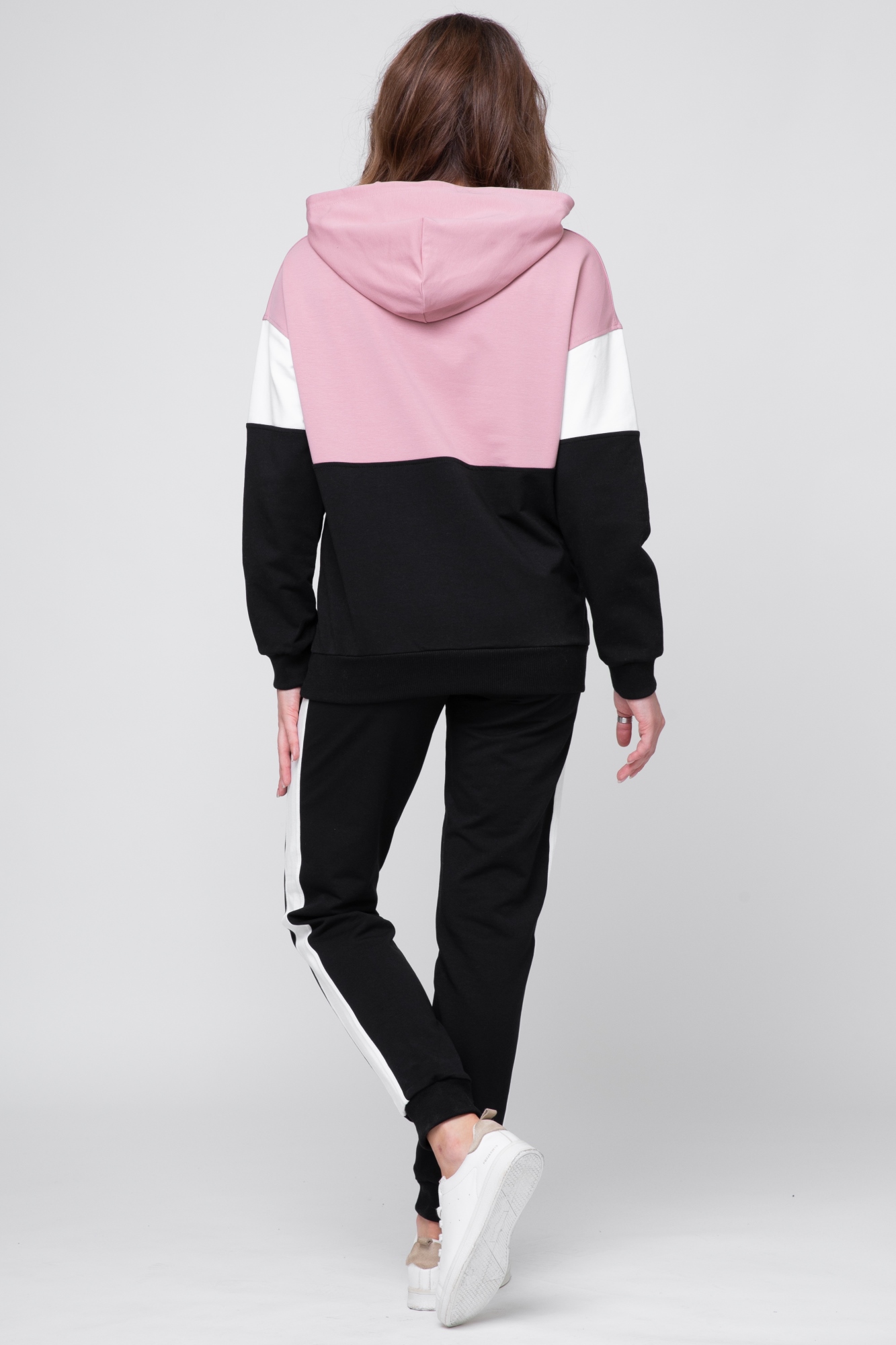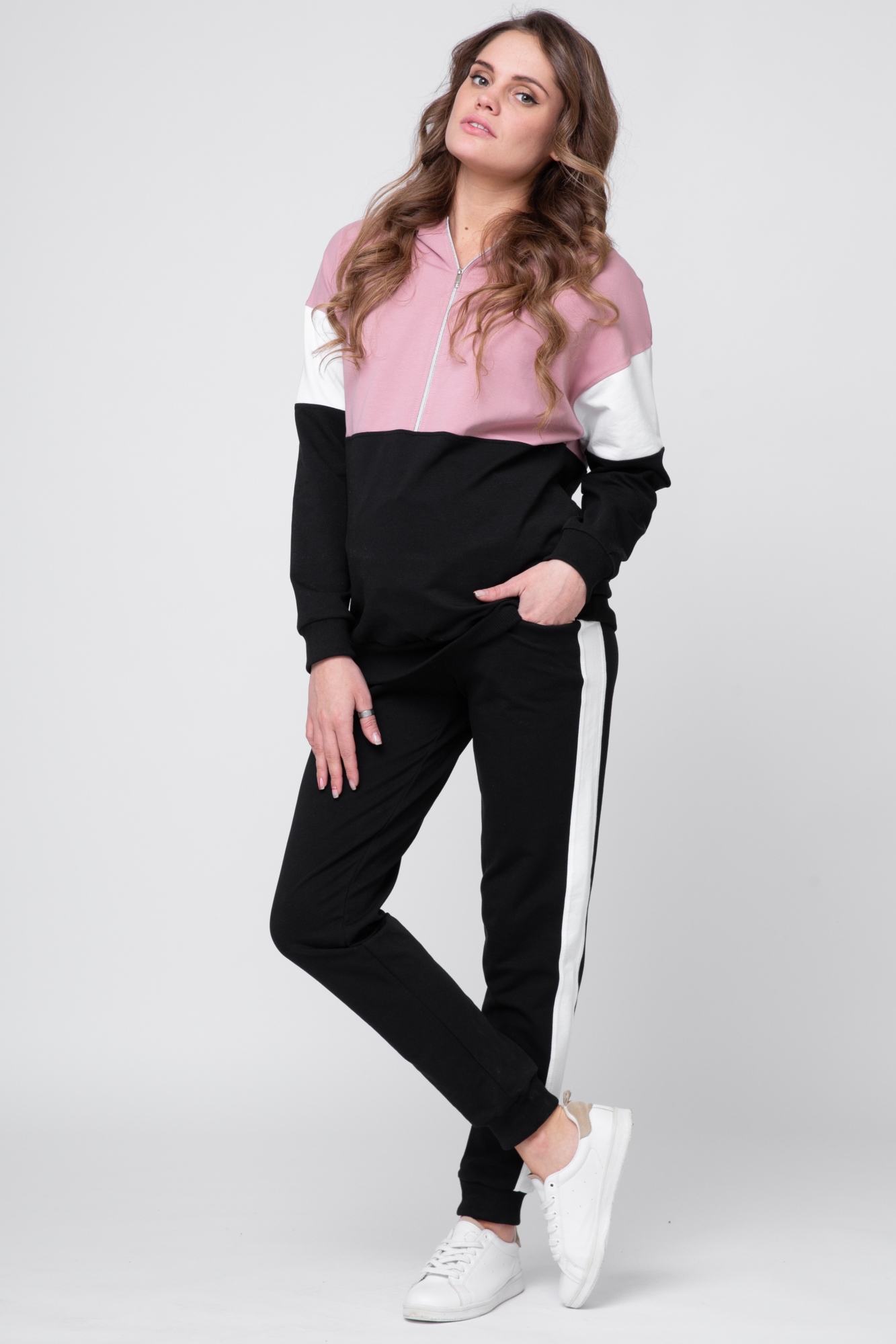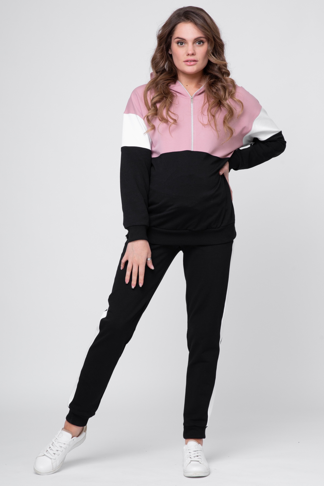 Спортивный костюм из двухниточного футера для беременных и кормящих. Худи в стиле колорблок с манжетами по низу изделия и на рукавах. Конструкция для кормления - вертикальная молния на уровне груди. Особый крой позволяет носить изделие на всем протяжении беременности и после нее. Брюки с лампасами и эластичной вставкой рассчитаны на любой срок беременности. Объем регулируется с помощью перфорированной резинки, перестегивающейся на пуговицу, продетой в пояс брюк.