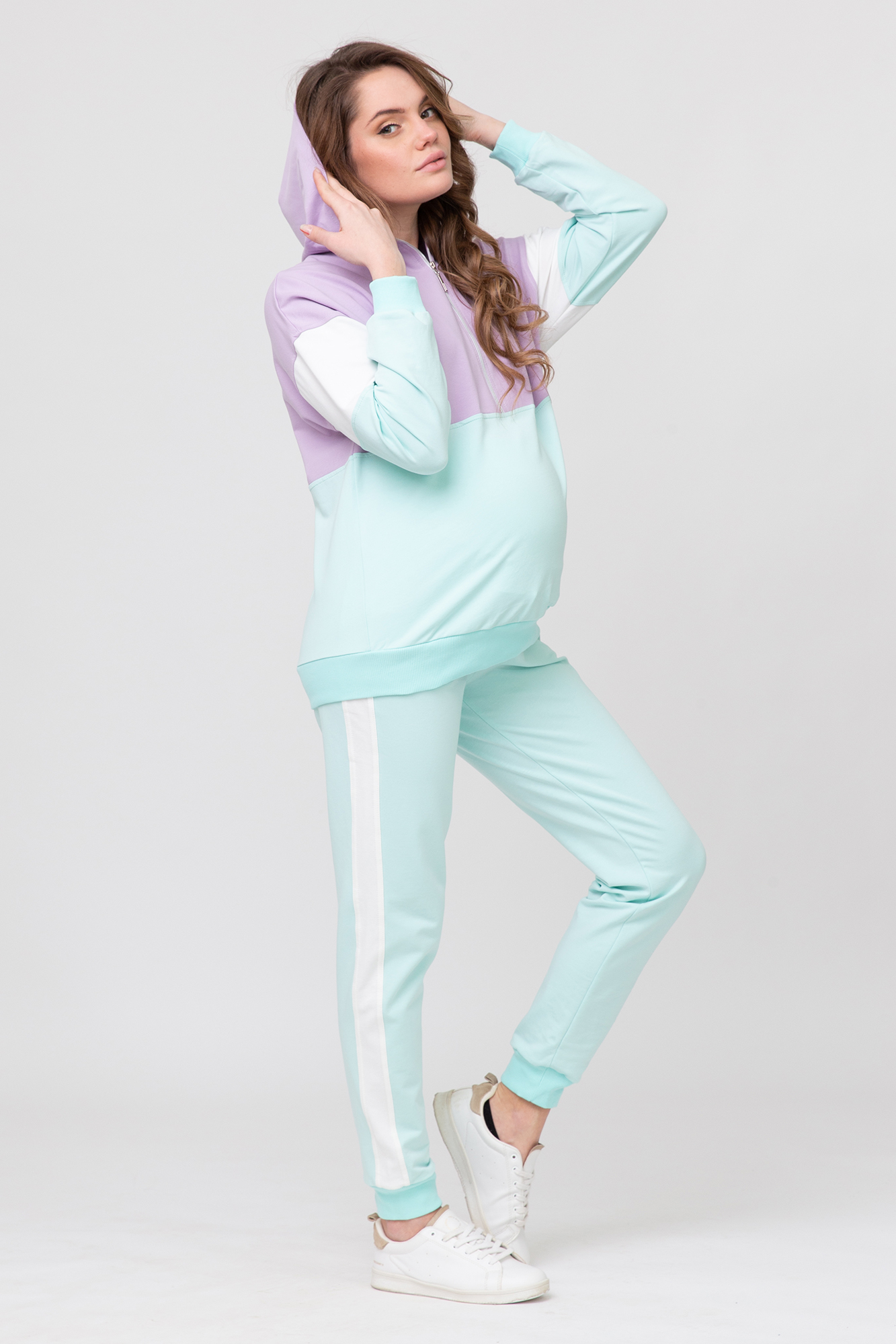 Спортивный костюм из двухниточного футера для беременных и кормящих. Худи в стиле колорблок с манжетами по низу изделия и на рукавах. Конструкция для кормления - вертикальная молния на уровне груди. Особый крой позволяет носить изделие на всем протяжении беременности и после нее. Брюки с лампасами и эластичной вставкой рассчитаны на любой срок беременности. Объем регулируется с помощью перфорированной резинки, перестегивающейся на пуговицу, продетой в пояс брюк.