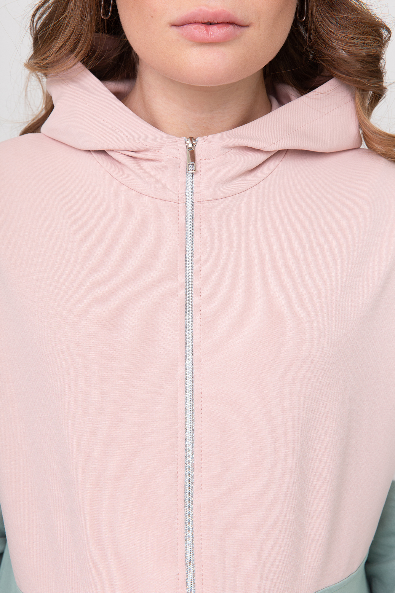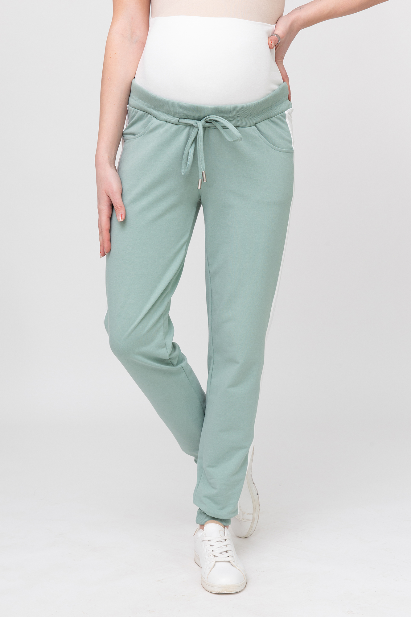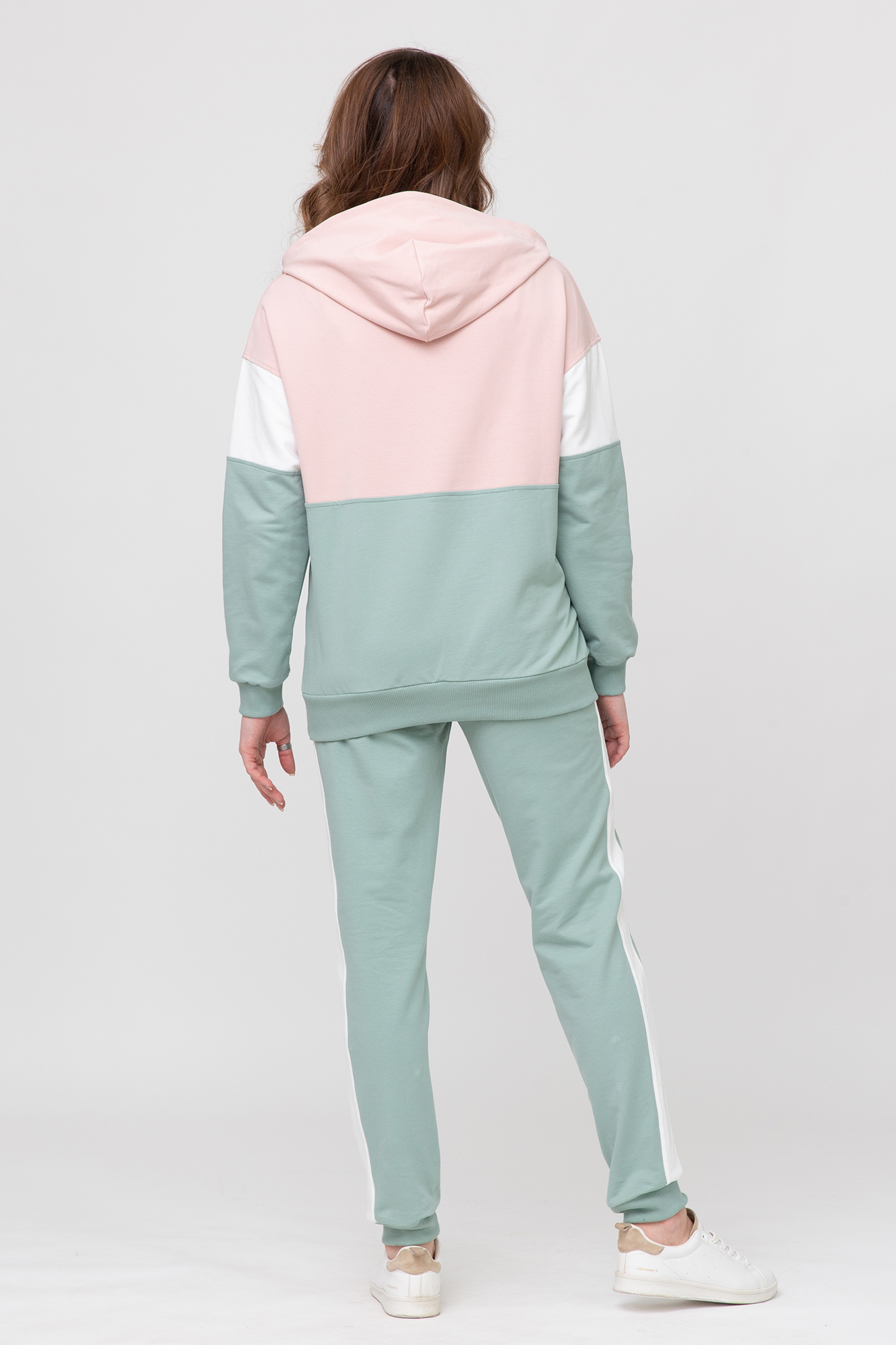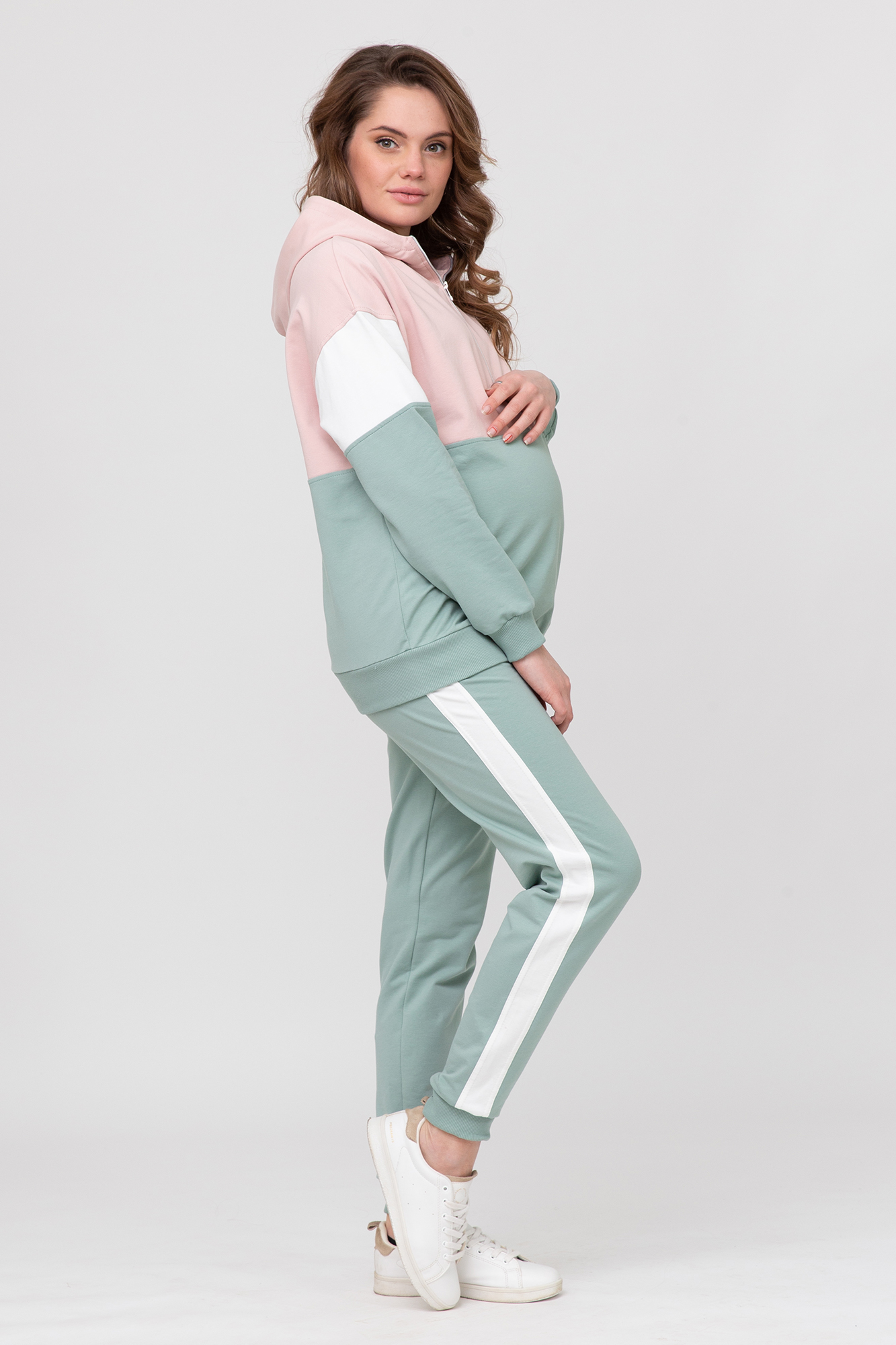 Спортивный костюм из двухниточного футера для беременных и кормящих. Худи в стиле колорблок с манжетами по низу изделия и на рукавах. Конструкция для кормления - вертикальная молния на уровне груди. Особый крой позволяет носить изделие на всем протяжении беременности и после нее. Брюки с лампасами и эластичной вставкой рассчитаны на любой срок беременности. Объем регулируется с помощью перфорированной резинки, перестегивающейся на пуговицу, продетой в пояс брюк.