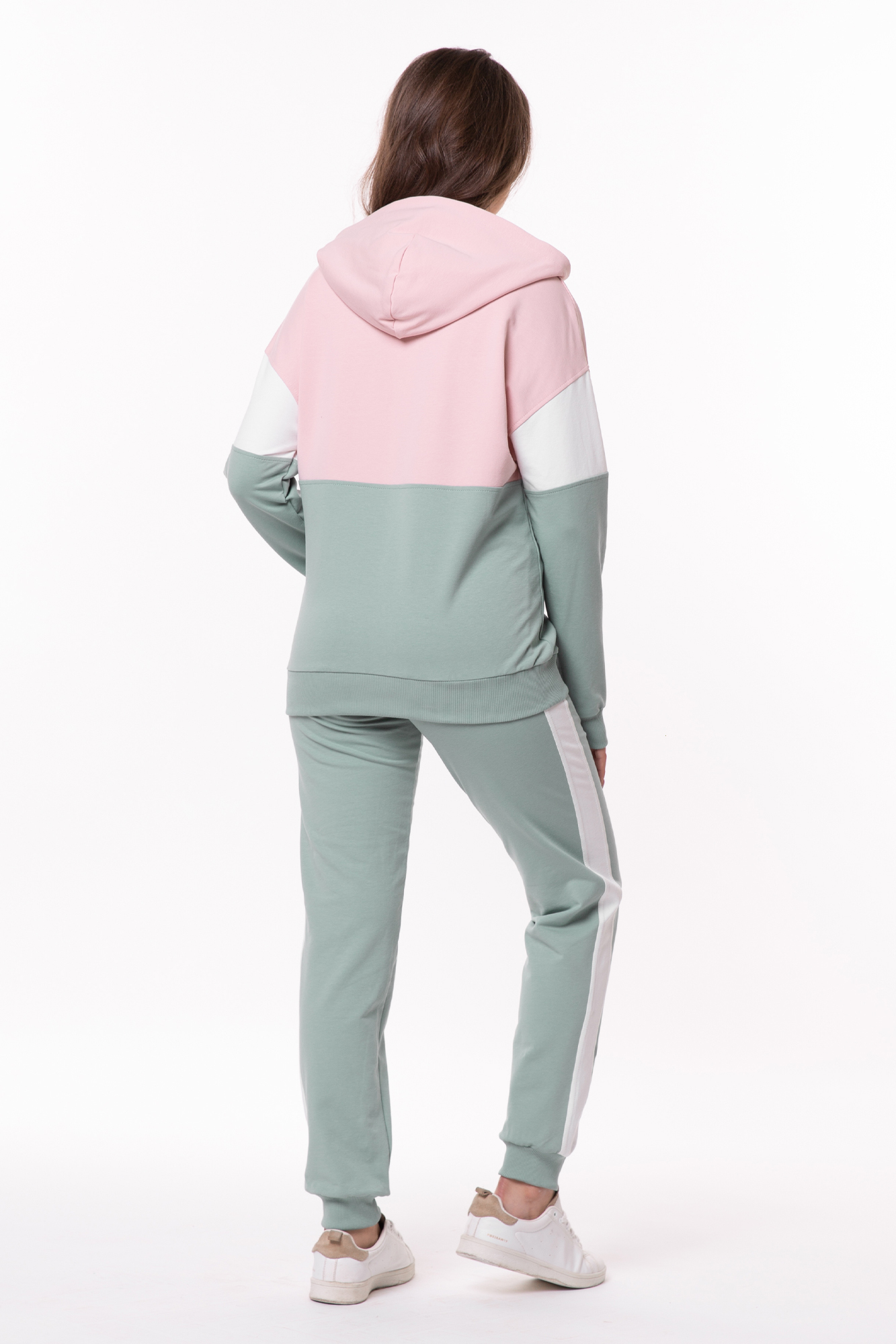 Спортивный костюм из двухниточного футера для беременных и кормящих. Худи в стиле колорблок с манжетами по низу изделия и на рукавах. Конструкция для кормления - вертикальная молния на уровне груди. Особый крой позволяет носить изделие на всем протяжении беременности и после нее. Брюки с лампасами и эластичной вставкой рассчитаны на любой срок беременности. Объем регулируется с помощью перфорированной резинки, перестегивающейся на пуговицу, продетой в пояс брюк.
