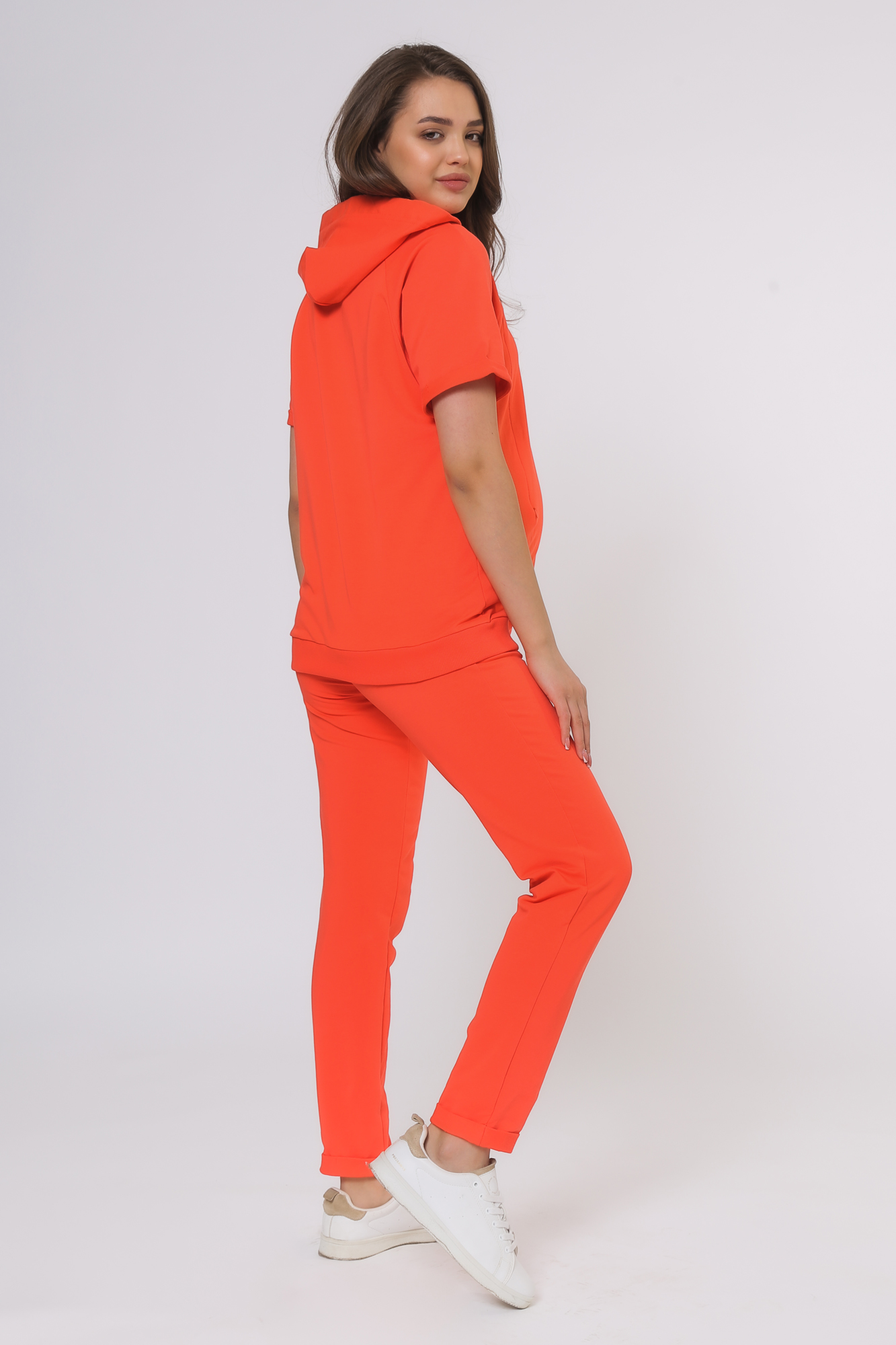 Спортивный костюм для беременных и кормящих. Модель выполнена из высококачественного двухниточного футера Френч Терри. Джемпер с капюшоном, короткими рукавами, оригинальным принтом и манжетой по низу изделия. Секрет кормления - диагональные потайные молнии - позволит покормить малыша с комфортом в любой ситуации. Брюки с эластичным поясом под живот не стесняют движений, особый крой рассчитан на весь срок беременности. Для регулировки объема предусмотрена перфорированная резинка, перестегивающаяся на пуговицу, продетая в пояс брюк.