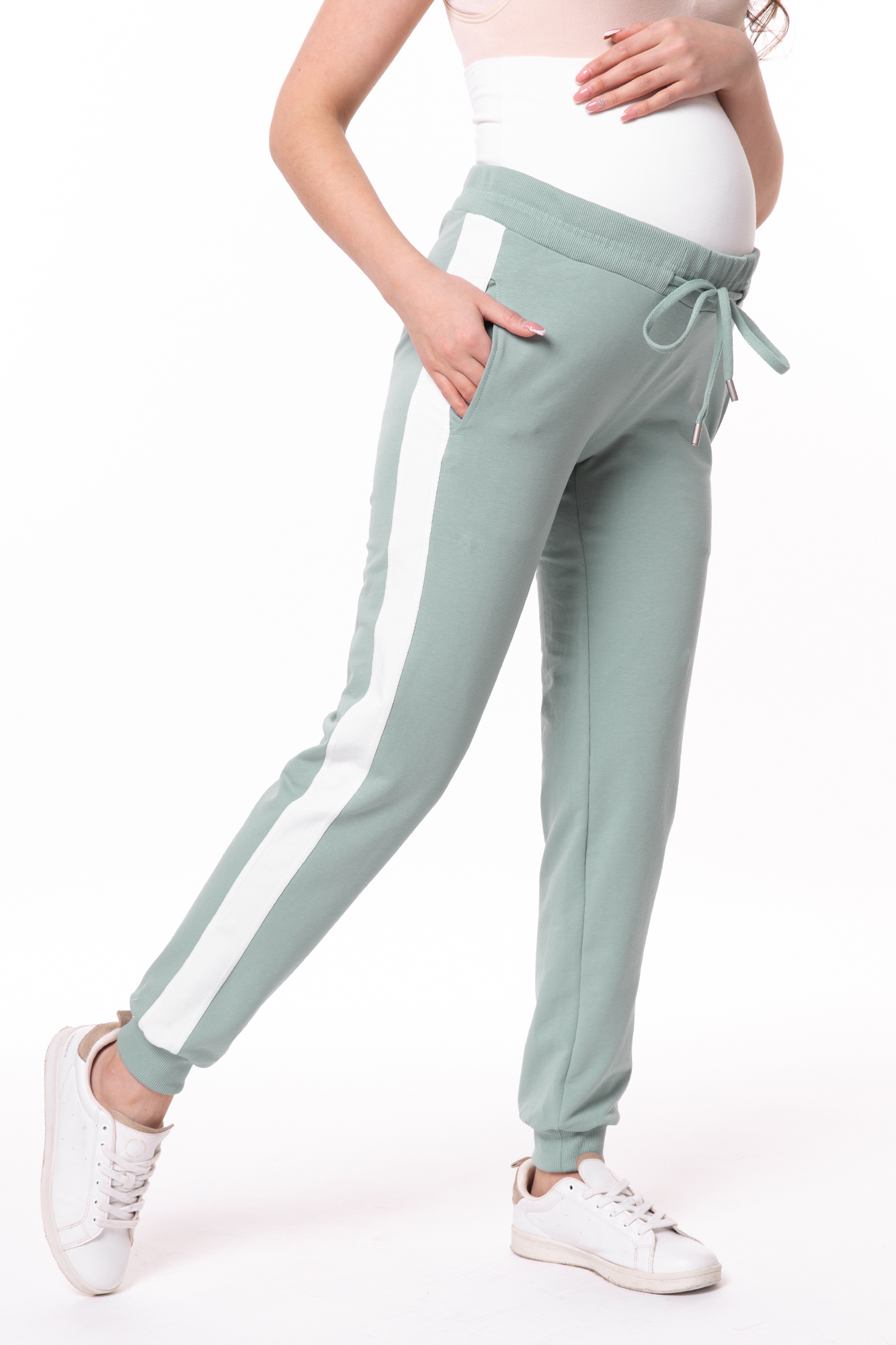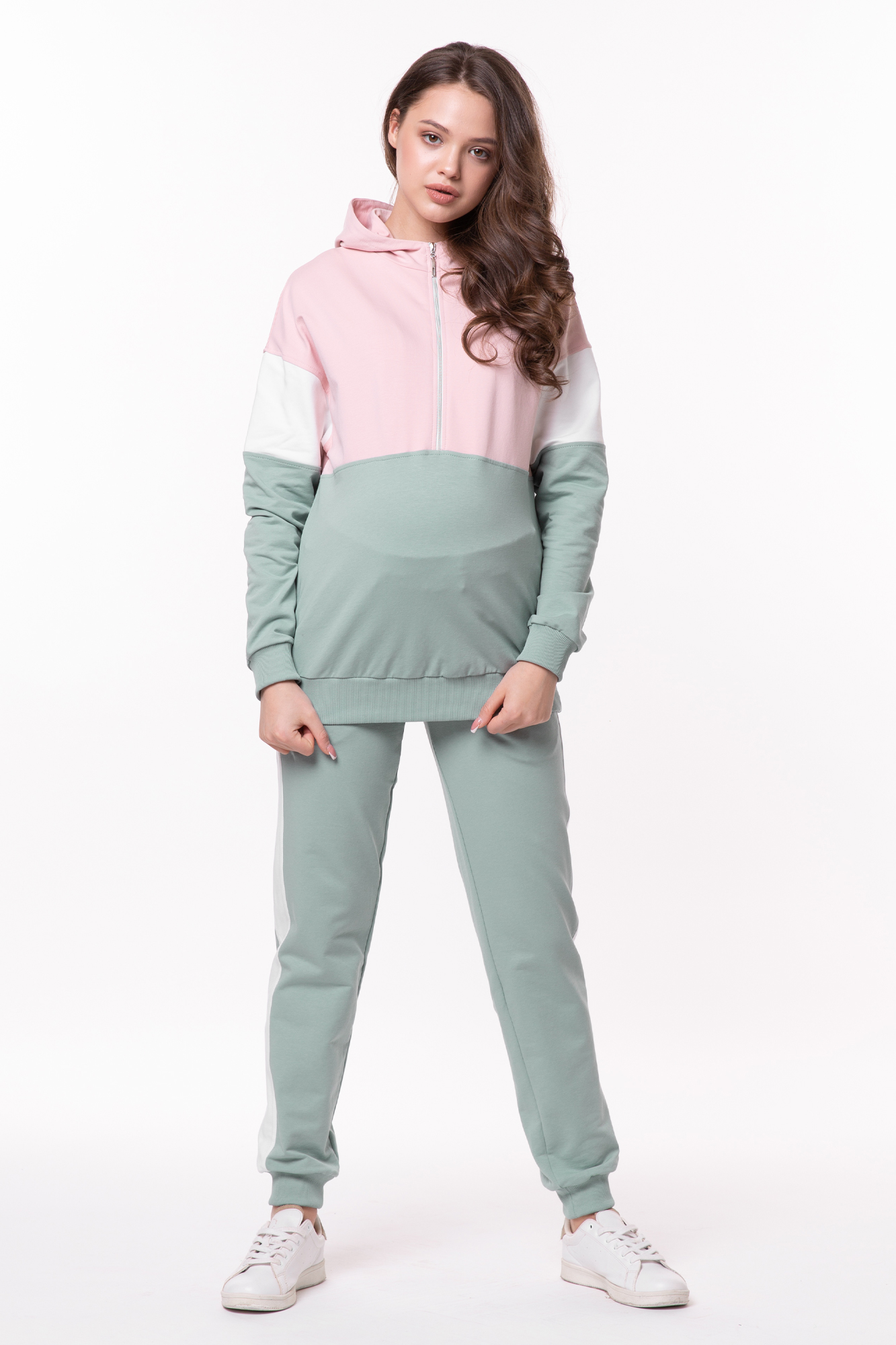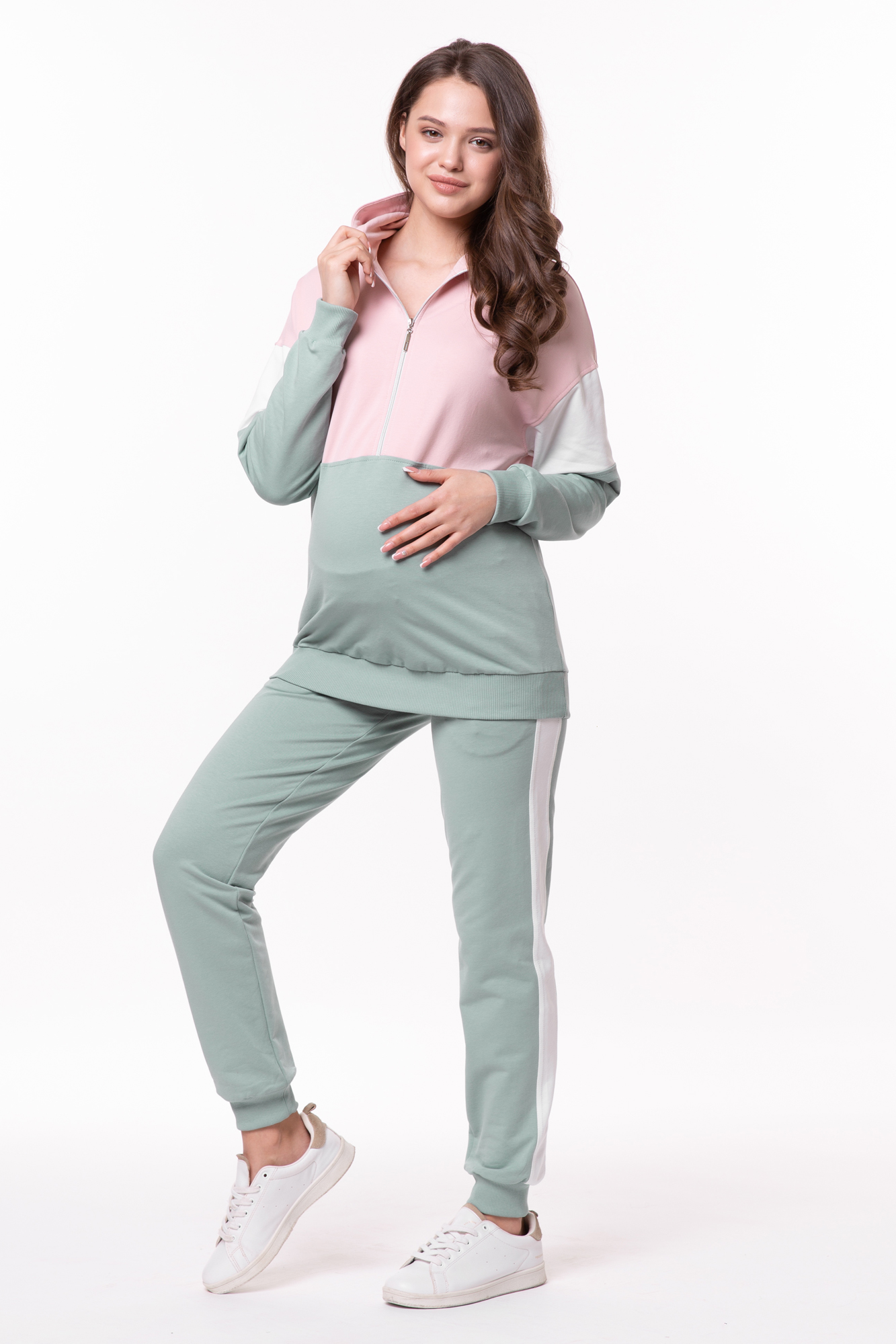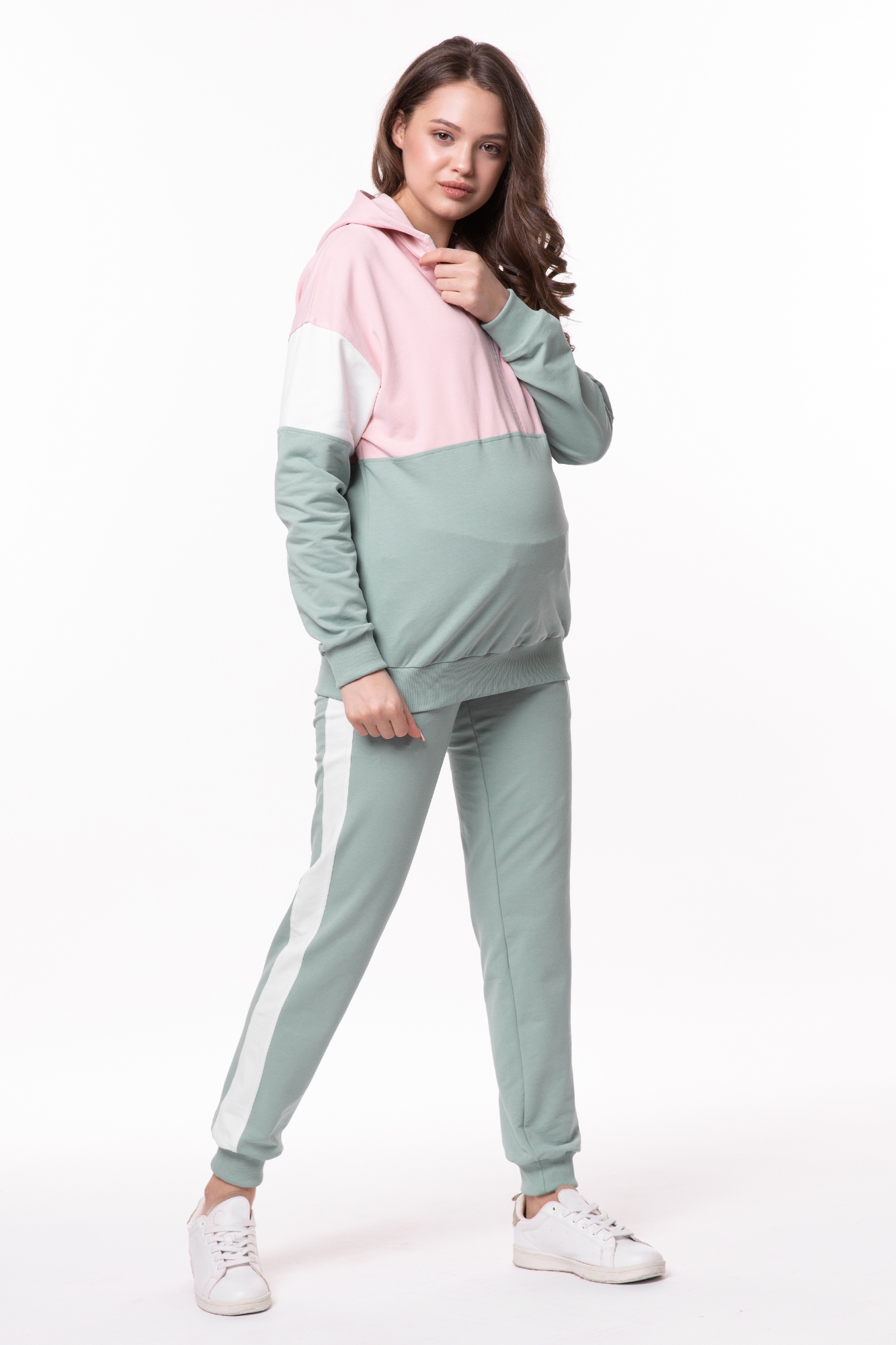 Спортивный костюм из двухниточного футера для беременных и кормящих. Худи в стиле колорблок с манжетами по низу изделия и на рукавах. Конструкция для кормления - вертикальная молния на уровне груди. Особый крой позволяет носить изделие на всем протяжении беременности и после нее. Брюки с лампасами и эластичной вставкой рассчитаны на любой срок беременности. Объем регулируется с помощью перфорированной резинки, перестегивающейся на пуговицу, продетой в пояс брюк.