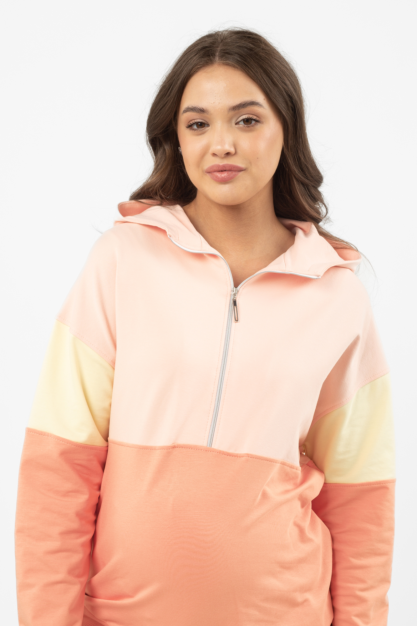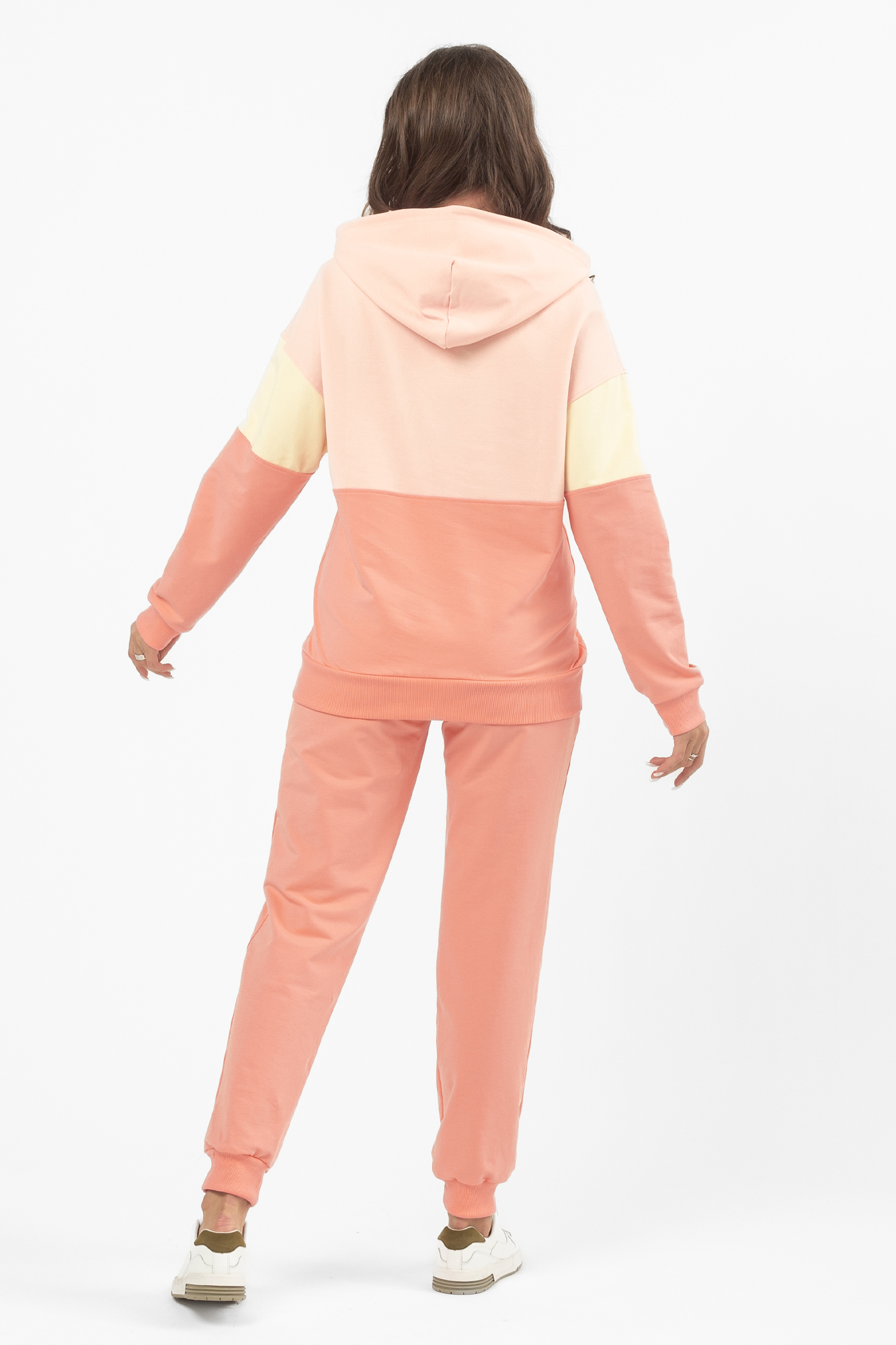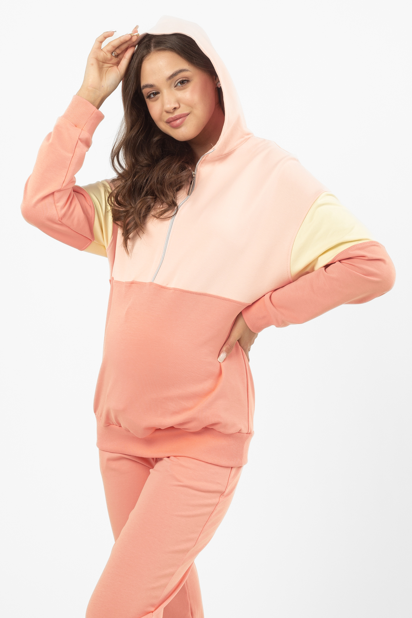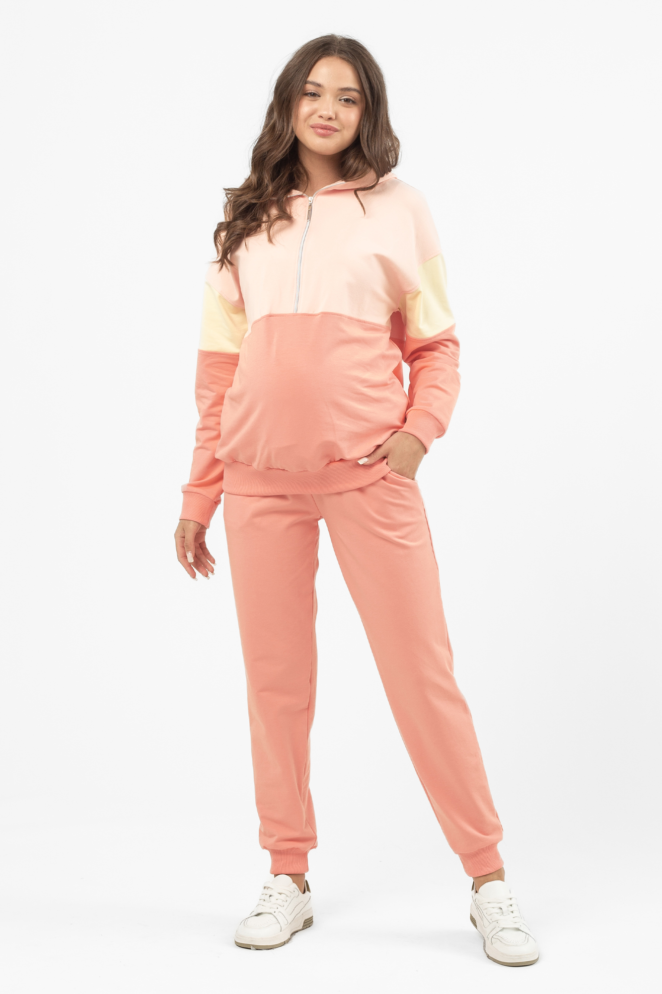 Спортивный костюм из двухниточного футера для беременных и кормящих. Худи в стиле колорблок с манжетами по низу изделия и на рукавах. Конструкция для кормления - вертикальная молния на уровне груди. Особый крой позволяет носить изделие на всем протяжении беременности и после нее. Брюки с лампасами и эластичной вставкой рассчитаны на любой срок беременности. Объем регулируется с помощью перфорированной резинки, перестегивающейся на пуговицу, продетой в пояс брюк.