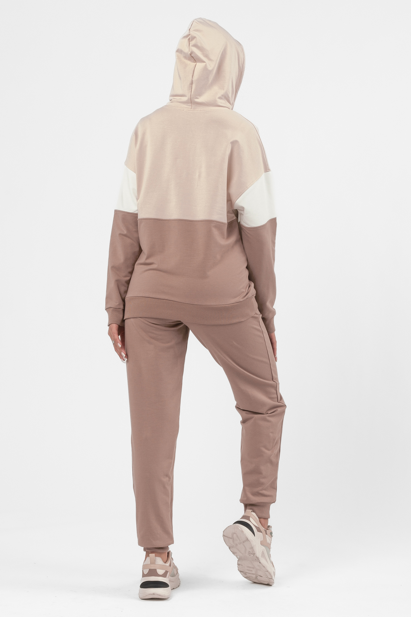 Спортивный костюм из двухниточного футера для беременных и кормящих. Худи в стиле колорблок с манжетами по низу изделия и на рукавах. Конструкция для кормления - вертикальная молния на уровне груди. Особый крой позволяет носить изделие на всем протяжении беременности и после нее. Брюки с лампасами и эластичной вставкой рассчитаны на любой срок беременности. Объем регулируется с помощью перфорированной резинки, перестегивающейся на пуговицу, продетой в пояс брюк.