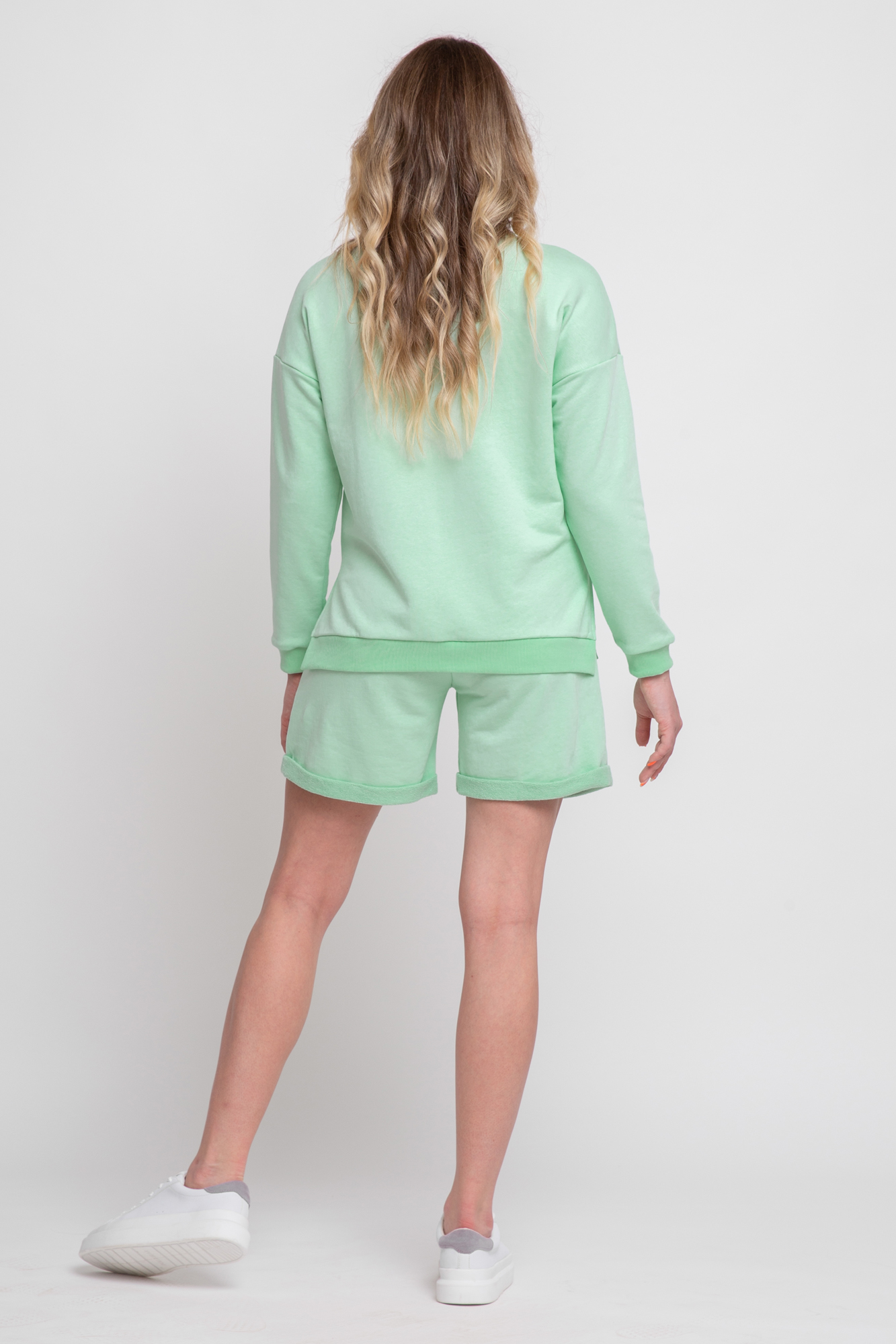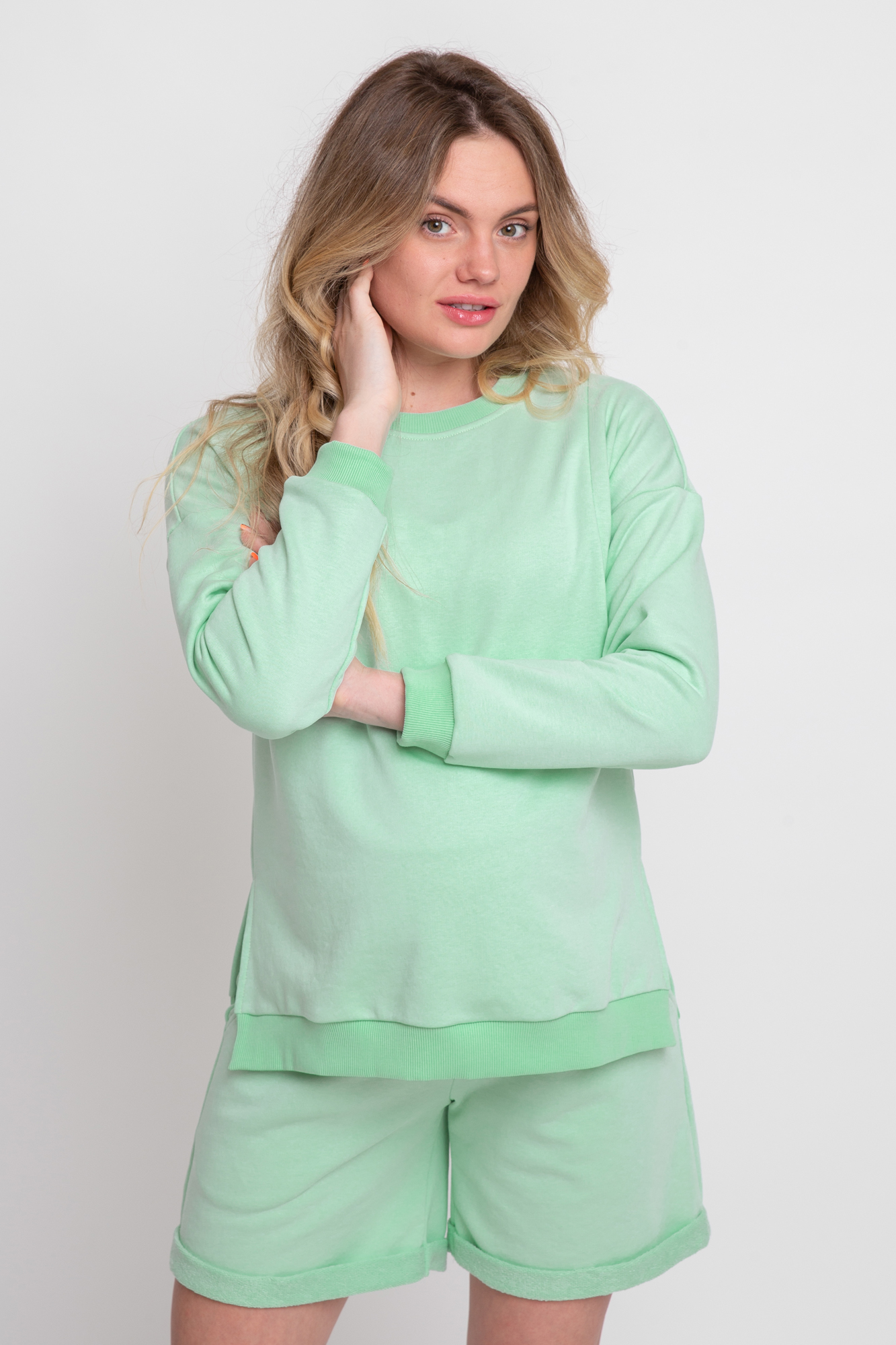 Спортивный костюм из высококачественного трехниточного футера (петля) для беременных и кормящих. Свитшот имеет «секрет» кормления – вертикальные потайные молнии – позволит покормить малыша с повышенным комфортом в любой ситуации. Шорты с высокой трикотажной вставкой предназначены для ношения в период беременности и после родов. Объем регулируется при помощи перфорированной резинки, перестегивающейся на пуговицу, продетой в пояс изделия. Костюм подойдет для прогулок, занятий спортом и в качестве домашней одежды.
