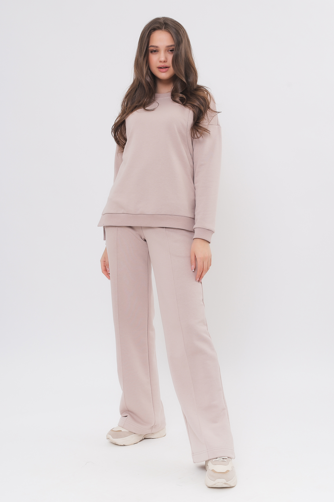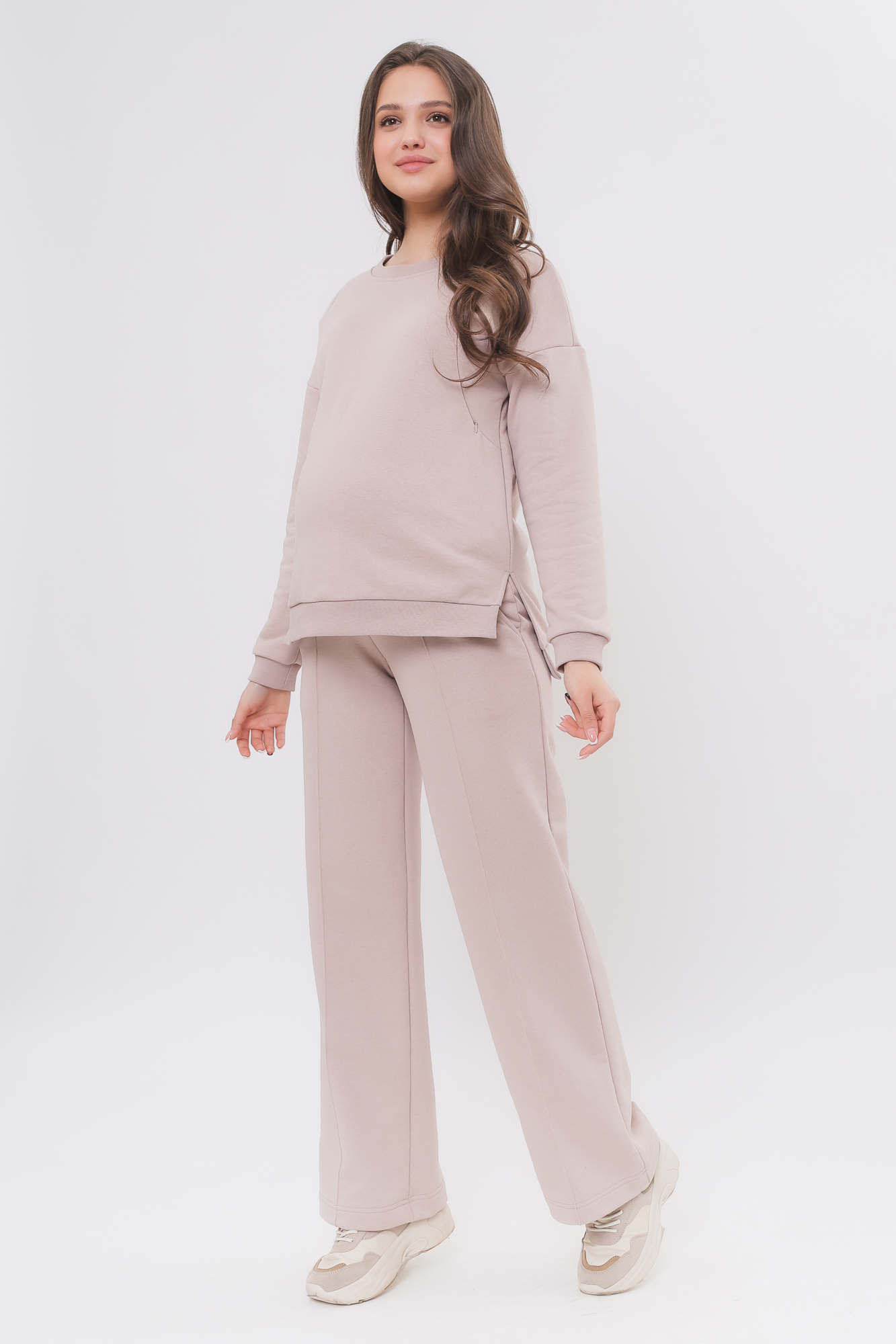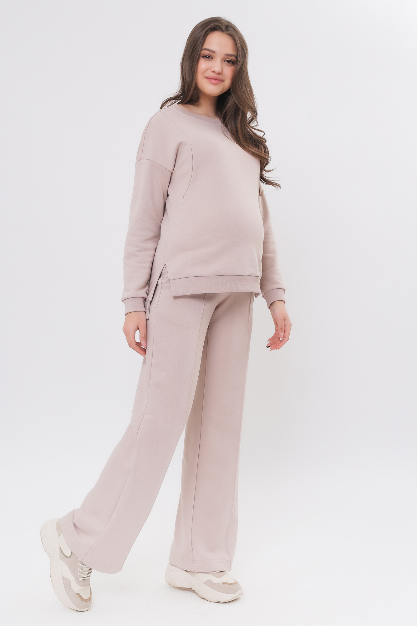 Спортивный костюм для беременных и кормящих выполнен из высококачественного трехниточного футера (петля). «Секрет» кормления у свитшота – вертикальные потайные молнии – позволит покормить малыша с повышенным комфортом в любой ситуации. Округлый вырез горловины, удлиненная линия плеча, манжет по низу изделия и на рукавах. Брюки с высокой трикотажной вставкой предназначены для ношения в период беременности и после родов. Объем регулируется при помощи перфорированной резинки, перестегивающейся на пуговицу, продетой в пояс брюк. Костюм подойдет для прогулок, занятий спортом и в качестве домашней одежды.