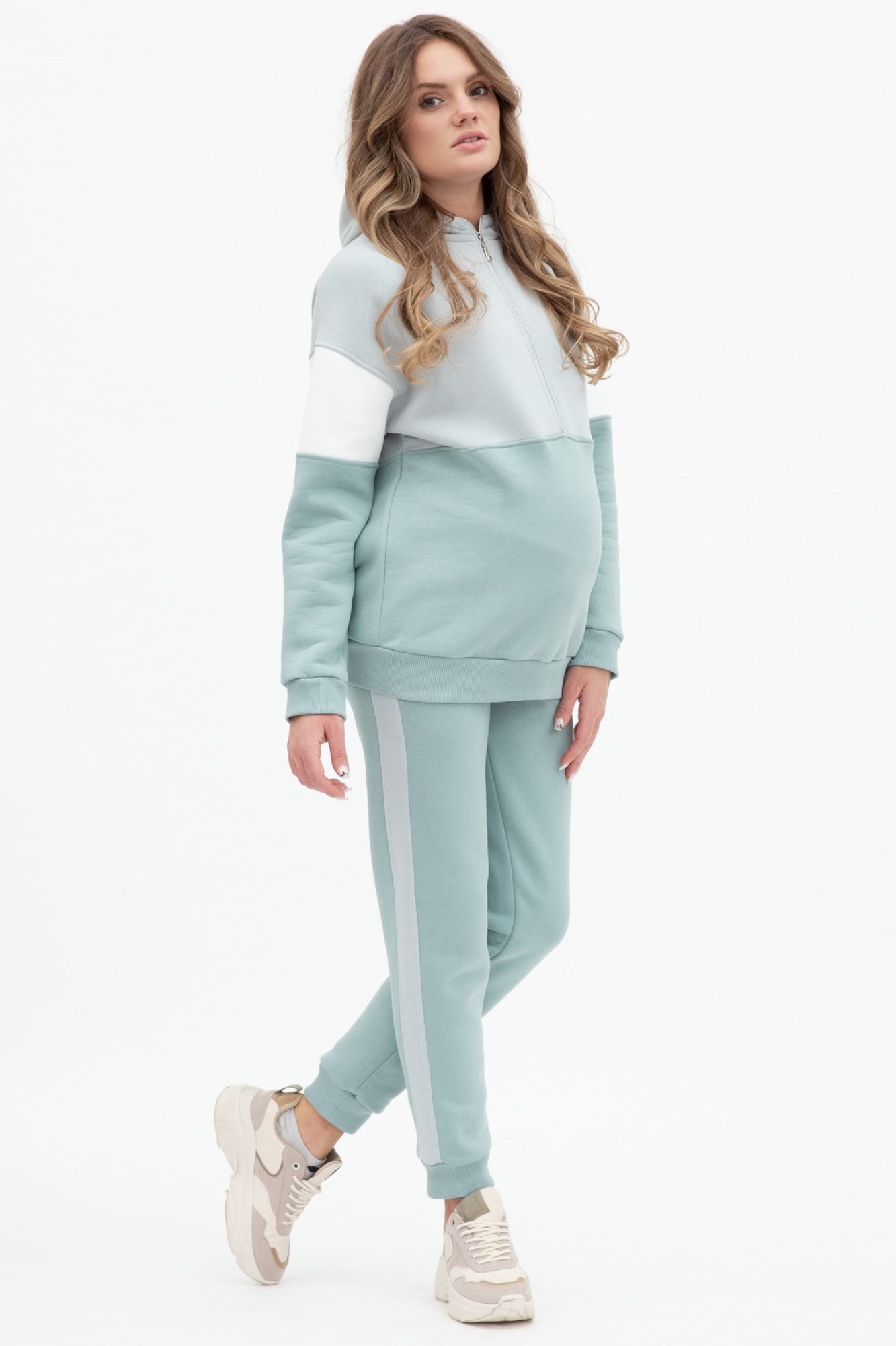 Утепленный спортивный костюм для беременных и кормящих выполнен из высококачественного трехниточного футера с начесом. Худи в стиле колорблок с манжетами по низу изделия и на рукавах. Вертикальная молния на уровне груди позволяет покормить малыша в любой ситуации. Особый крой позволяет носить изделие на всем протяжении беременности и после нее. Брюки с лампасами и эластичным поясом рассчитаны на любой срок беременности, не сдавливают и поддерживают растущий животик. Объем регулируется с помощью перфорированной резинки, перестегивающейся на пуговицу, продетой в пояс брюк.
