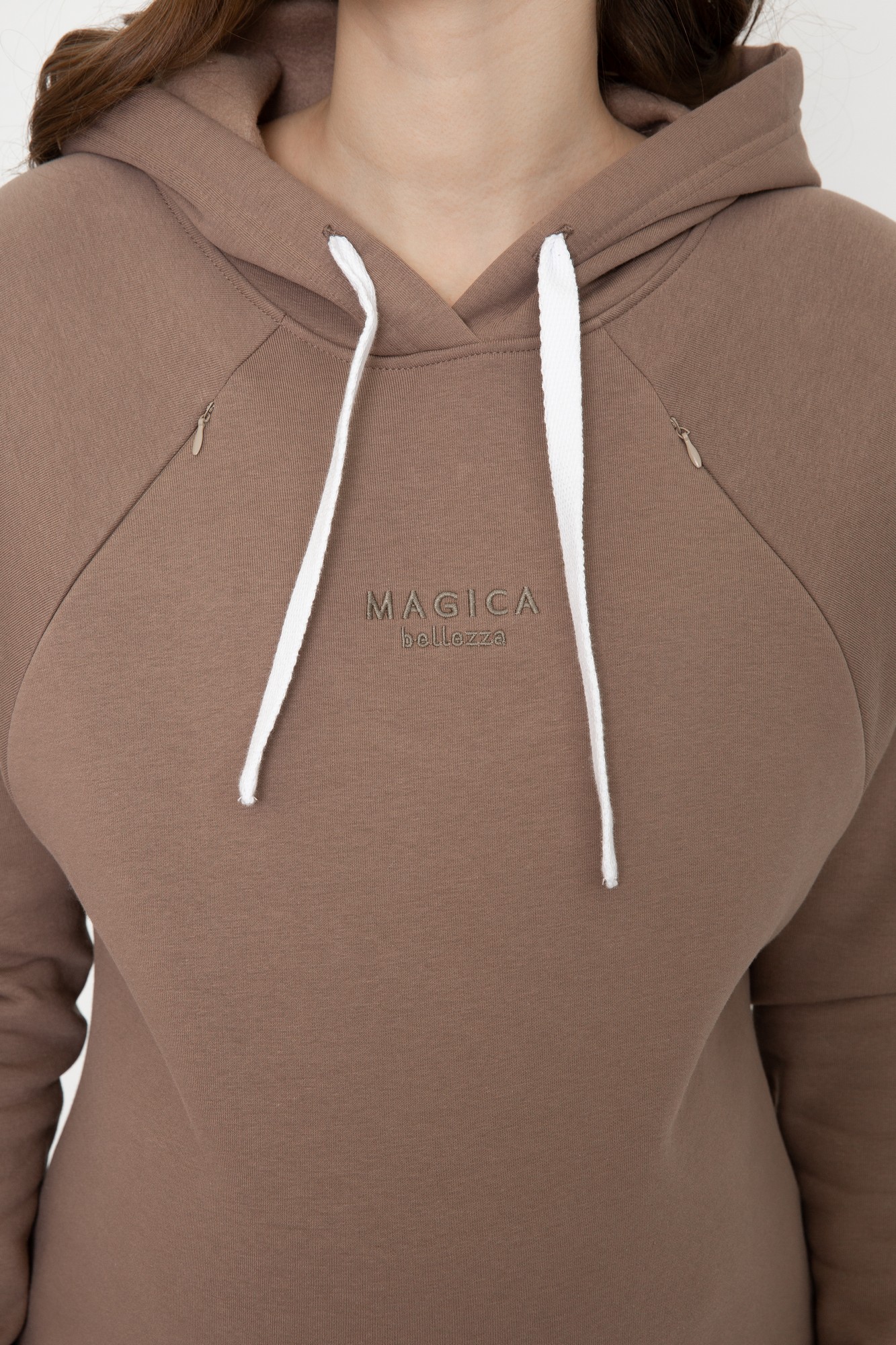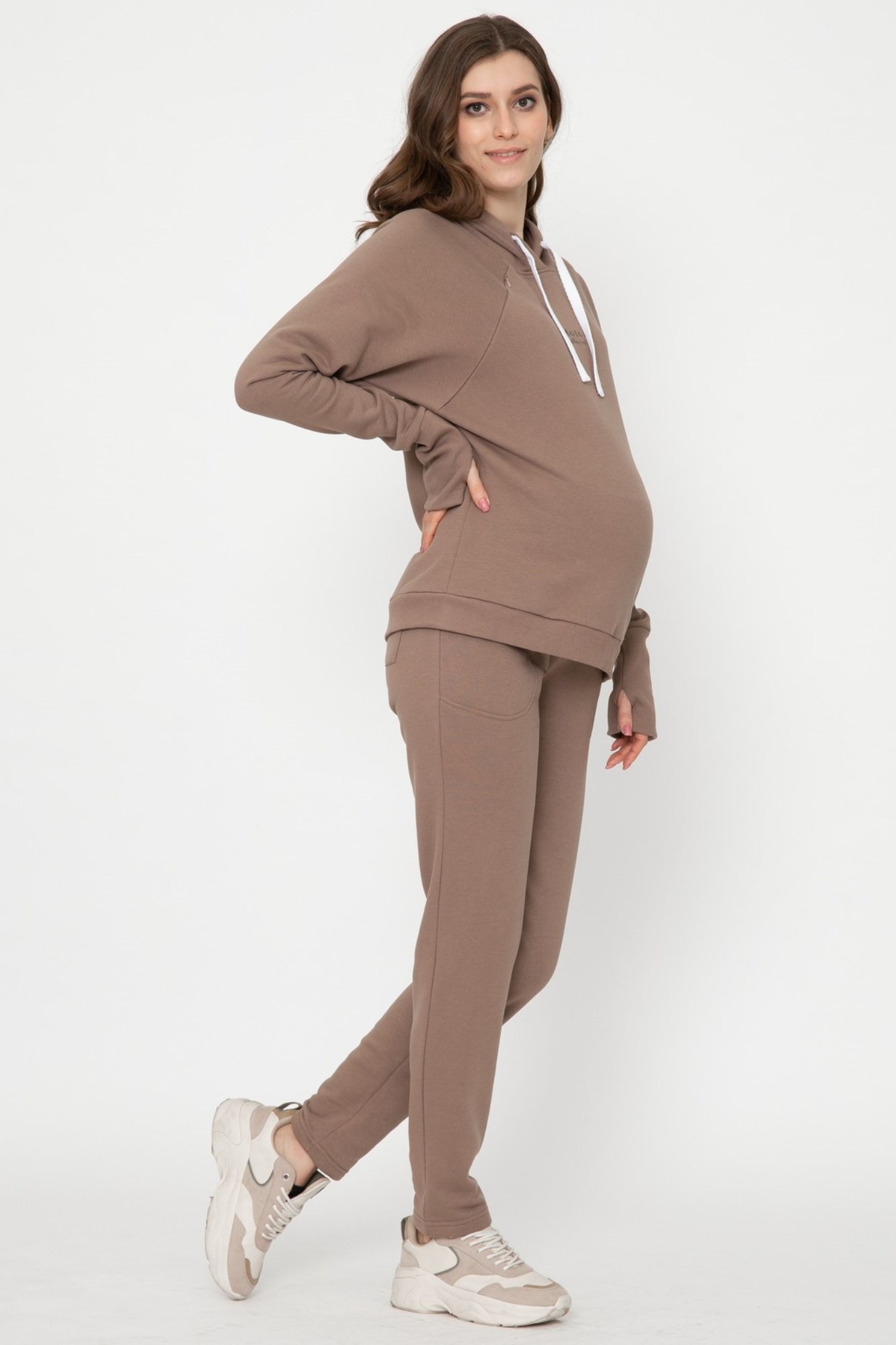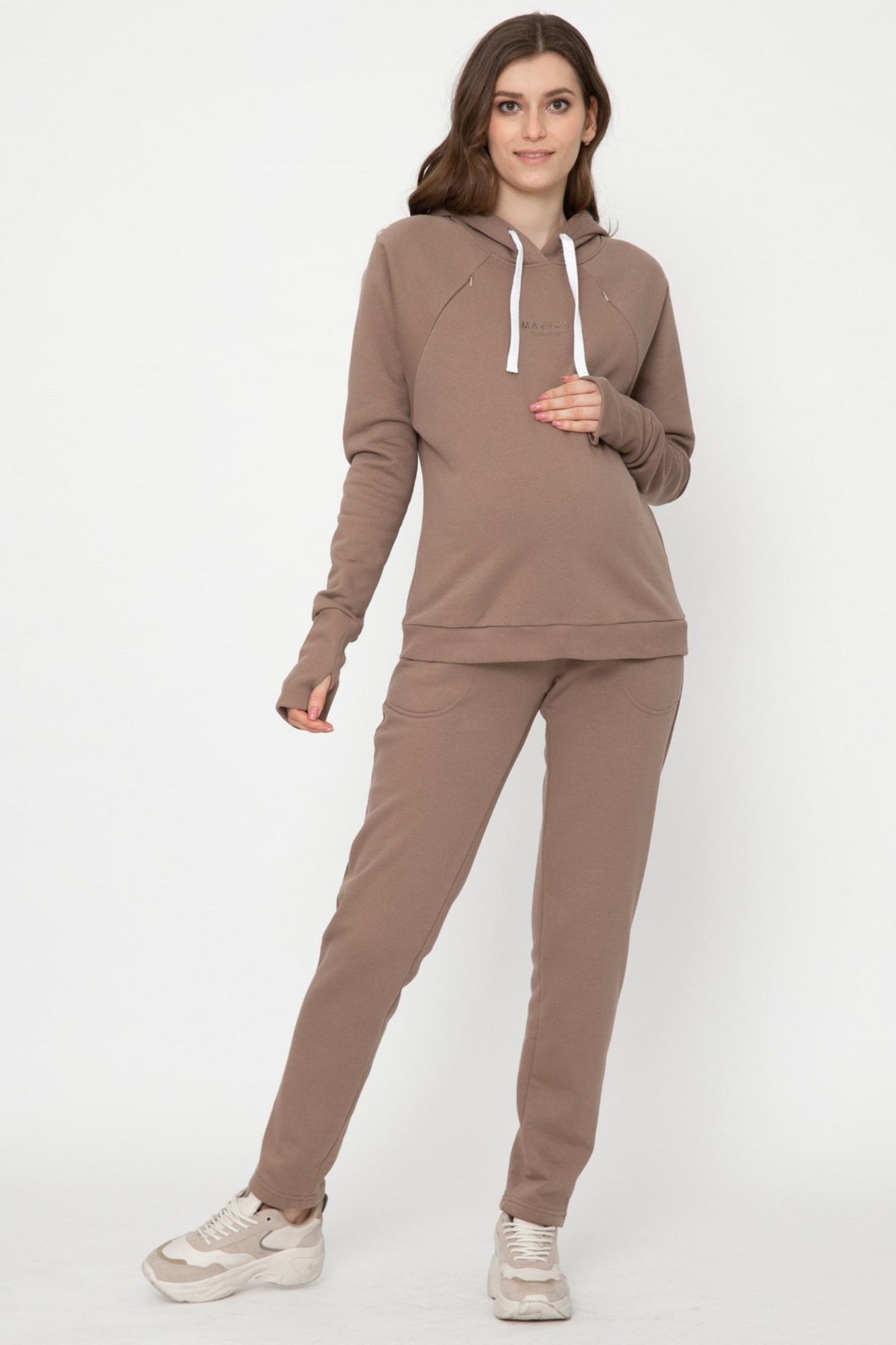 Утепленный спортивный костюм для беременных и кормящих выполнен из высококачественного трехниточного футера с начесом. Стильное худи согреет в прохладную погоду. Особый крой позволяет носить изделие на всем протяжении беременности и после нее. Благодаря диагональным потайным молниям Вы сможете покормить малыша с комфортом в любой ситуации. Брюки с эластичным поясом рассчитаны на любой срок беременности, не сдавливают и поддерживают растущий животик. Объем регулируется с помощью перфорированной резинки, перестегивающейся на пуговицу, продетой в пояс брюк.