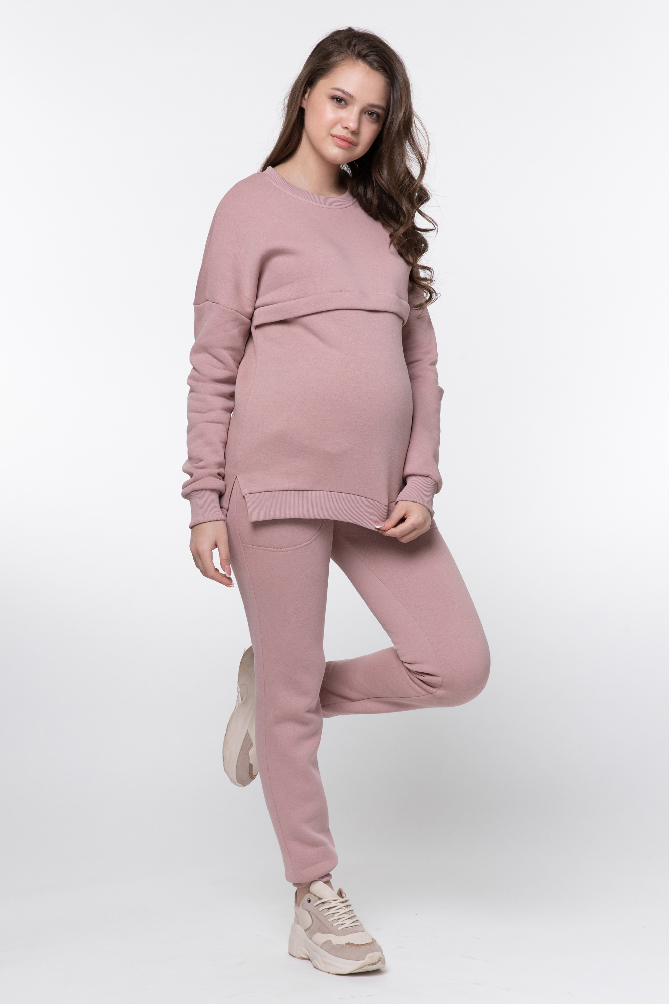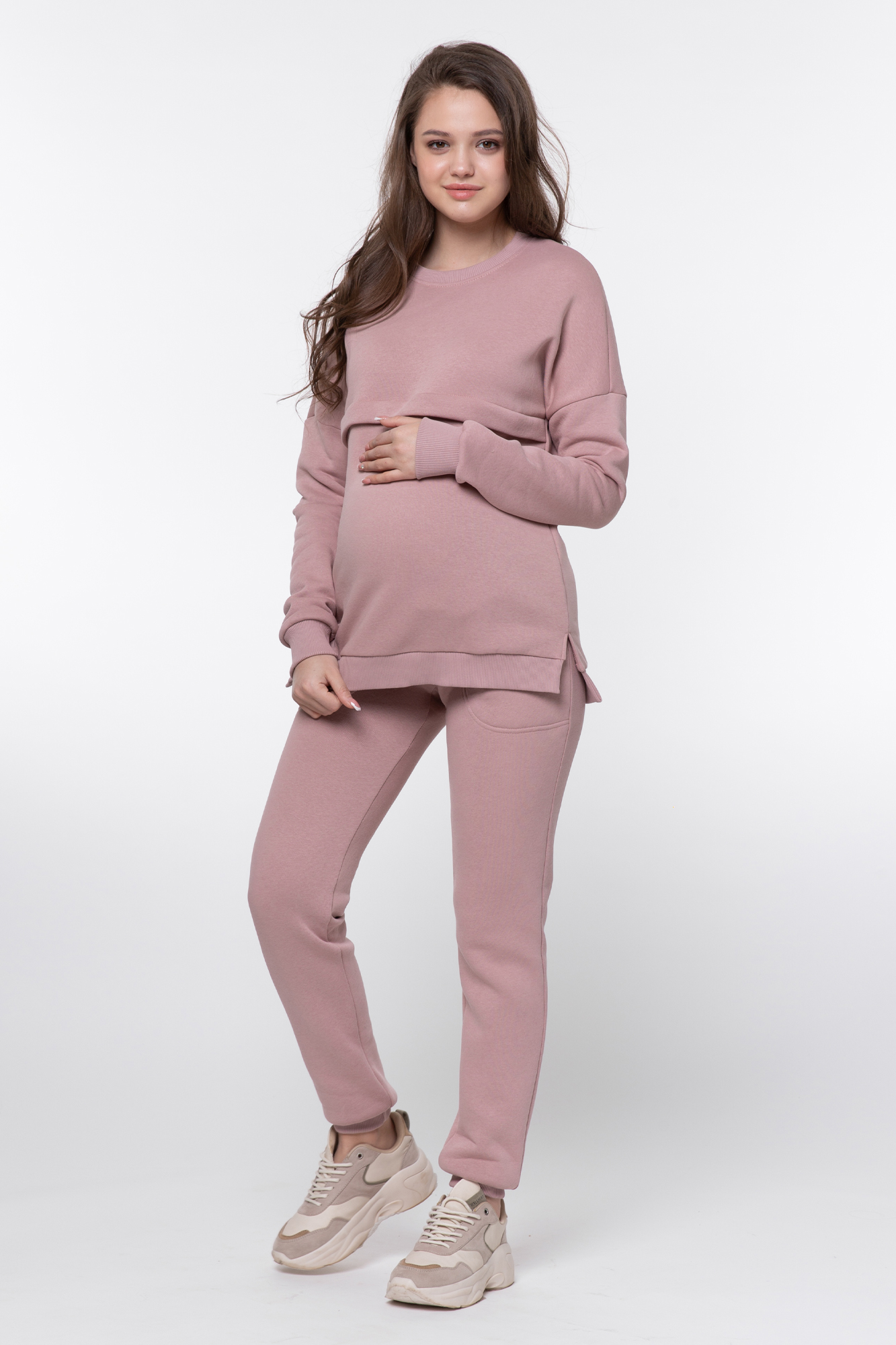 Утепленный костюм из трехниточного футера с начесом. Джемпер имеет «секрет» кормления – встречные горизонтальные потайные молнии – позволит покормить малыша с повышенным комфортом в любой ситуации. Округлый вырез горловины, удлиненная линия плеча, манжет по низу изделия и на рукавах. Брюки с высокой трикотажной вставкой предназначены для ношения в период беременности и после родов. Объем регулируется при помощи перфорированной резинки, перестегивающейся на пуговицу, продетой в пояс брюк. Костюм подойдет для прогулок, занятий спортом и в качестве домашней одежды.