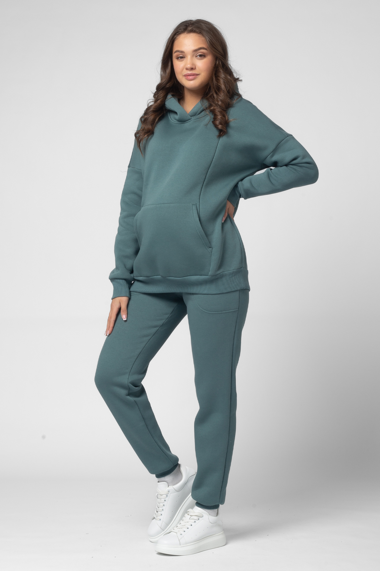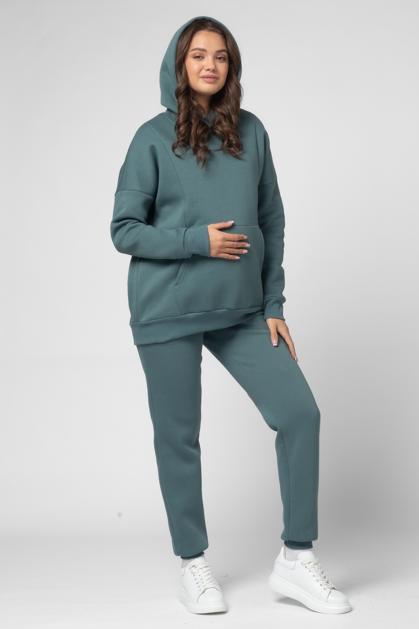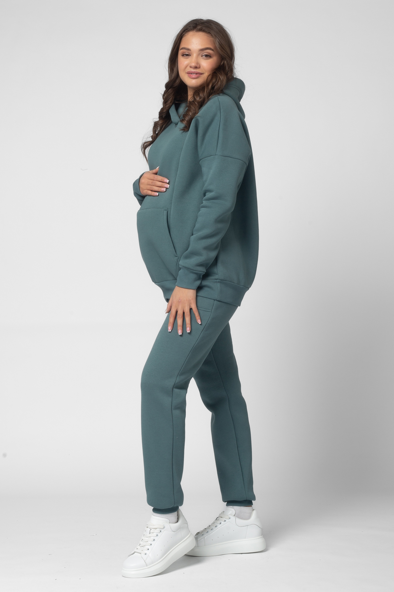 Утепленный спортивный костюм для беременных и кормящих выполнен из высококачественного трехниточного футера с начесом. Стильное теплое худи для будущих мам согреет в прохладную погоду. Особый крой позволяет носить изделие на всем протяжении беременности и после нее. Благодаря диагональным потайным молниям Вы сможете покормить малыша с комфортом в любой ситуации. Брюки с эластичным поясом рассчитаны на любой срок беременности, не сдавливают и поддерживают растущий животик. Объем регулируется с помощью перфорированной резинки, перестегивающейся на пуговицу, продетой в пояс брюк. Костюм подходит для спорта, для прогулок и просто в качестве домашней одежды.