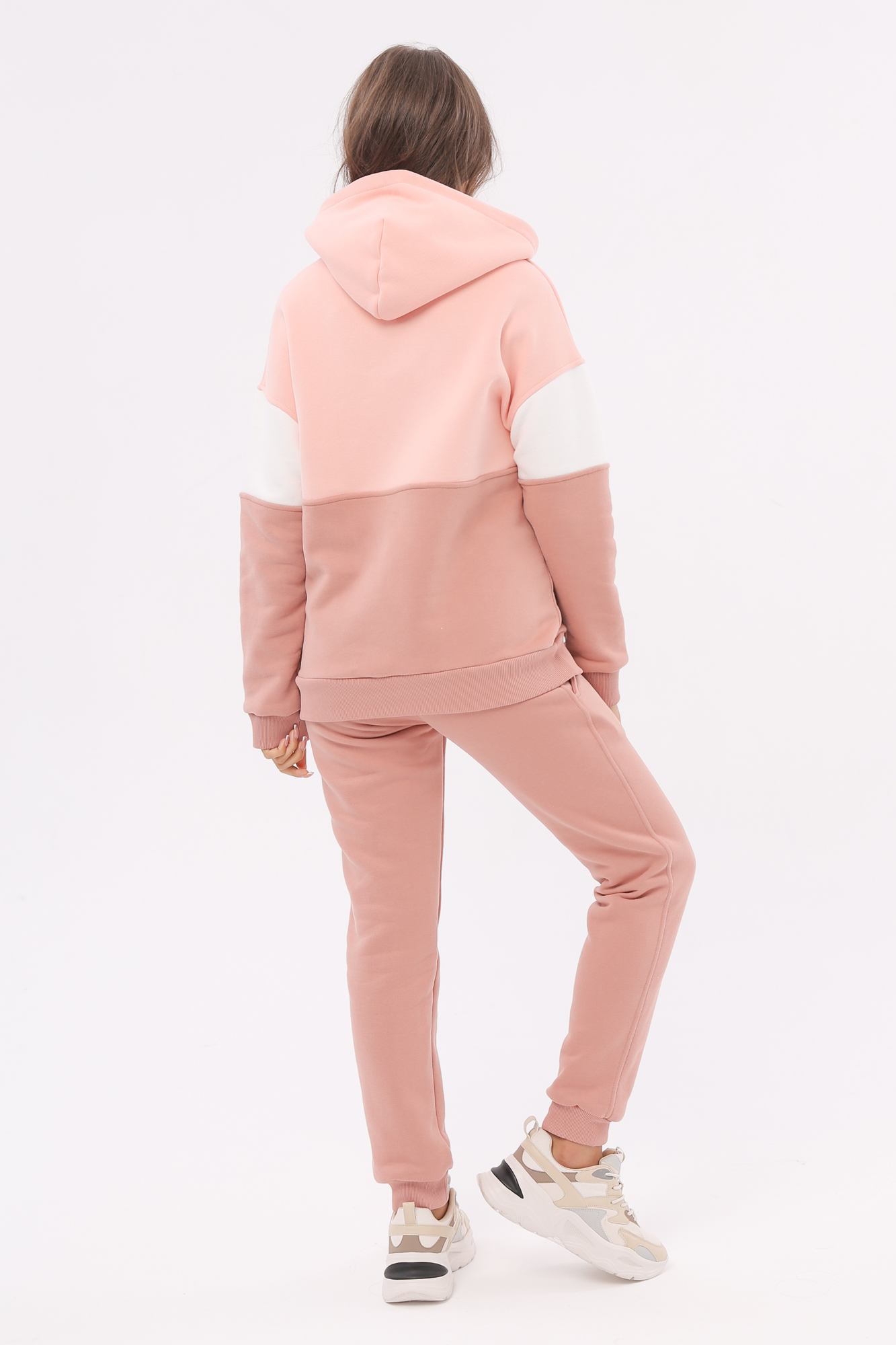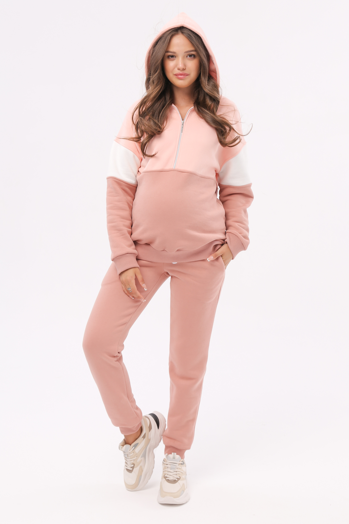 Утепленный спортивный костюм для беременных и кормящих выполнен из высококачественного футера велюра с начесом. Худи в стиле колорблок с манжетами по низу изделия и на рукавах. Вертикальная молния на уровне груди позволяет покормить малыша в любой ситуации. Особый крой позволяет носить изделие на всем протяжении беременности и после нее. Брюки с лампасами и эластичным поясом рассчитаны на любой срок беременности, не сдавливают и поддерживают растущий животик. Объем регулируется с помощью перфорированной резинки, перестегивающейся на пуговицу, продетой в пояс брюк.