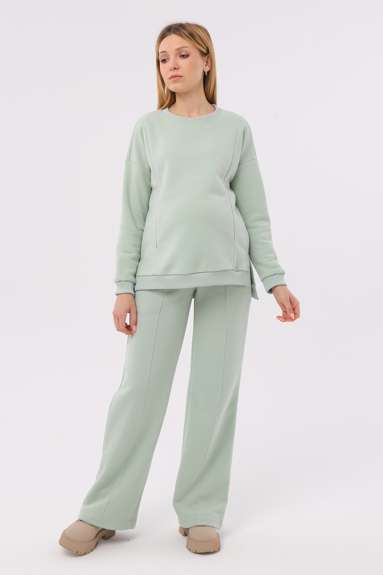 Утепленный костюм для беременных выполнен из трехниточного футера - пенье с мягким начесом-велюром. Хлопковая ткань отличается высокой плотностью в сочетании с мягкостью. В комплект входит два изделия - толстовка и штаны. Свитшот прямого кроя, с длинным рукавом на манжетах. На груди по бокам предусмотрены вертикальные скрытые молнии для комфортного кормления. Штаны оверсайз с высокой посадкой оснащены широким поясом для живота. Объем вставки регулируется за счет резинки на пуговице, поэтому костюм подходит для ношения на любом месяце беременности и после родов. Теплый костюм для будущих и кормящих мам подойдет для поездки и прогулки, для занятий спортом и для дома.