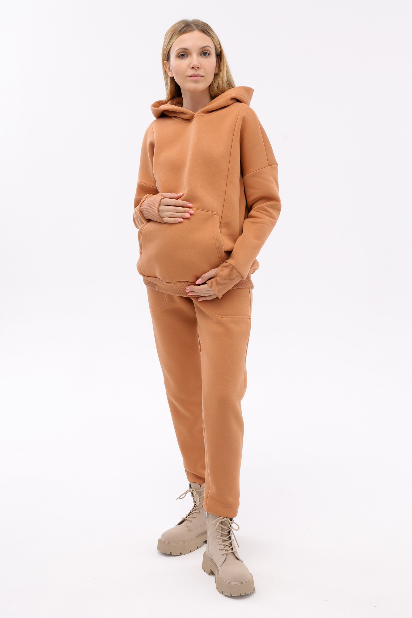 Утепленный спортивный костюм для беременных и кормящих выполнен из высококачественного трехниточного футера с начесом (пенье). Стильное теплое худи с капюшоном и карманом кенгуру для будущих мам согреет в прохладную погоду. Особый крой позволяет носить изделие на всем протяжении беременности и после нее. Благодаря диагональным потайным молниям для кормления Вы сможете покормить малыша с комфортом в любой ситуации. Брюки с высокой посадкой и эластичным поясом рассчитаны на любой срок беременности, не сдавливают и поддерживают растущий животик. Объем регулируется с помощью перфорированной резинки, перестегивающейся на пуговицу, продетой в пояс брюк. Костюм подходит для спорта, для прогулок и просто в качестве домашней одежды. Идеальный вариант для ношения в сезон осень-зима.