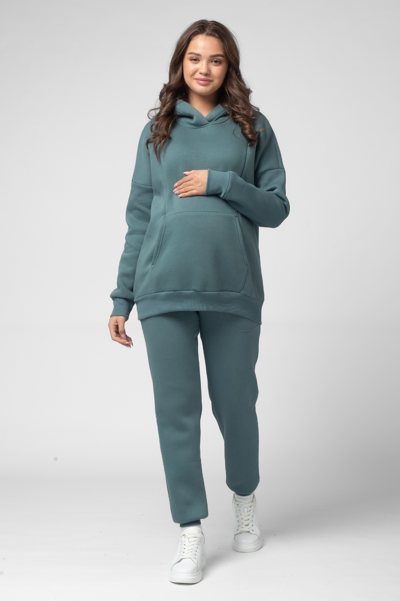 Утепленный спортивный костюм для беременных и кормящих выполнен из высококачественного трехниточного футера с начесом. Стильное теплое худи для будущих мам согреет в прохладную погоду. Особый крой позволяет носить изделие на всем протяжении беременности и после нее. Благодаря диагональным потайным молниям Вы сможете покормить малыша с комфортом в любой ситуации. Брюки с эластичным поясом рассчитаны на любой срок беременности, не сдавливают и поддерживают растущий животик. Объем регулируется с помощью перфорированной резинки, перестегивающейся на пуговицу, продетой в пояс брюк. Костюм подходит для спорта, для прогулок и просто в качестве домашней одежды.