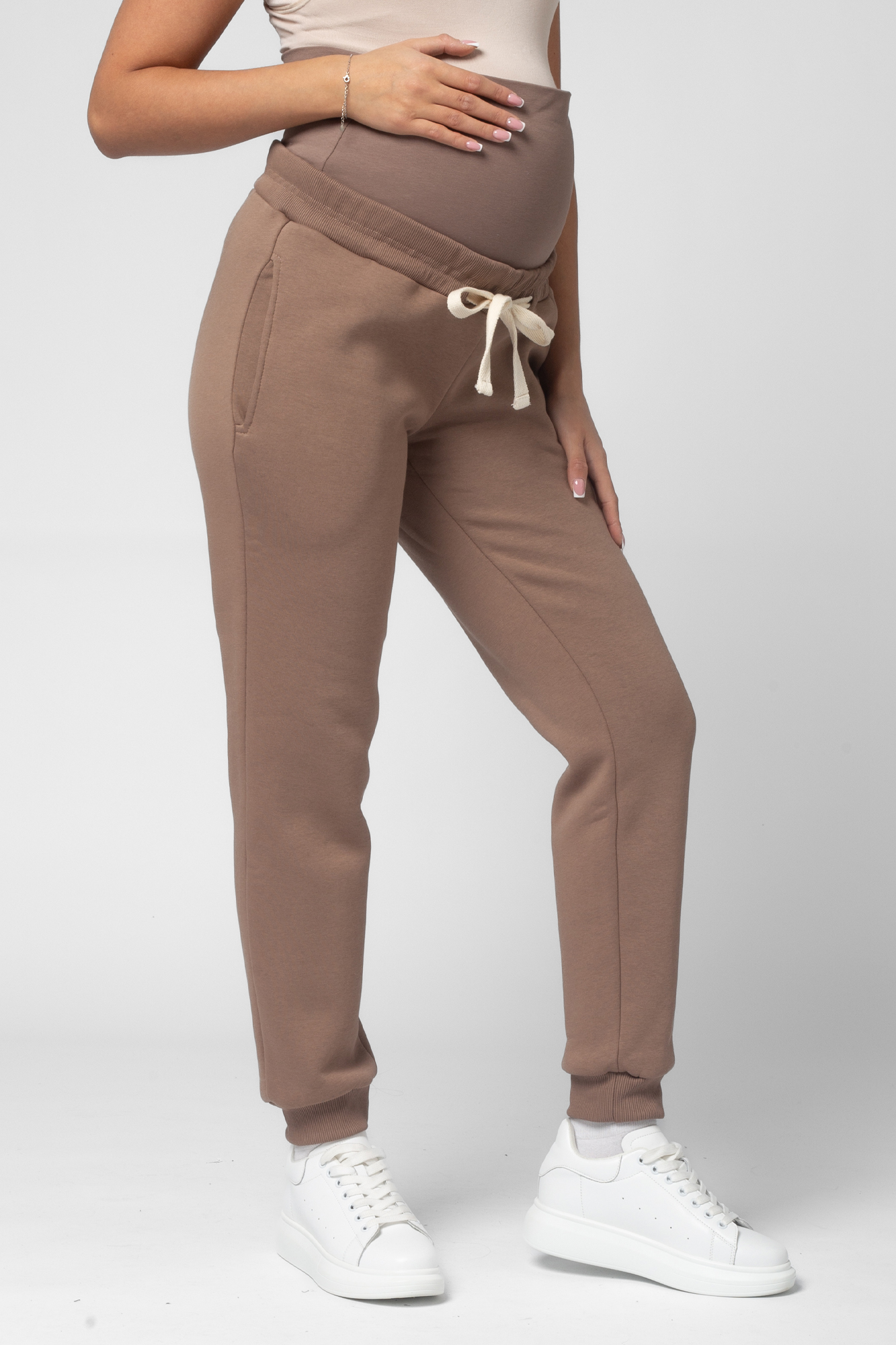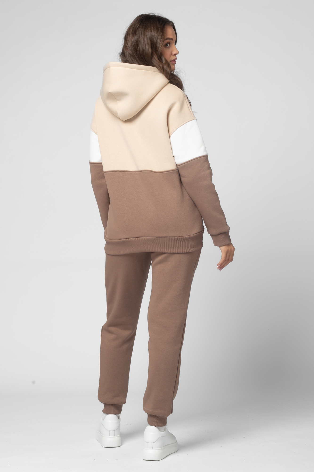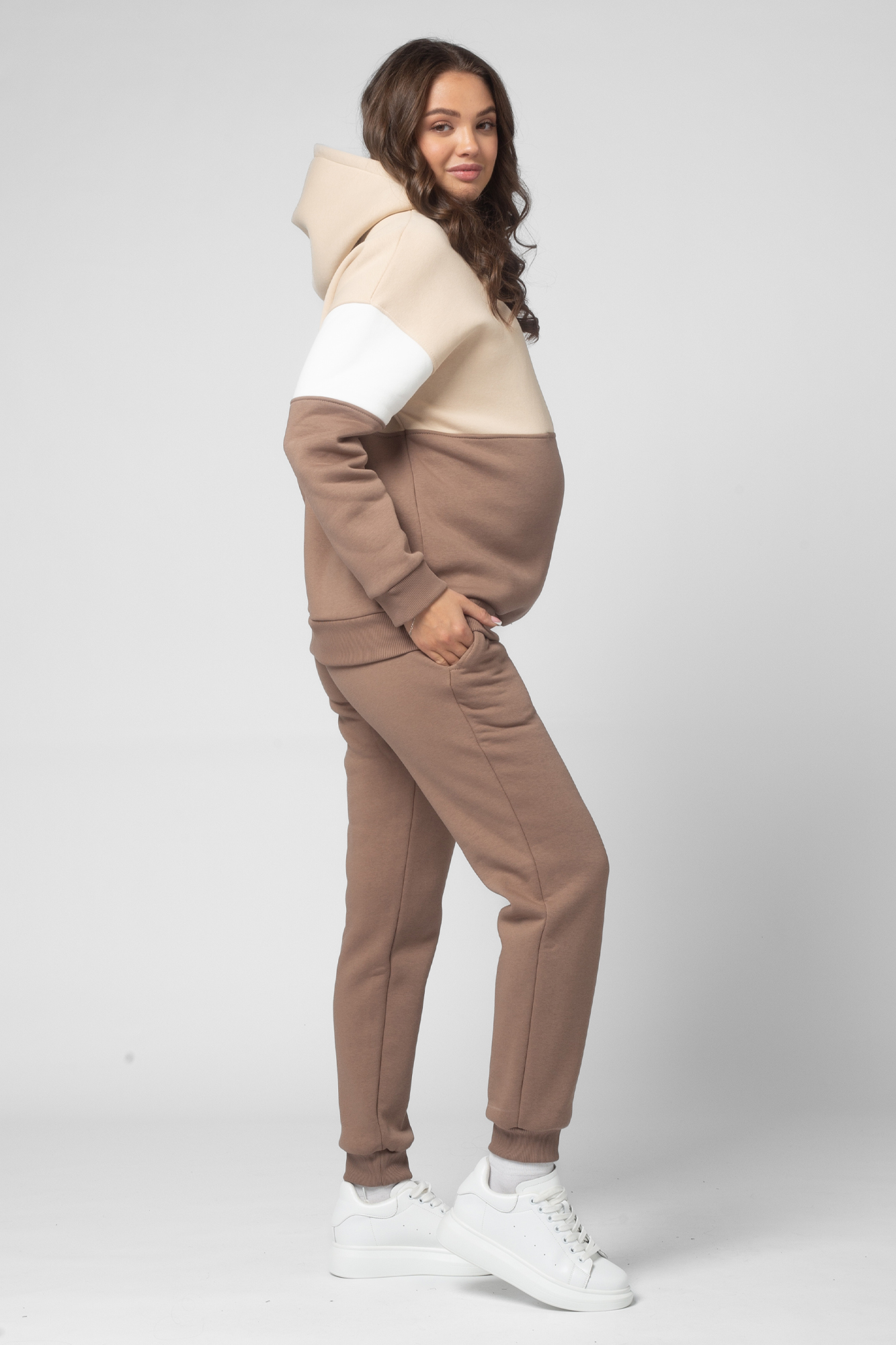 Утепленный спортивный костюм для беременных и кормящих выполнен из высококачественного трехниточного футера с начесом. Худи в стиле колорблок с манжетами по низу изделия и на рукавах. Вертикальная молния на уровне груди позволяет покормить малыша в любой ситуации. Особый крой позволяет носить изделие на всем протяжении беременности и после нее. Брюки с лампасами и эластичным поясом рассчитаны на любой срок беременности, не сдавливают и поддерживают растущий животик. Объем регулируется с помощью перфорированной резинки, перестегивающейся на пуговицу, продетой в пояс брюк.