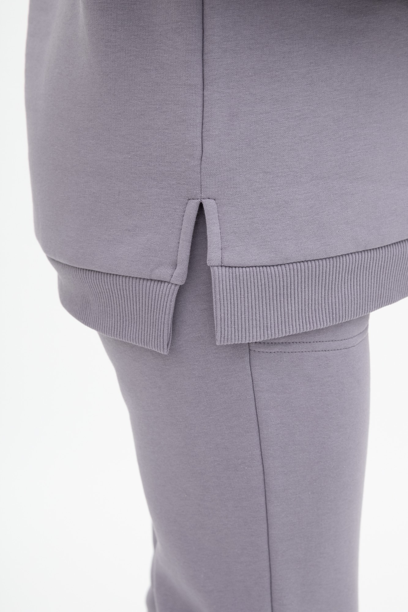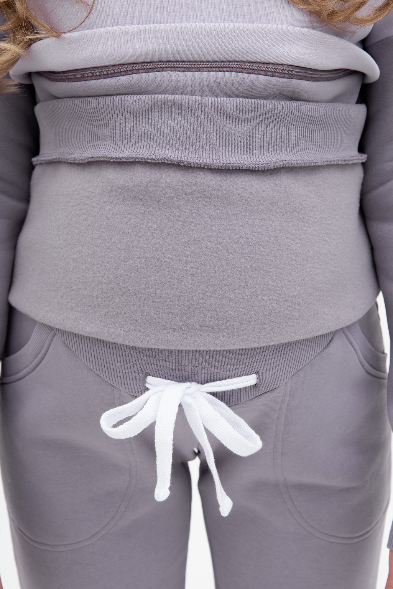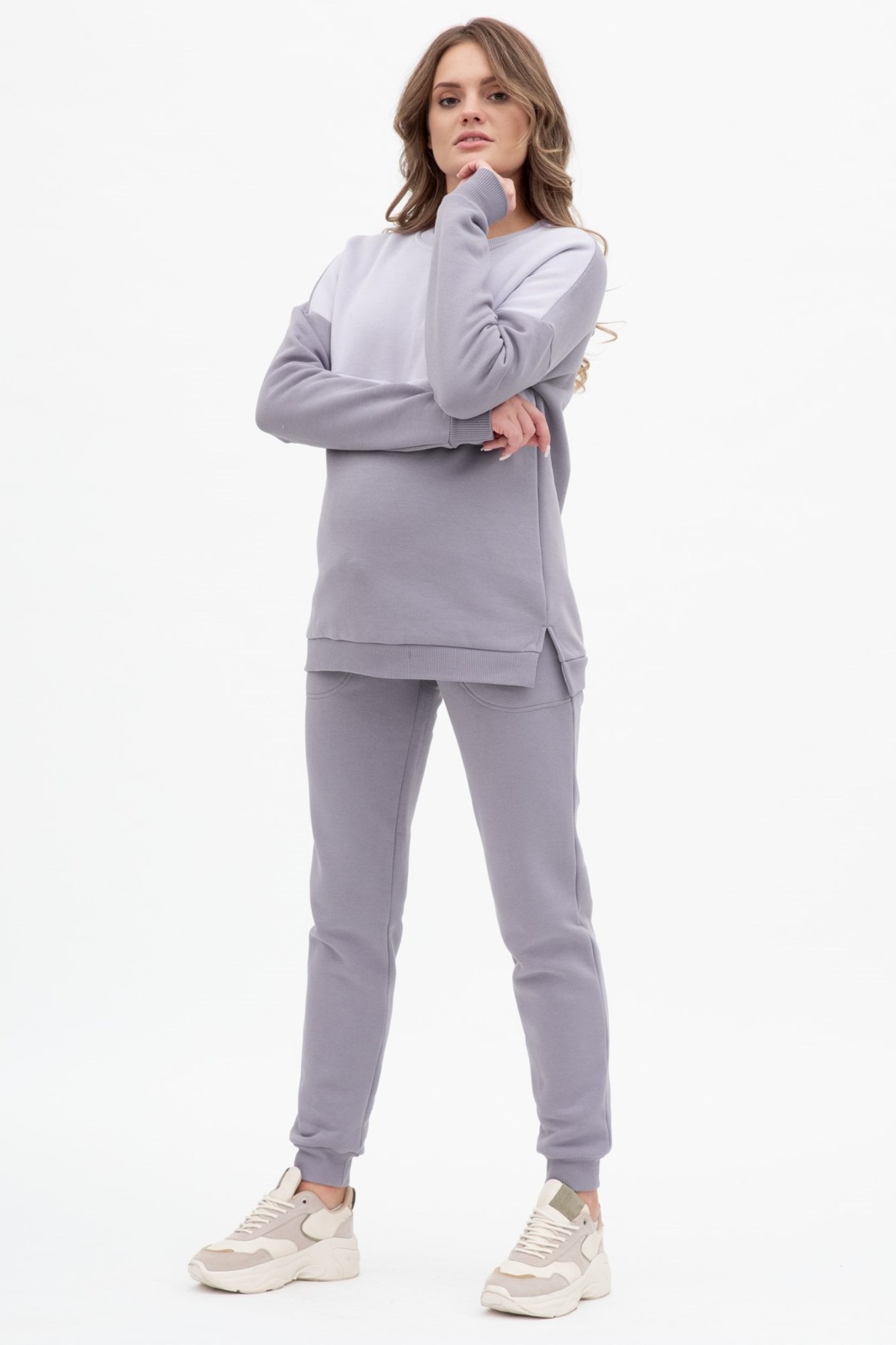 Утепленный костюм из трехниточного футера с начесом. Джемпер имеет «секрет» кормления – встречные горизонтальные потайные молнии – позволит покормить малыша с повышенным комфортом в любой ситуации. Округлый вырез горловины, удлиненная линия плеча, манжет по низу изделия и на рукавах. Брюки с высокой трикотажной вставкой предназначены для ношения в период беременности и после родов. Объем регулируется при помощи перфорированной резинки, перестегивающейся на пуговицу, продетой в пояс брюк. Костюм подойдет для прогулок, занятий спортом и в качестве домашней одежды.