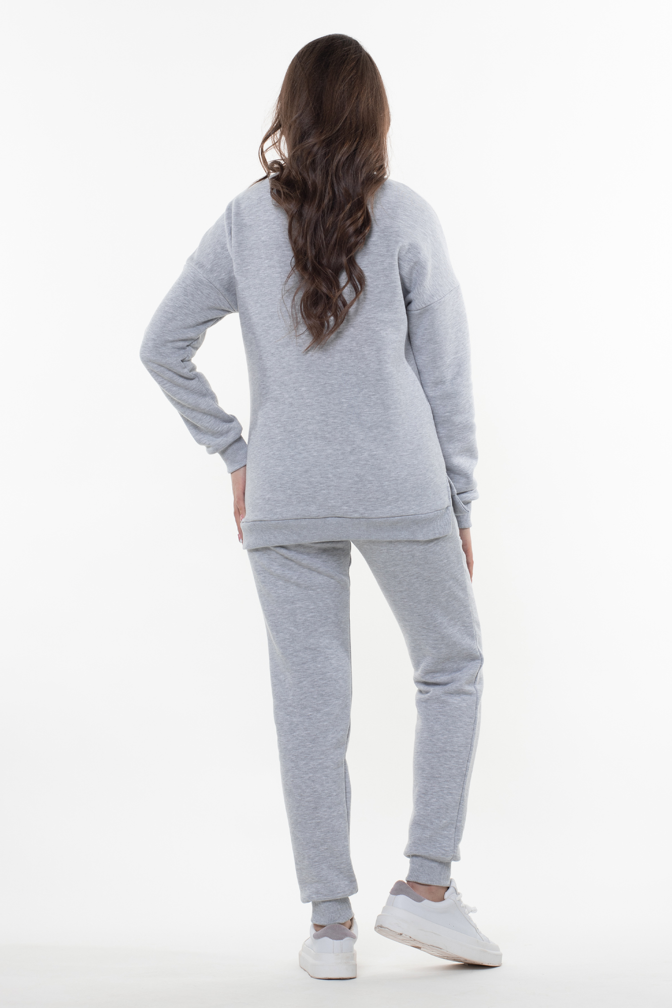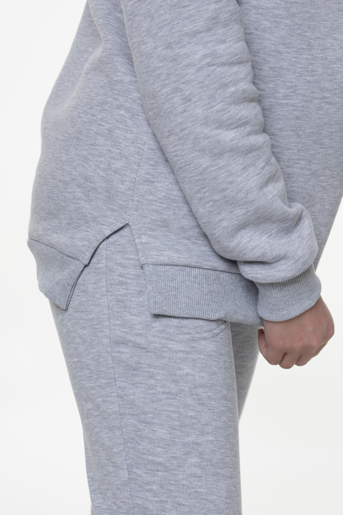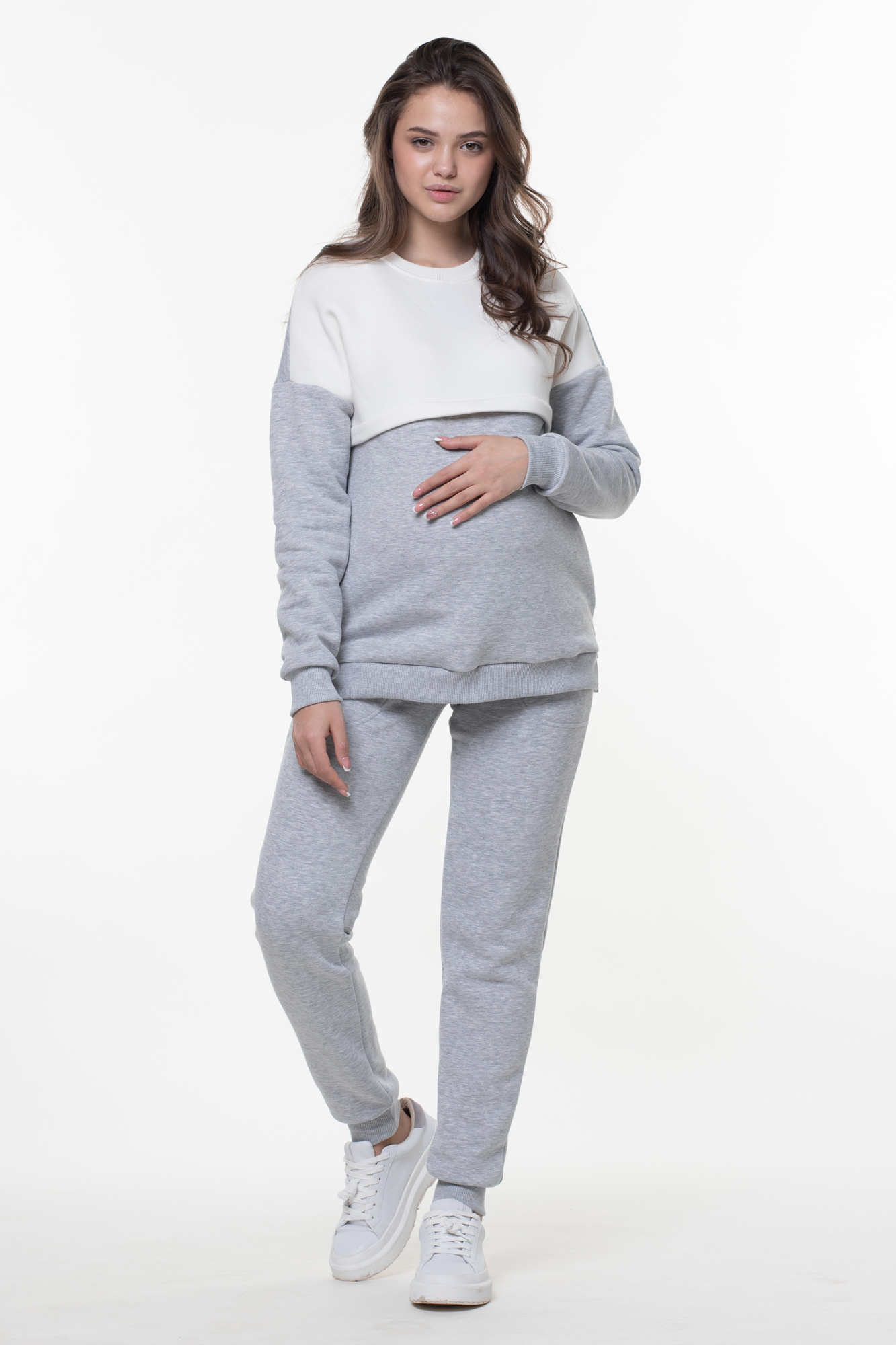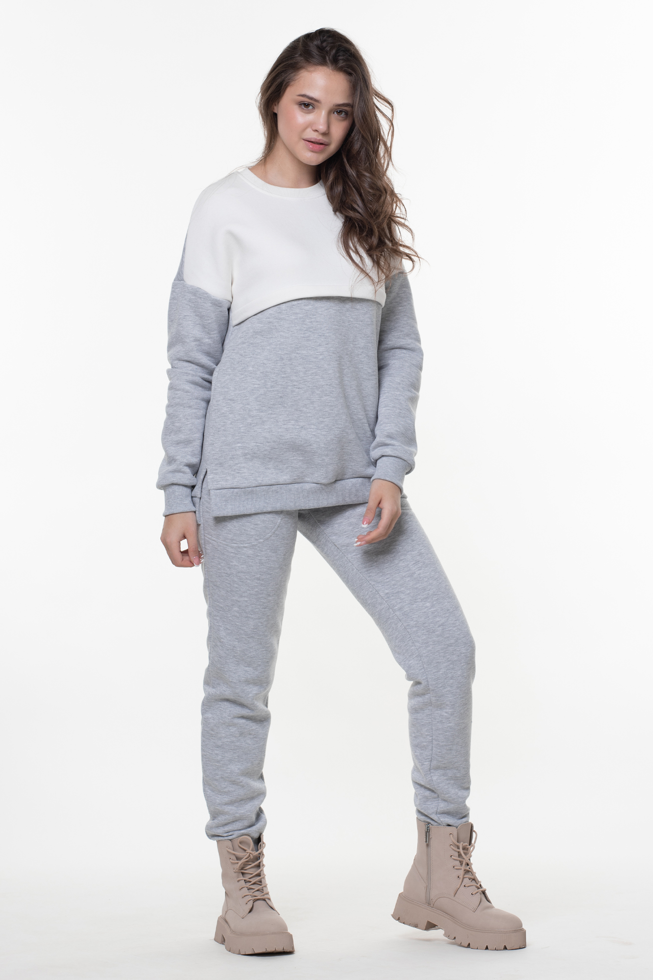 Утепленный костюм из трехниточного футера с начесом. Джемпер имеет «секрет» кормления – встречные горизонтальные потайные молнии – позволит покормить малыша с повышенным комфортом в любой ситуации. Округлый вырез горловины, удлиненная линия плеча, манжет по низу изделия и на рукавах. Брюки с высокой трикотажной вставкой предназначены для ношения в период беременности и после родов. Объем регулируется при помощи перфорированной резинки, перестегивающейся на пуговицу, продетой в пояс брюк. Костюм подойдет для прогулок, занятий спортом и в качестве домашней одежды.