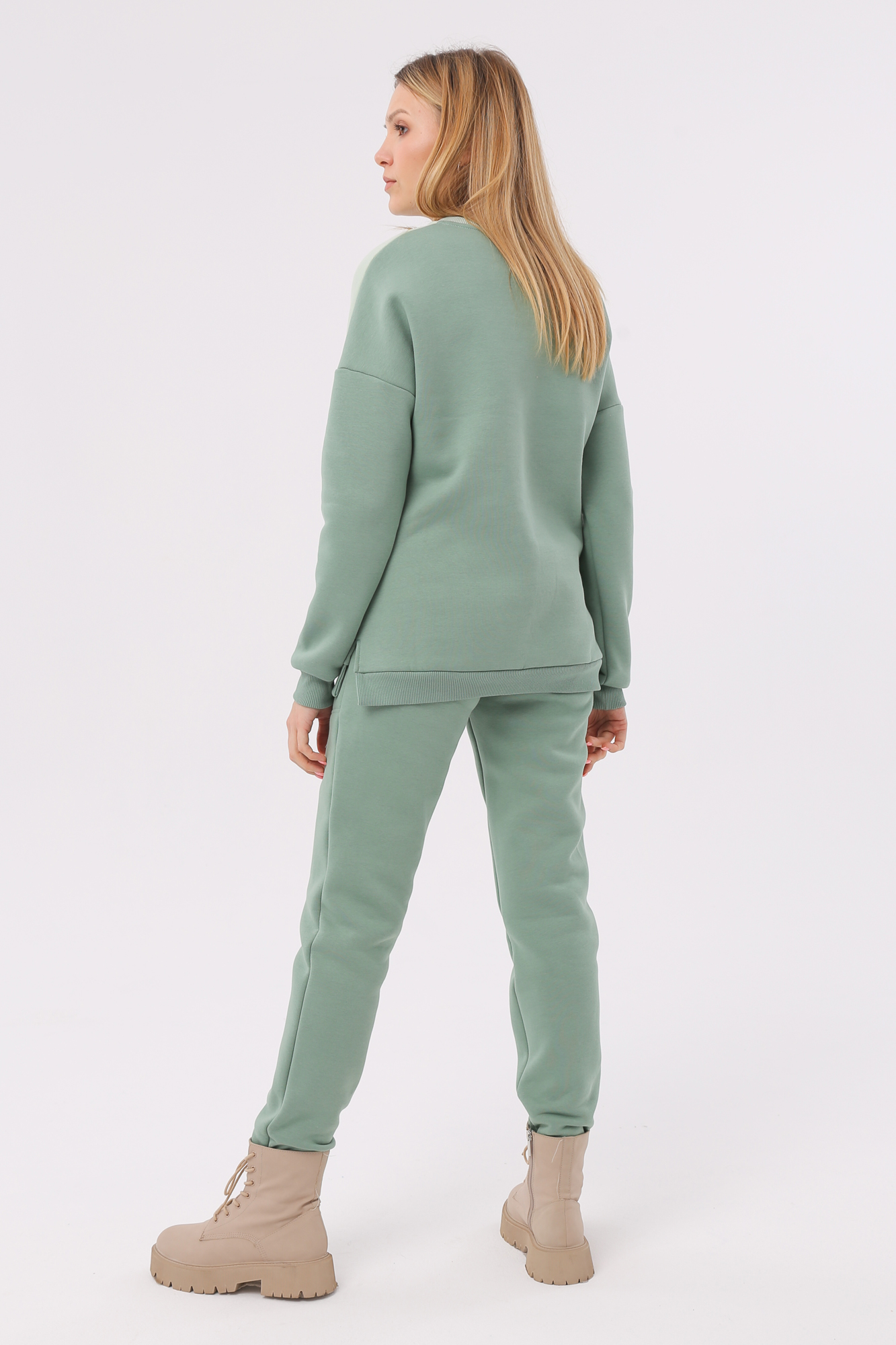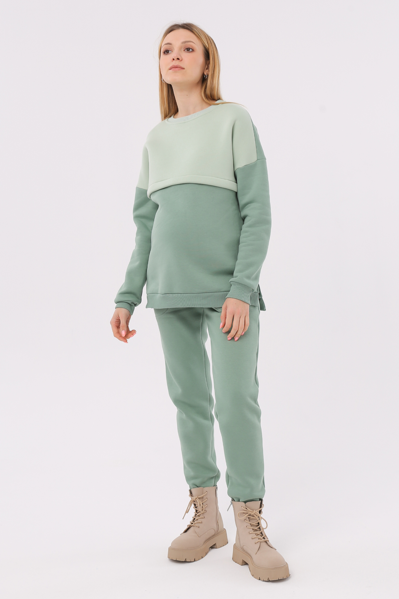 Утепленный костюм из трехниточного футера с начесом. Джемпер имеет «секрет» кормления – встречные горизонтальные потайные молнии – позволит покормить малыша с повышенным комфортом в любой ситуации. Округлый вырез горловины, удлиненная линия плеча, манжет по низу изделия и на рукавах. Брюки с высокой трикотажной вставкой предназначены для ношения в период беременности и после родов. Объем регулируется при помощи перфорированной резинки, перестегивающейся на пуговицу, продетой в пояс брюк. Костюм подойдет для прогулок, занятий спортом и в качестве домашней одежды.