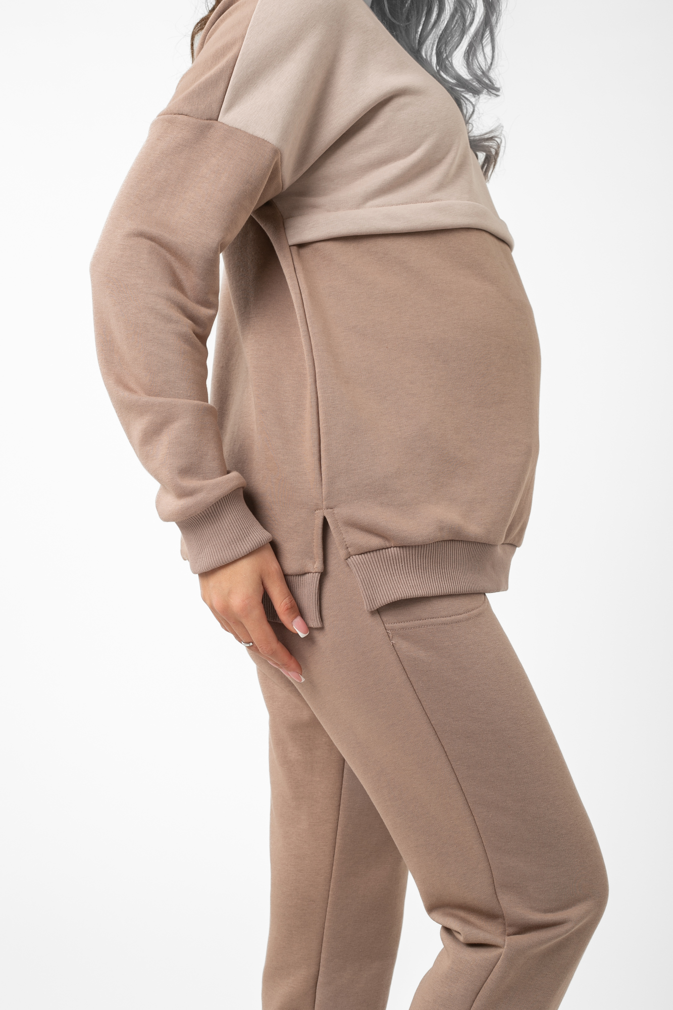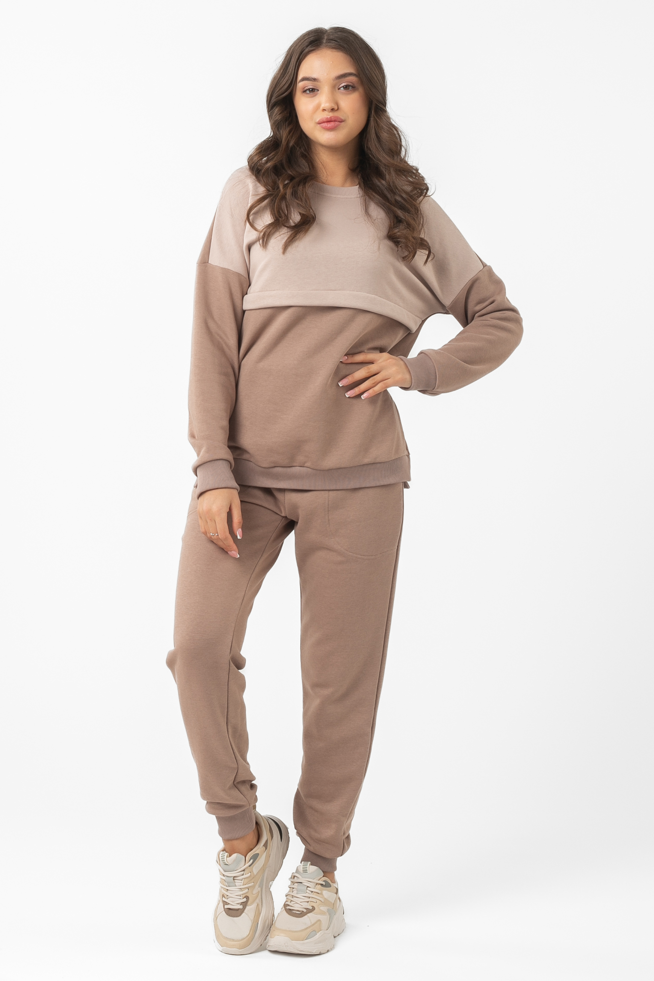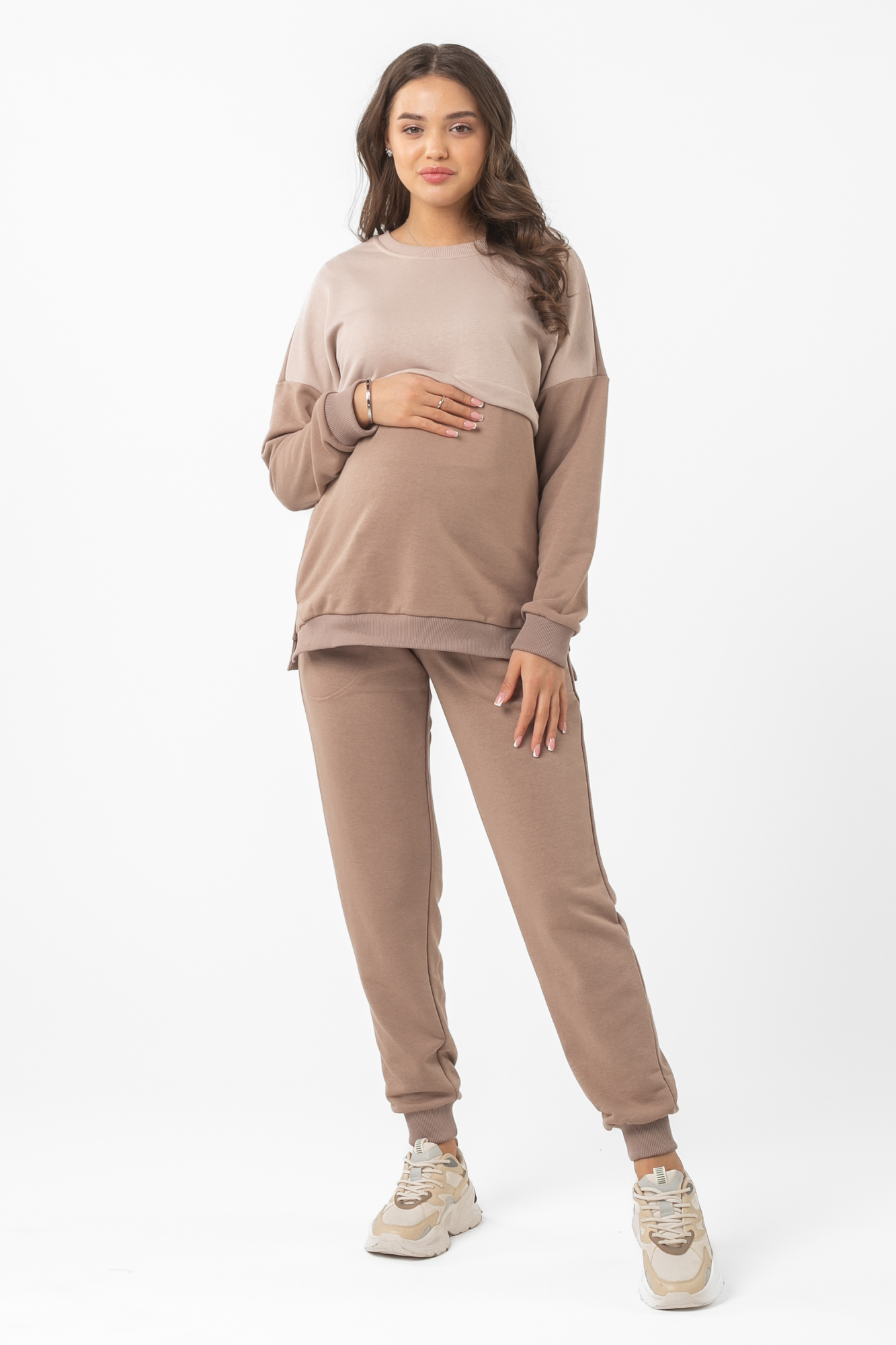 Спортивный костюм из высококачественного трехниточного футера (петля). Свитшот имеет «секрет» кормления – встречные горизонтальные потайные молнии – позволит покормить малыша с повышенным комфортом в любой ситуации. Округлый вырез горловины, удлиненная линия плеча, манжет по низу изделия и на рукавах. Брюки с высокой трикотажной вставкой предназначены для ношения в период беременности и после родов. Объем регулируется при помощи перфорированной резинки, перестегивающейся на пуговицу, продетой в пояс брюк. Костюм подойдет для прогулок, занятий спортом и в качестве домашней одежды.