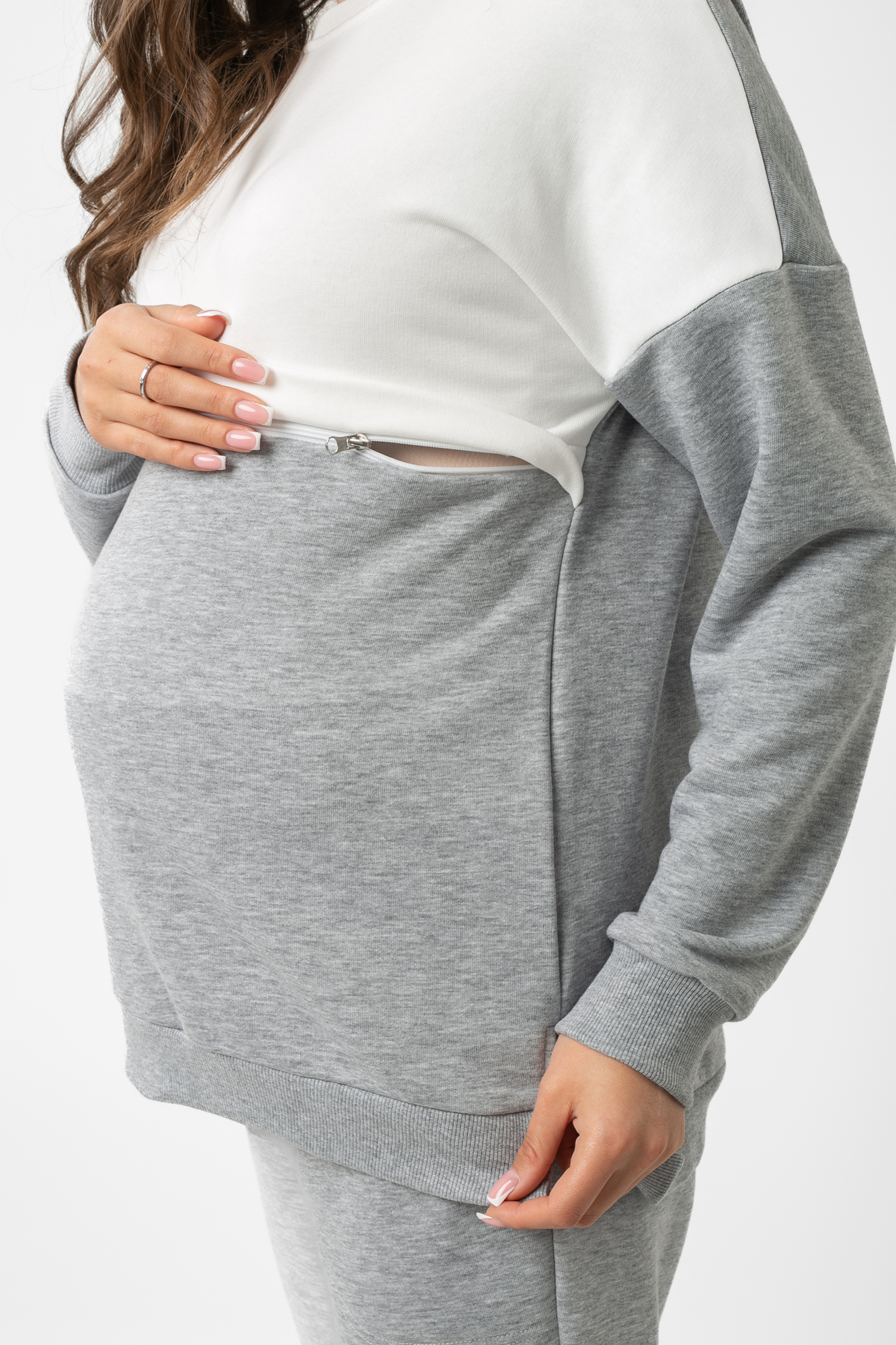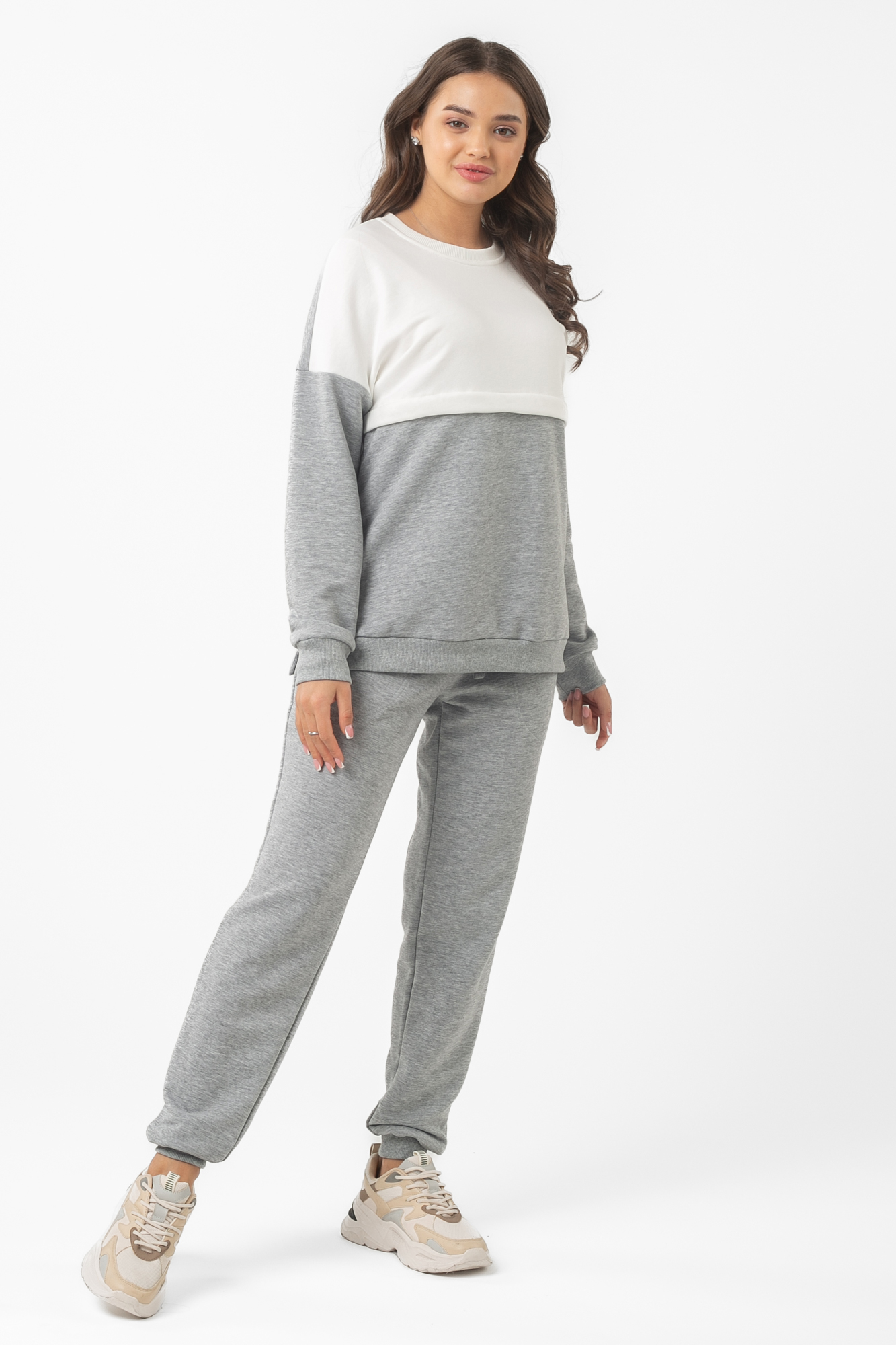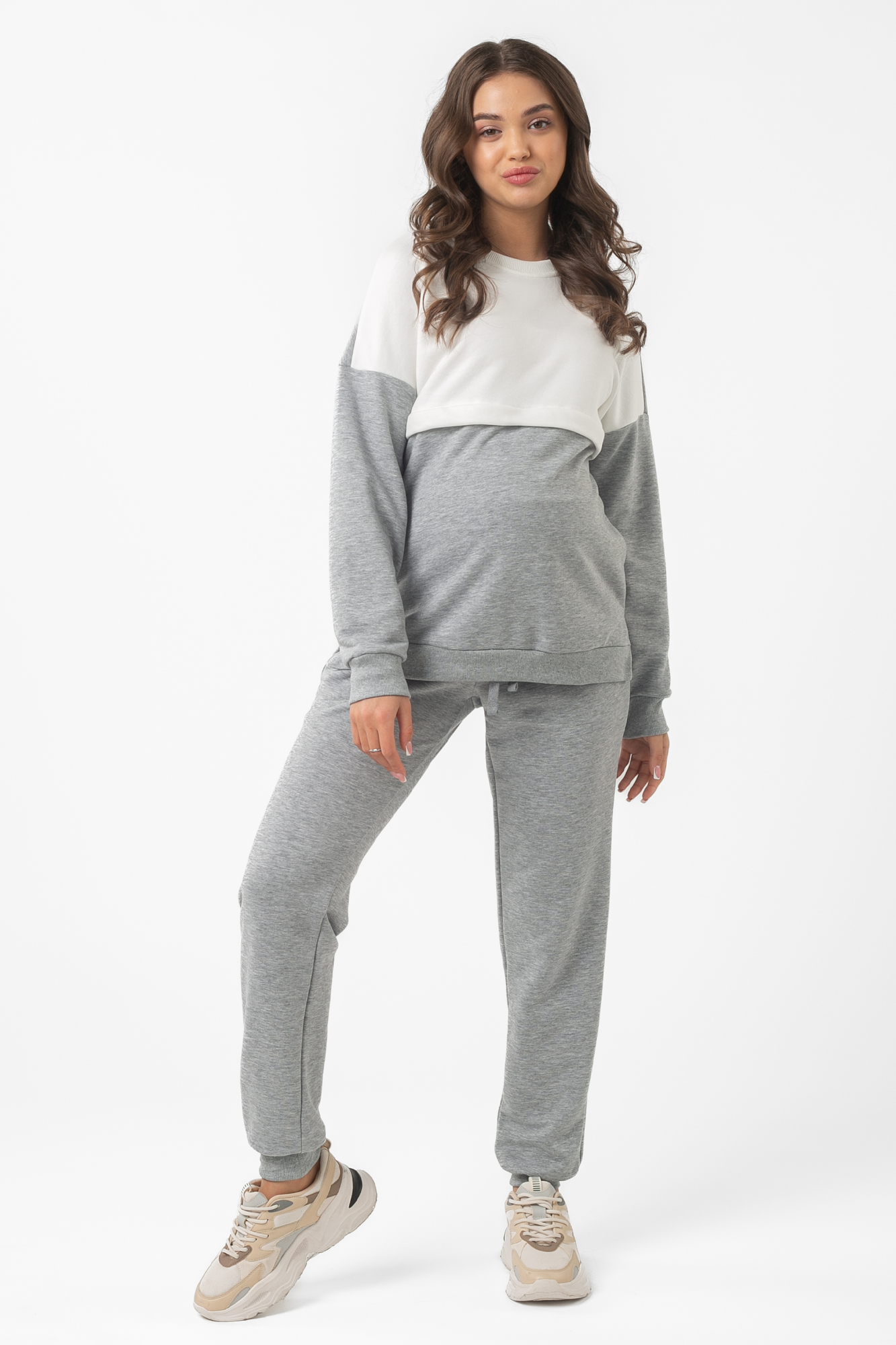 Спортивный костюм из высококачественного трехниточного футера (петля). Свитшот имеет «секрет» кормления – встречные горизонтальные потайные молнии – позволит покормить малыша с повышенным комфортом в любой ситуации. Округлый вырез горловины, удлиненная линия плеча, манжет по низу изделия и на рукавах. Брюки с высокой трикотажной вставкой предназначены для ношения в период беременности и после родов. Объем регулируется при помощи перфорированной резинки, перестегивающейся на пуговицу, продетой в пояс брюк. Костюм подойдет для прогулок, занятий спортом и в качестве домашней одежды.