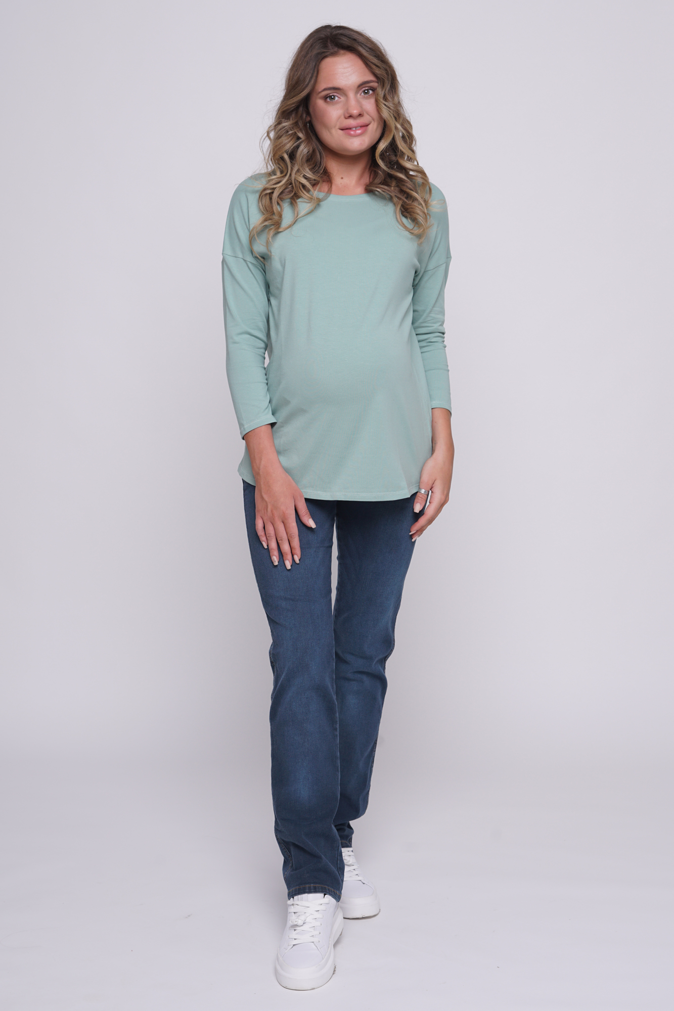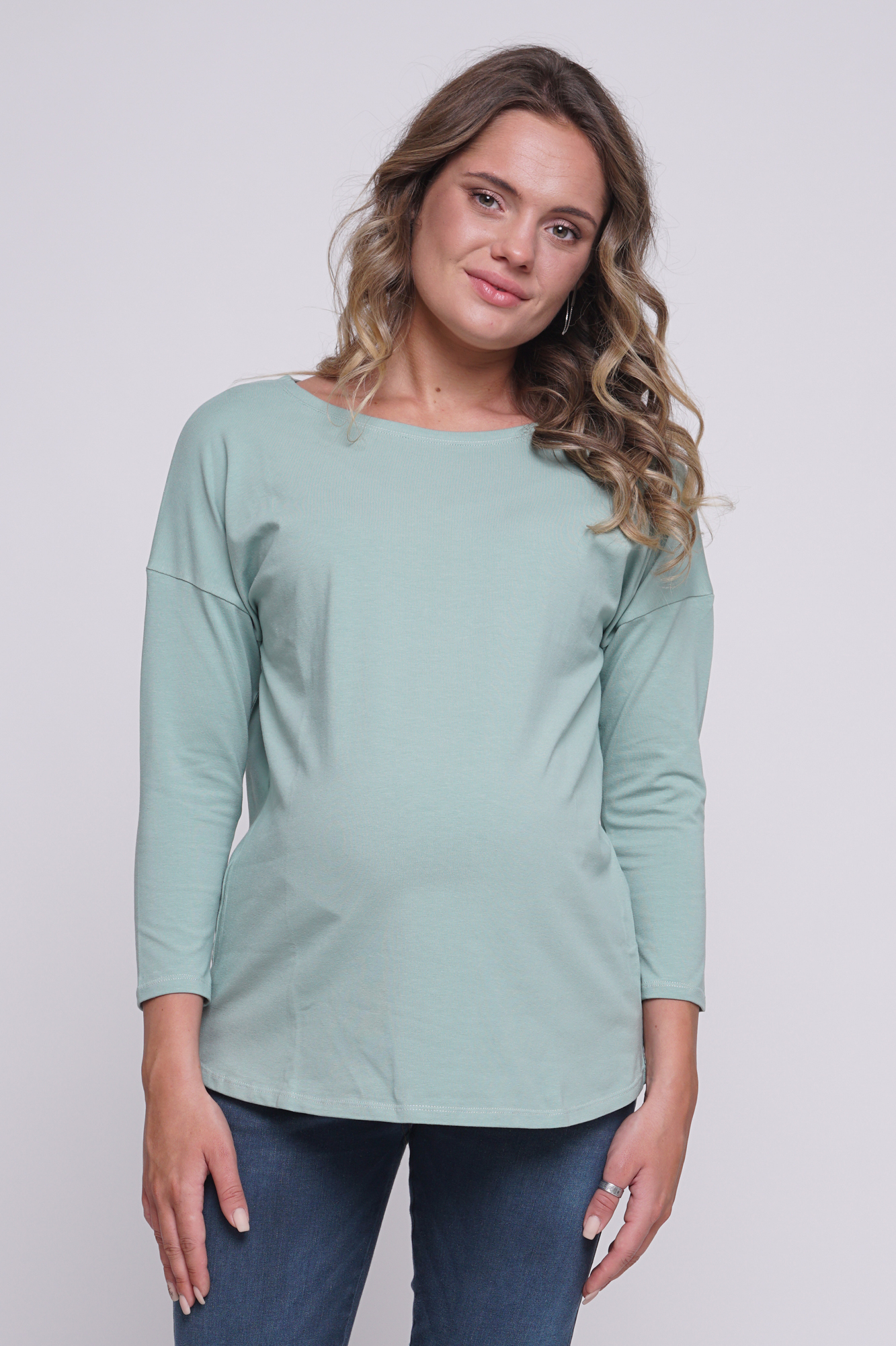 Стильный лонгслив свободного кроя для беременных. Натуральный материал подарит приятные тактильные ощущения и обеспечит комфорт будущей маме и малышу. Детали: округлый вырез горловины, удлиненная линия плеча, рукав 3/4. Великолепная посадка на всем протяжении беременности и после родов.