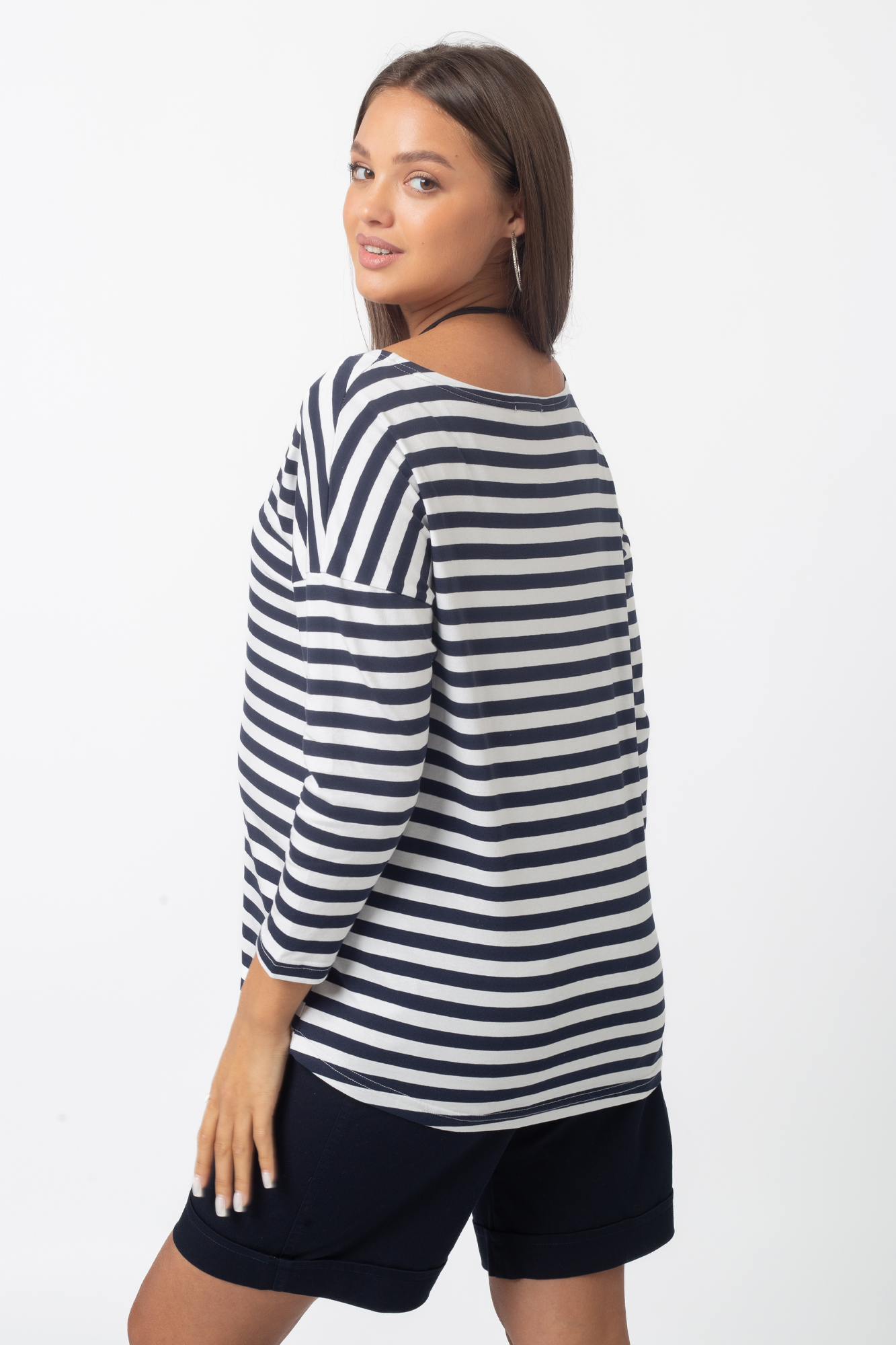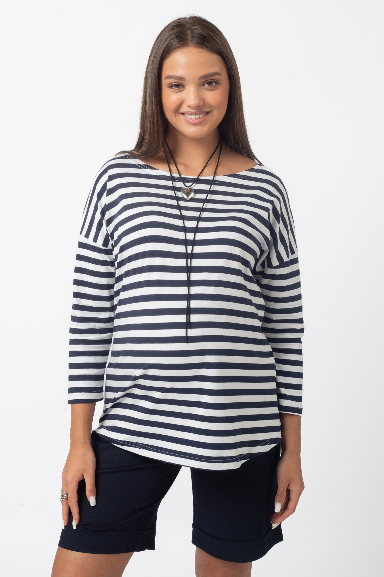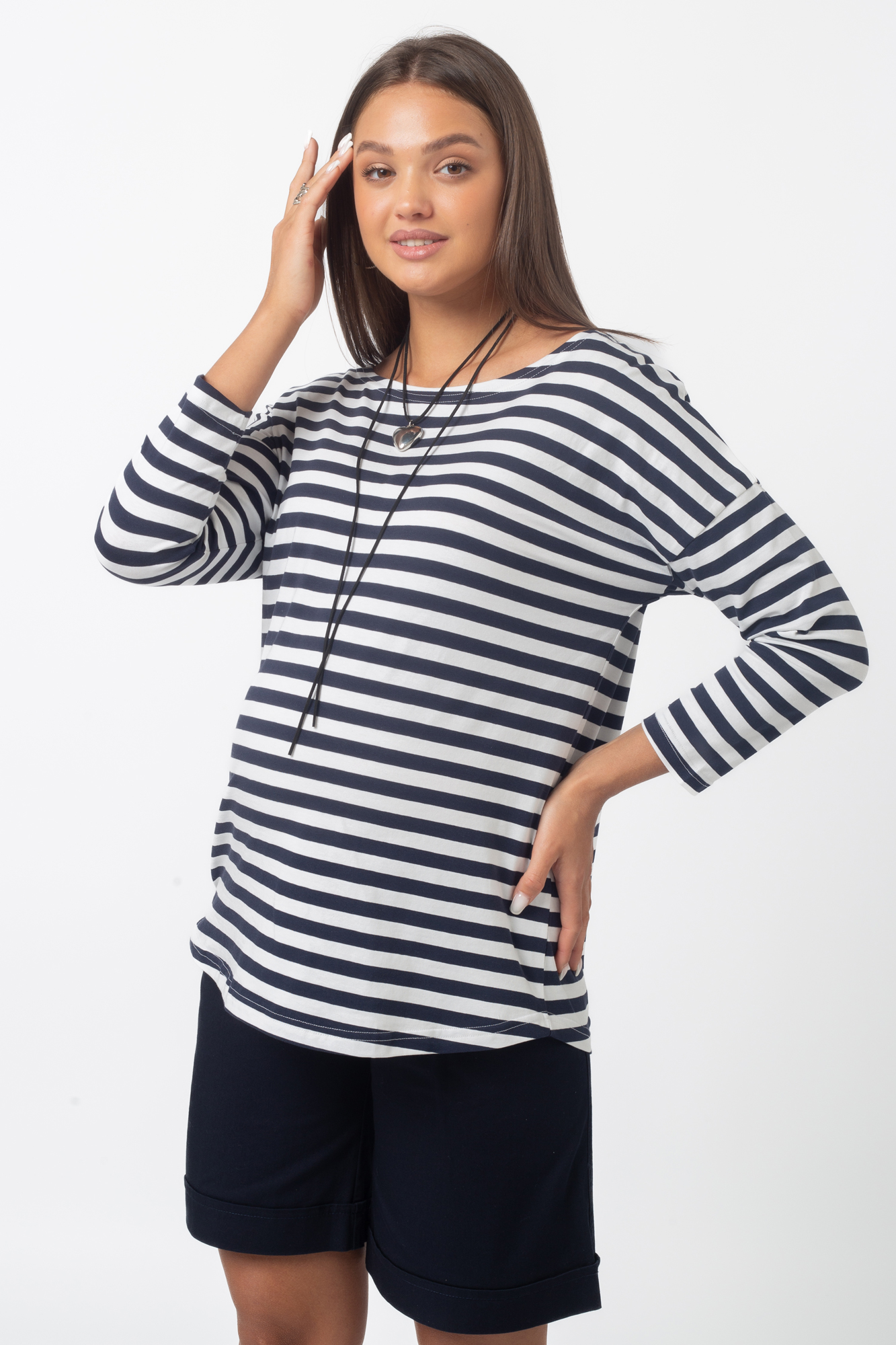 Стильный лонгслив свободного кроя для беременных. Натуральный материал подарит приятные тактильные ощущения и обеспечит комфорт будущей маме и малышу. Детали: округлый вырез горловины, удлиненная линия плеча, рукав 3/4. Великолепная посадка на всем протяжении беременности и после родов.