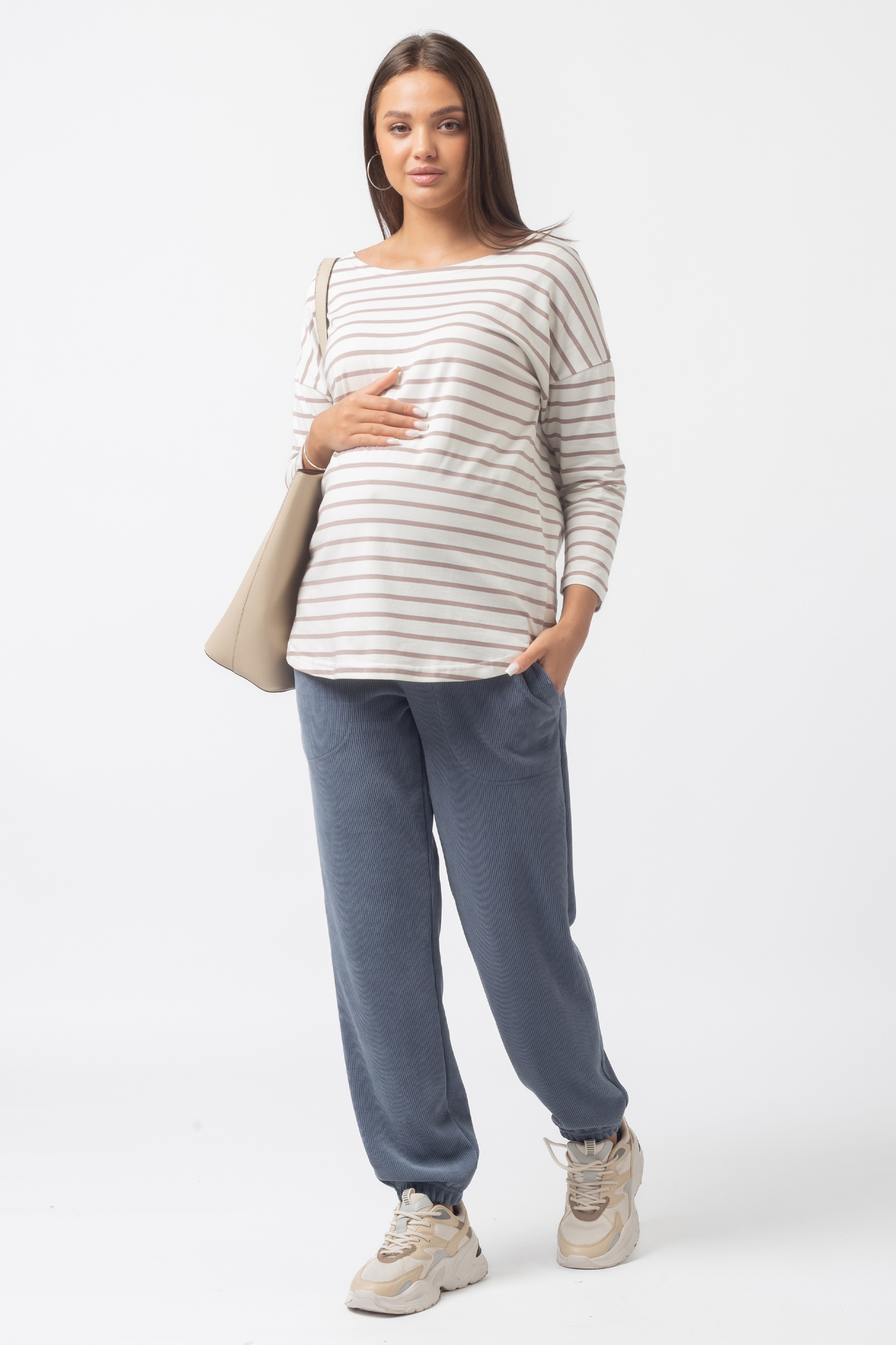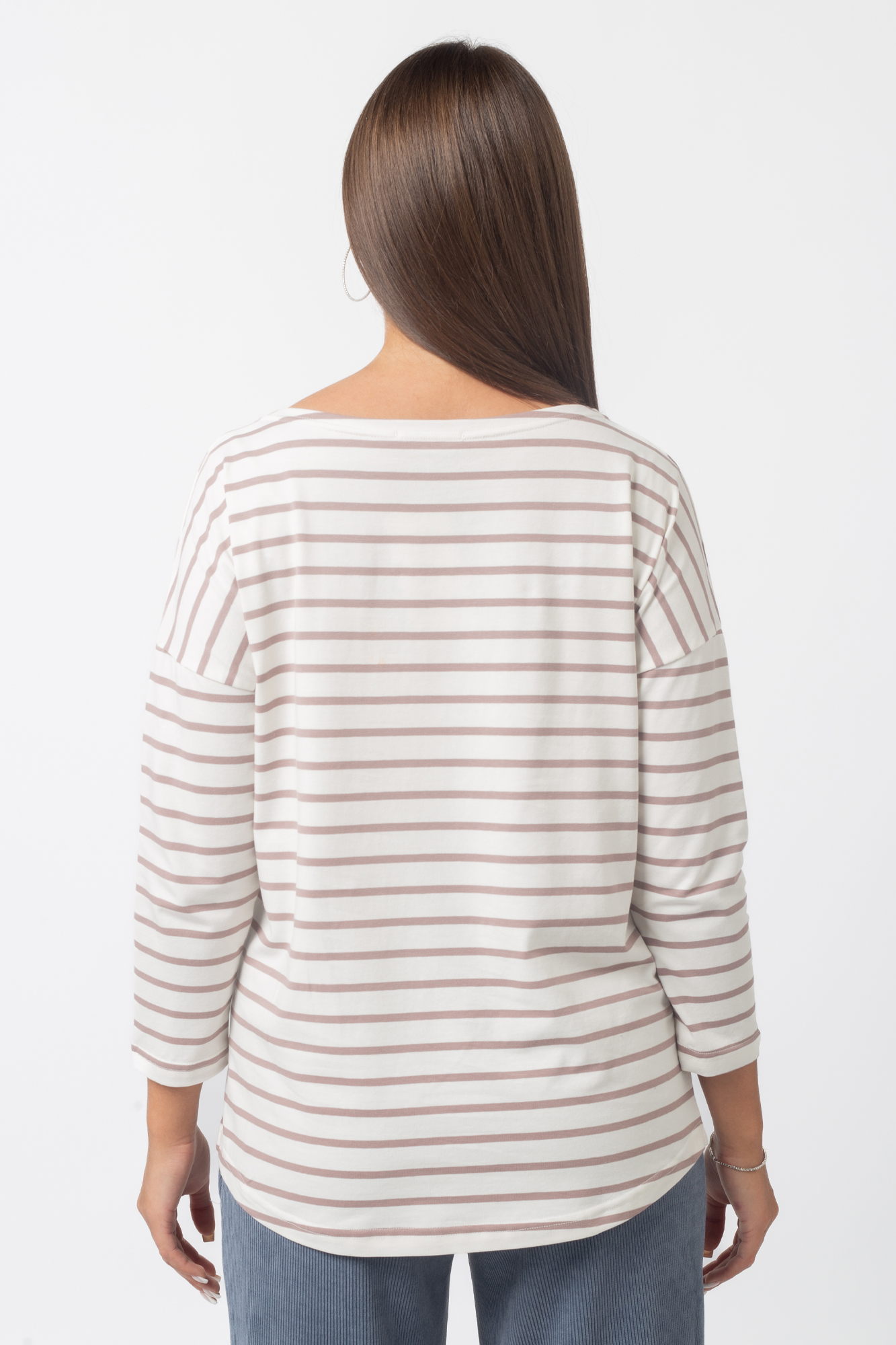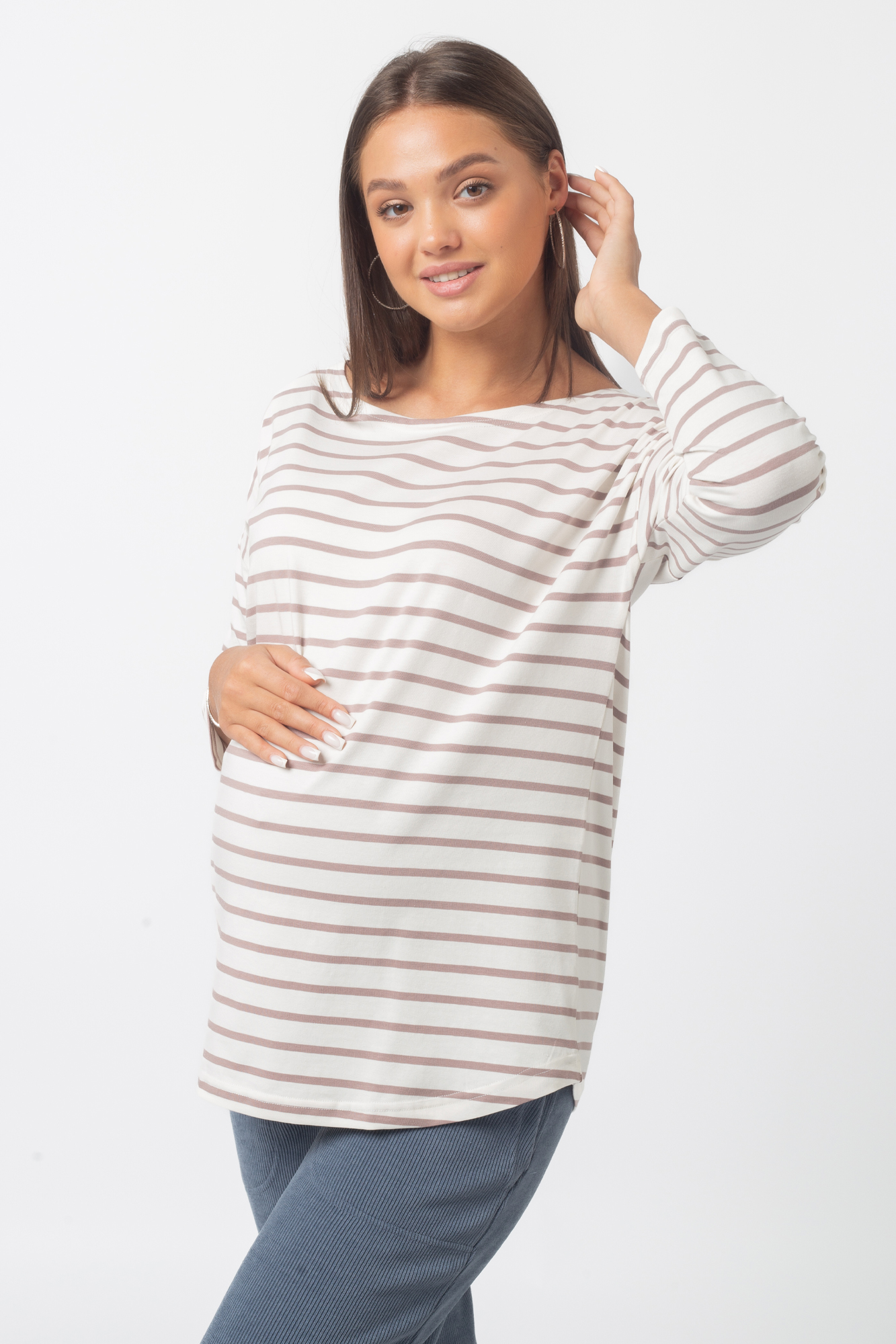 Стильный лонгслив свободного кроя для беременных. Натуральный материал подарит приятные тактильные ощущения и обеспечит комфорт будущей маме и малышу. Детали: округлый вырез горловины, удлиненная линия плеча, рукав 3/4. Великолепная посадка на всем протяжении беременности и после родов.