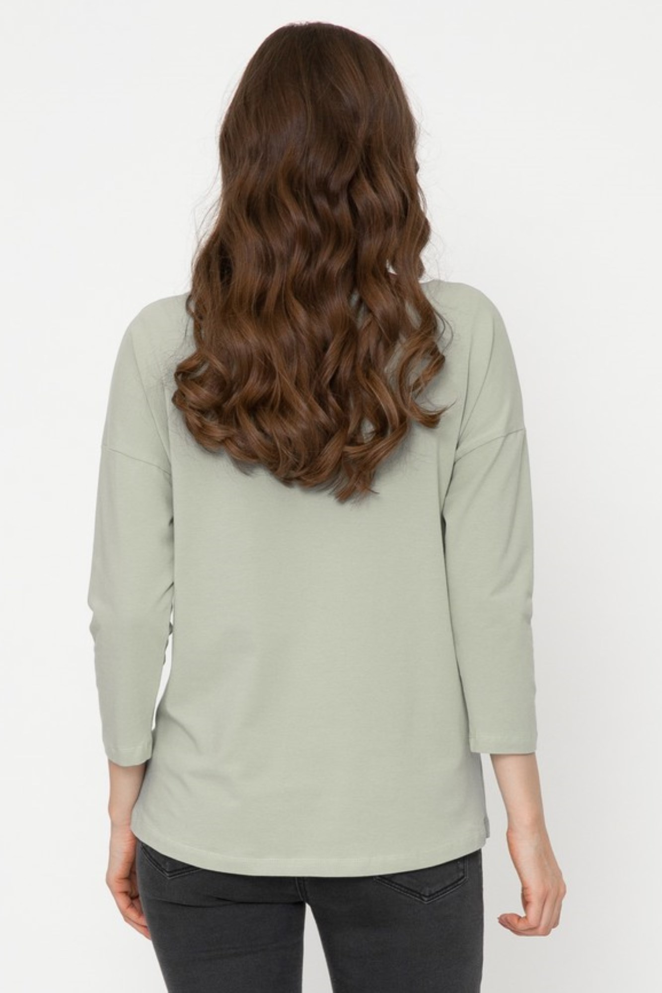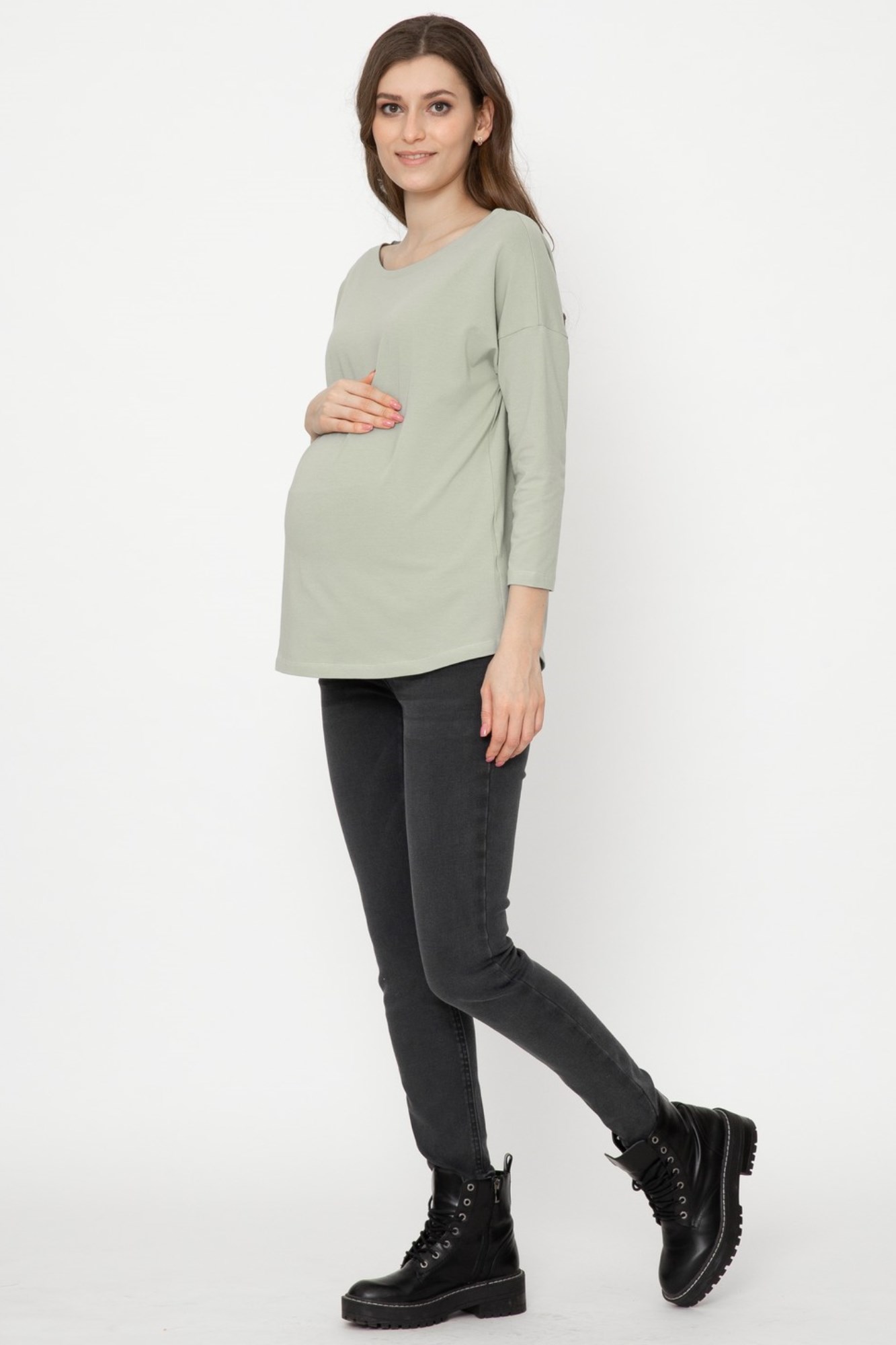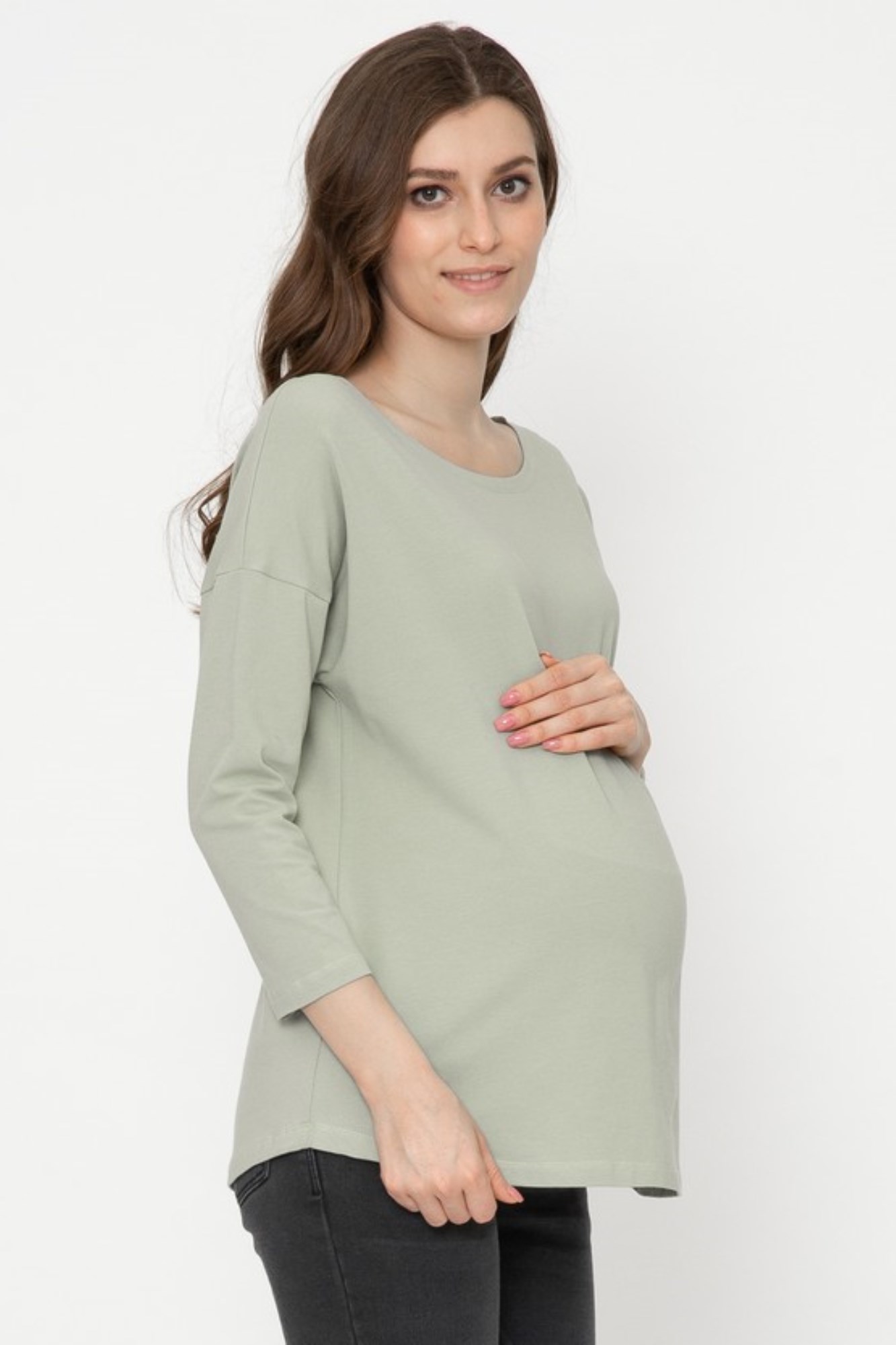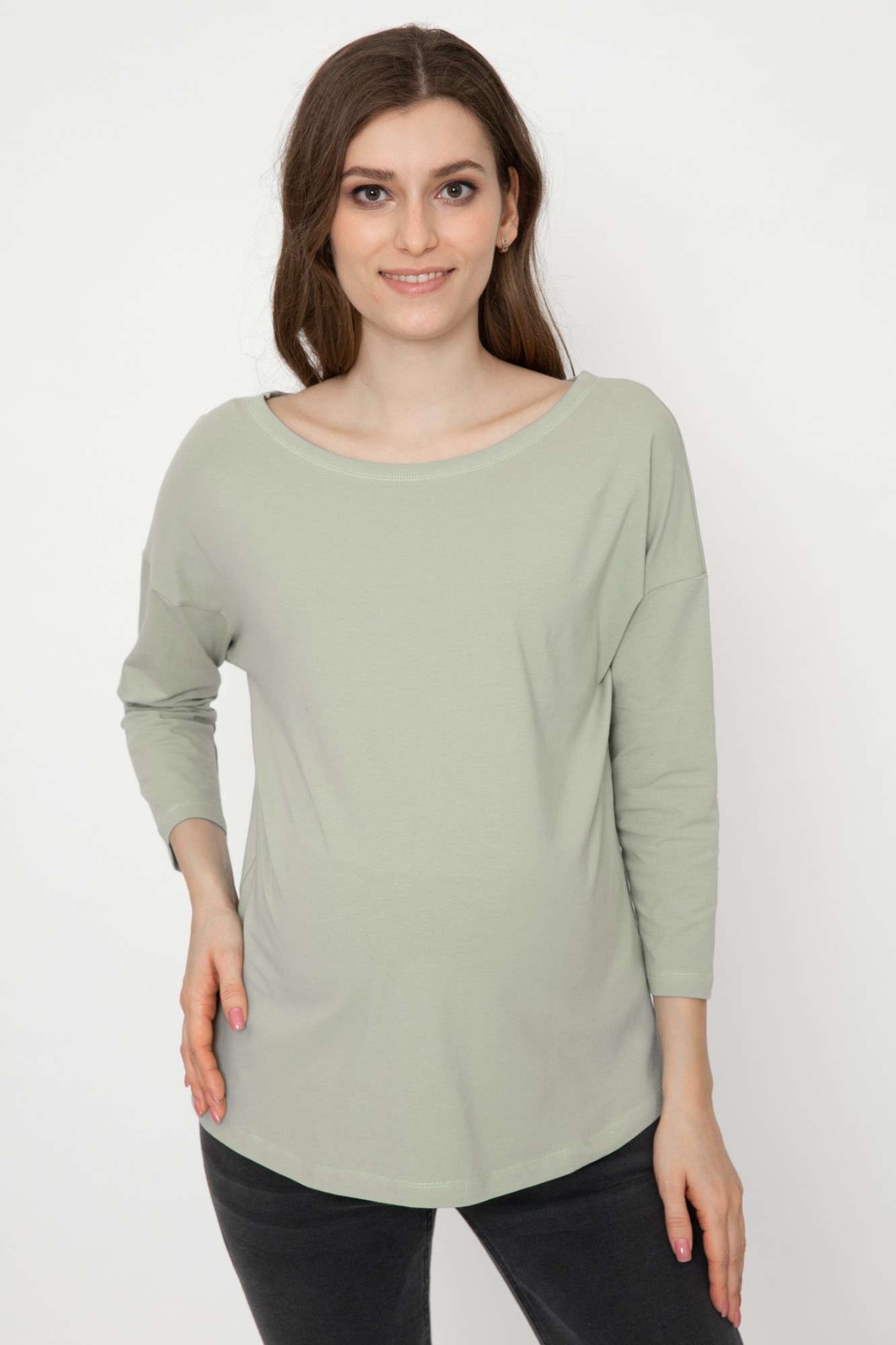 Стильный лонгслив свободного кроя для беременных. Натуральный материал подарит приятные тактильные ощущения и обеспечит комфорт будущей маме и малышу. Детали: округлый вырез горловины, удлиненная линия плеча, рукав 3/4. Великолепная посадка на всем протяжении беременности и после родов.