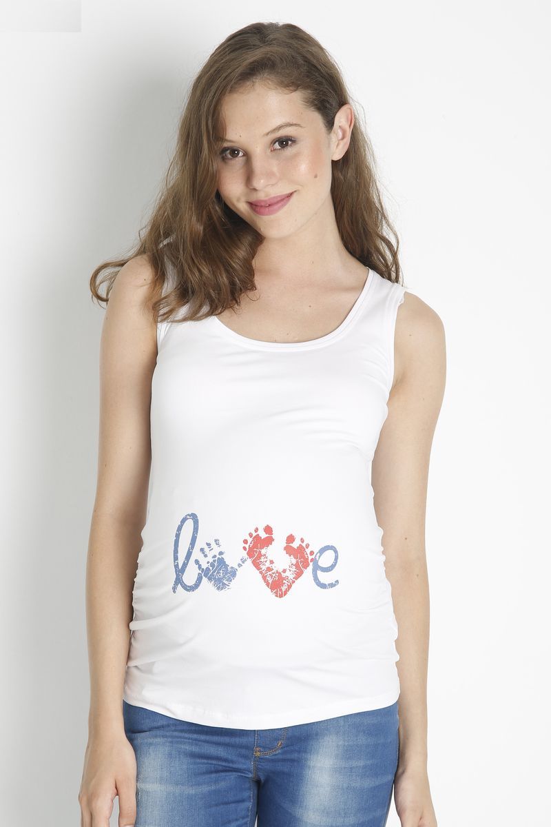 Приталенная удлиненная майка с принтом. Специальный покрой позволяет с комфортом носить ее во время беременности, а изящный рисунок украсит Ваш образ.