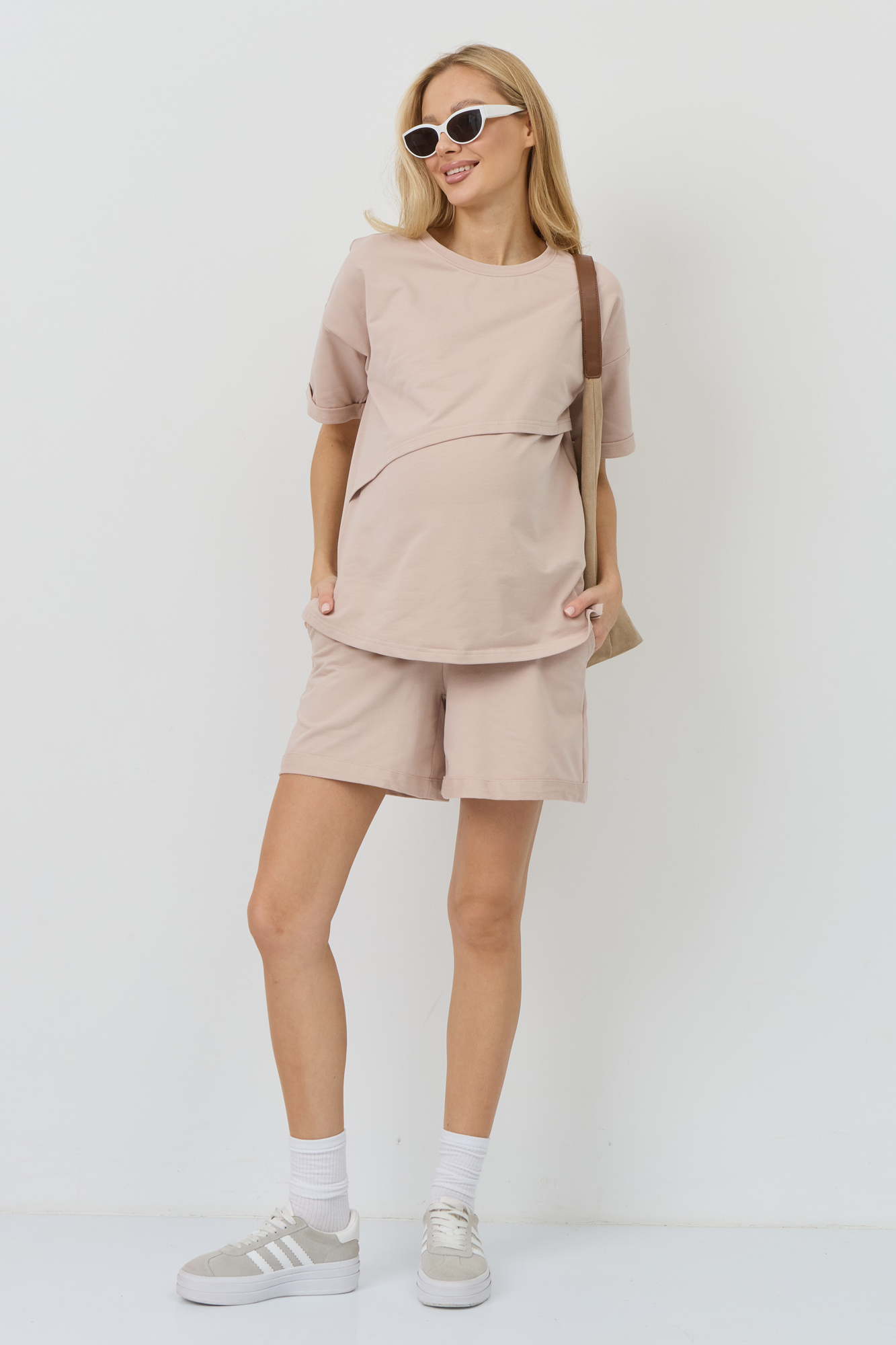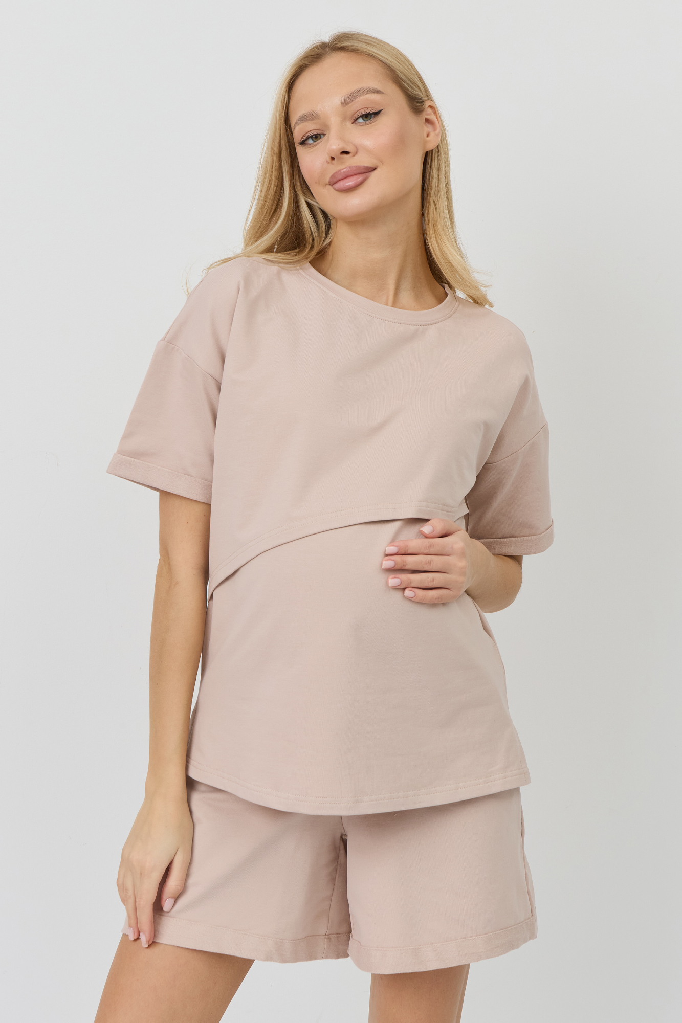 Летний костюм для беременных сшит из тонкого двухниточного футера. Ткань на основе хлопка имеет дышащую структуру, приятна на ощупь и гипоаллергенна. Футболка оверсайз со спущенной линией плеча дарит полную свободу движениям. Секрет для кормления позволяет с комфортом покормить малыша на прогулке или в гостях. Короткие широкие шорты с эластичным поясом и кулиской можно носить на любом месяце беременности и даже после родов. Стильный женский костюм подойдет для отдыха и путешествий, занятий спортом, посещений врача, а также для ношения дома. В линейке представлены нежные однотонные расцветки. Размерный ряд включает все стандартные модели.