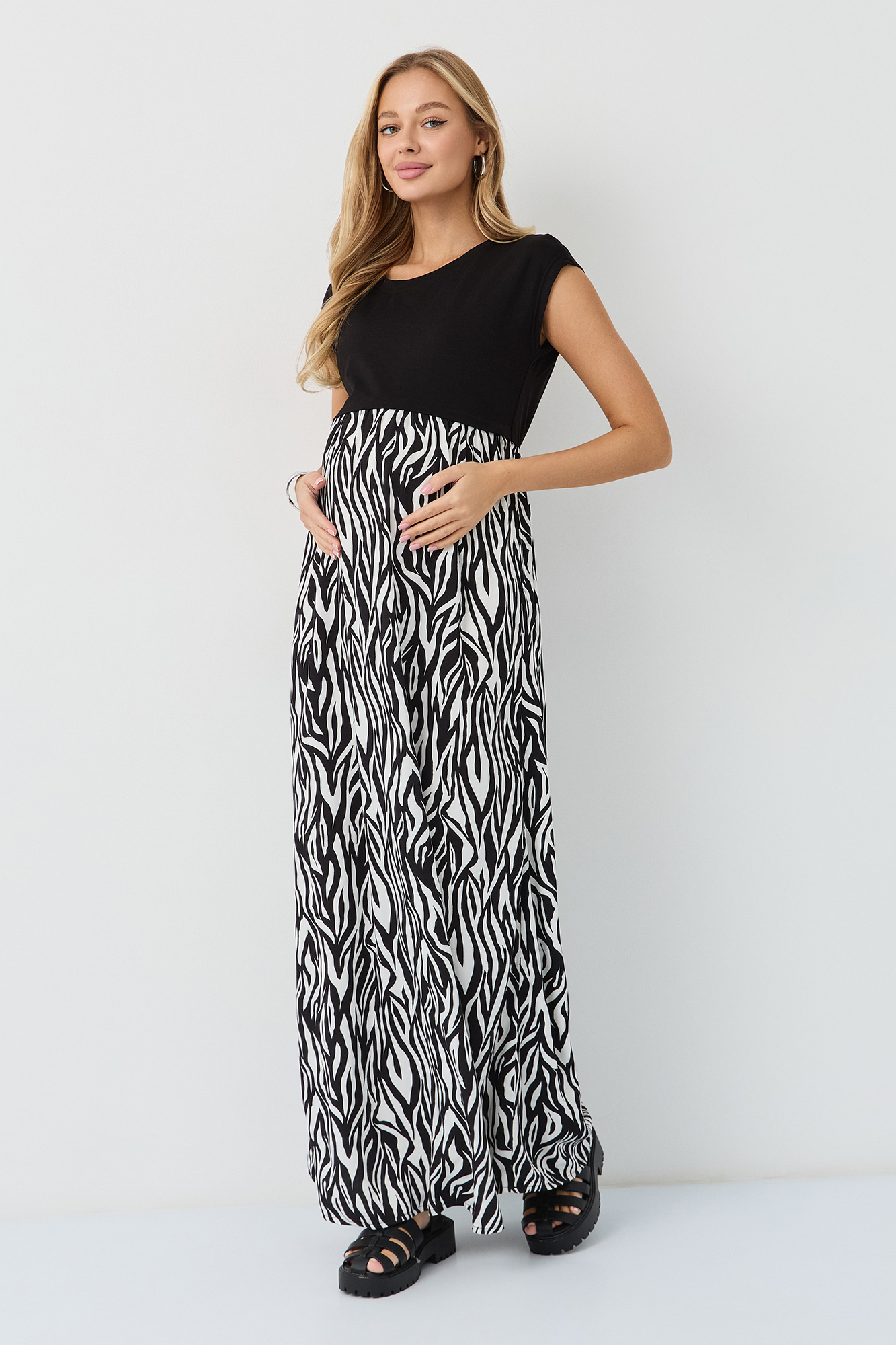 Стильное платье из комбинированных тканей для беременных и кормящих мам. Платье подходит для использования на всем протяжении беременности, а также в период грудного вскармливания. Секрет кормления – встречные потайные молнии - позволяет с комфортом покормить малыша в любой ситуации.