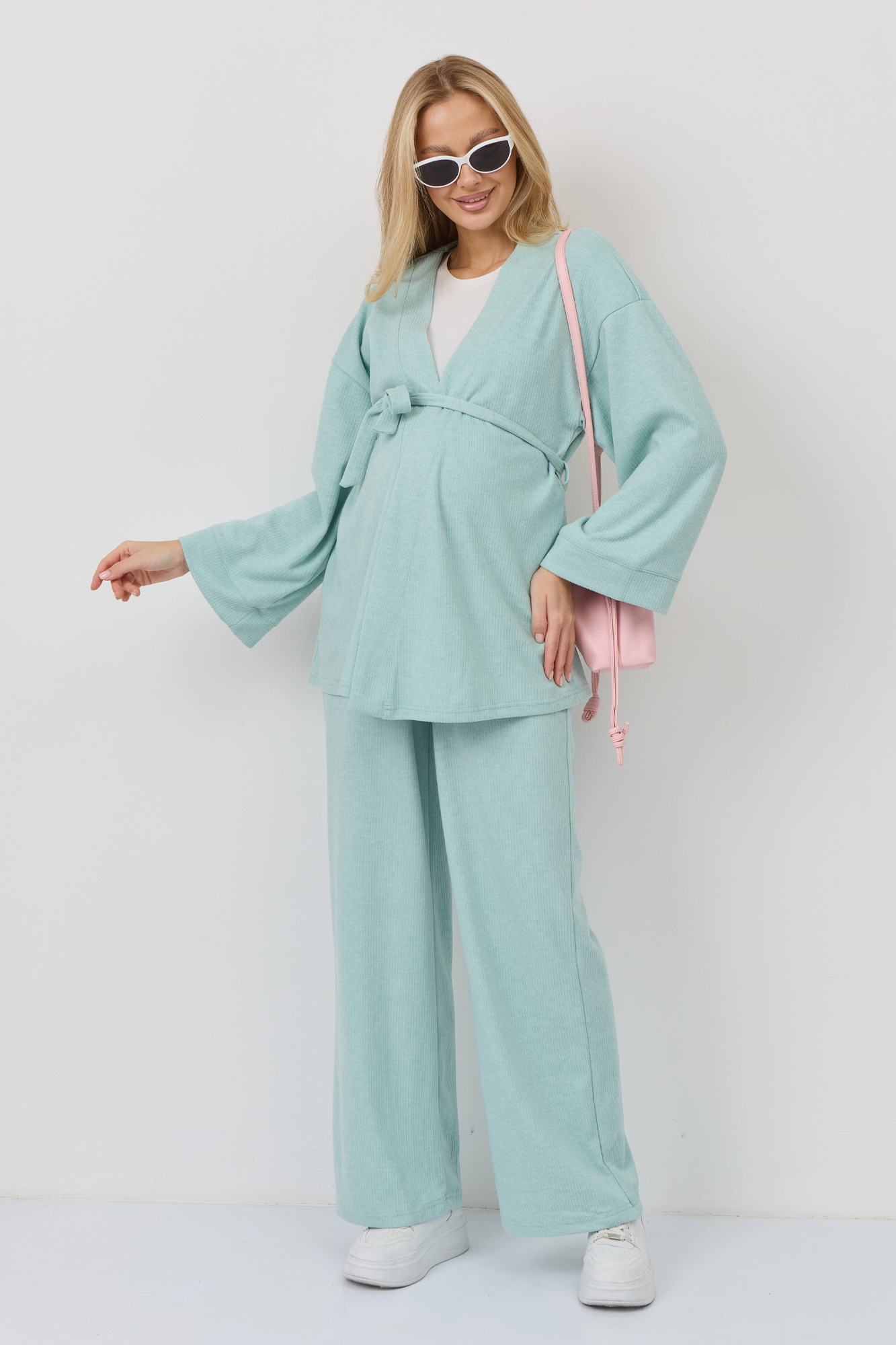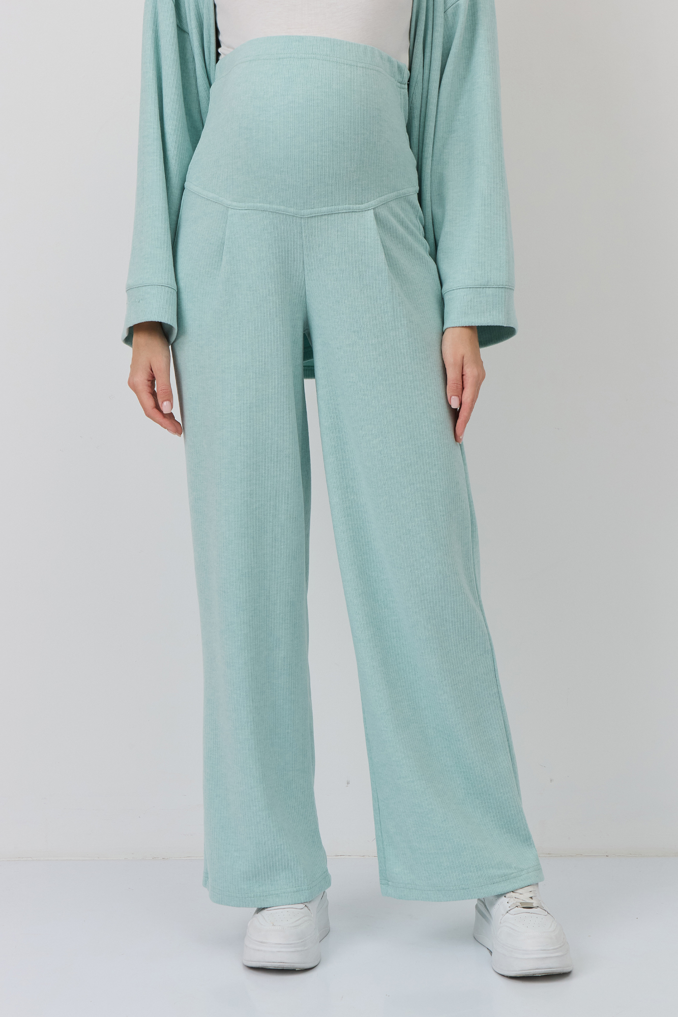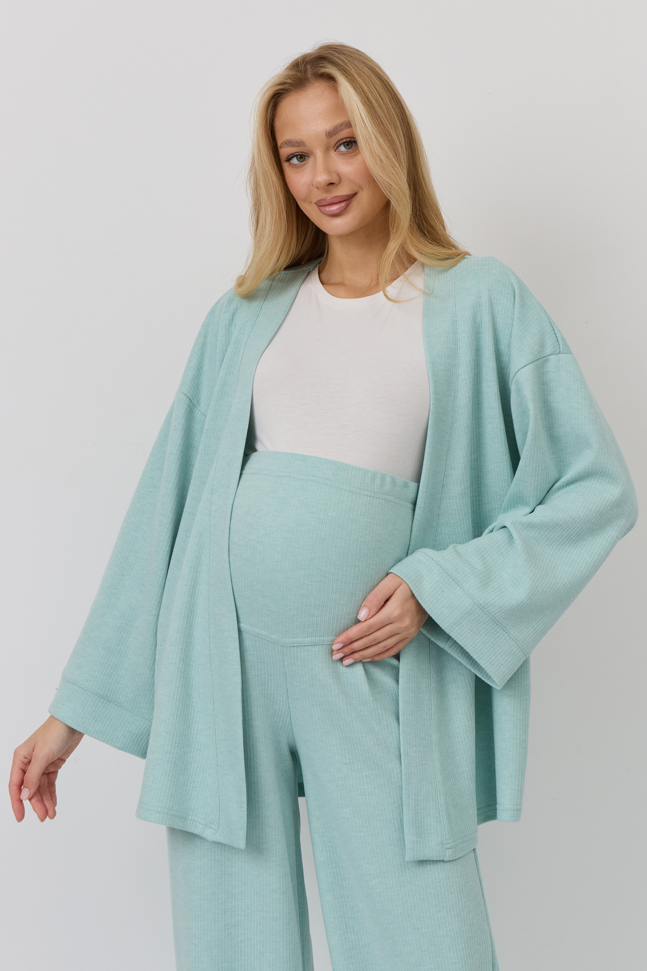 Костюм для беременных изготовлен из качественного мягкого трикотажа в рубчик. Фактурная трикотажная ткань с эффектом вельвета приятна на ощупь и гипоаллергенна. Женский брючный костюм - отличный выбор для повседневного образа. В комплект для будущих мам входят кардиган на запах и штаны. К кимоно предусмотрен пояс. Щирокие штаны оверсайз, прямого кроя, с высоким эластичным поясом, который выполняет роль бандажа. Модель рассчитана на весь период беременности: обхват регулируется за счет пуговицы на резинке. Брючный летний костюм для беременных подойдет для прогулок, офиса или носки дома. Стильный костюм двойка - незаменимая одежда для беременных в любое время года. Трикотажный однотонный костюм подходит девушкам и женщинам больших размеров плюз сайз. Состав: 65% Вискоза, 30% Полиэстер, 5% Лайкра. Костюм для беременных - отличный выбор для будущих мам на весну.